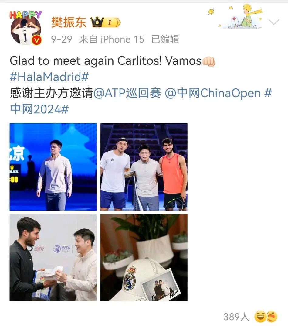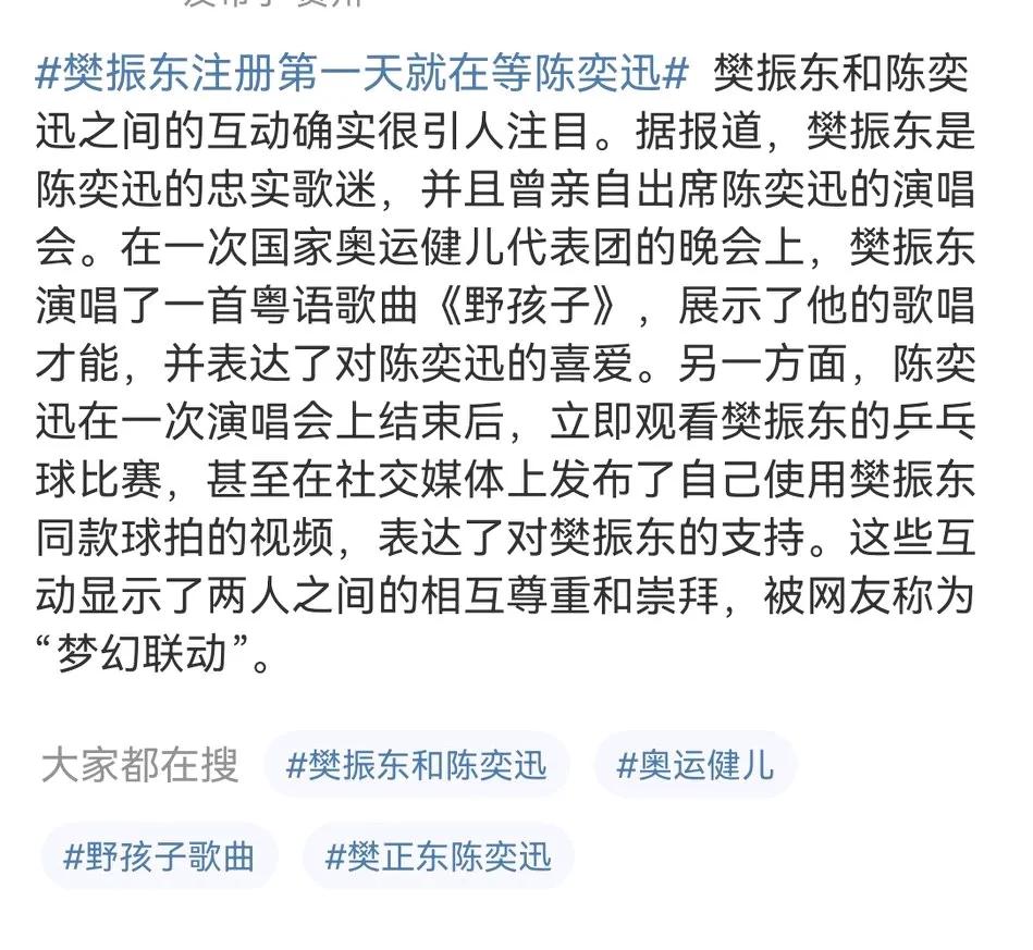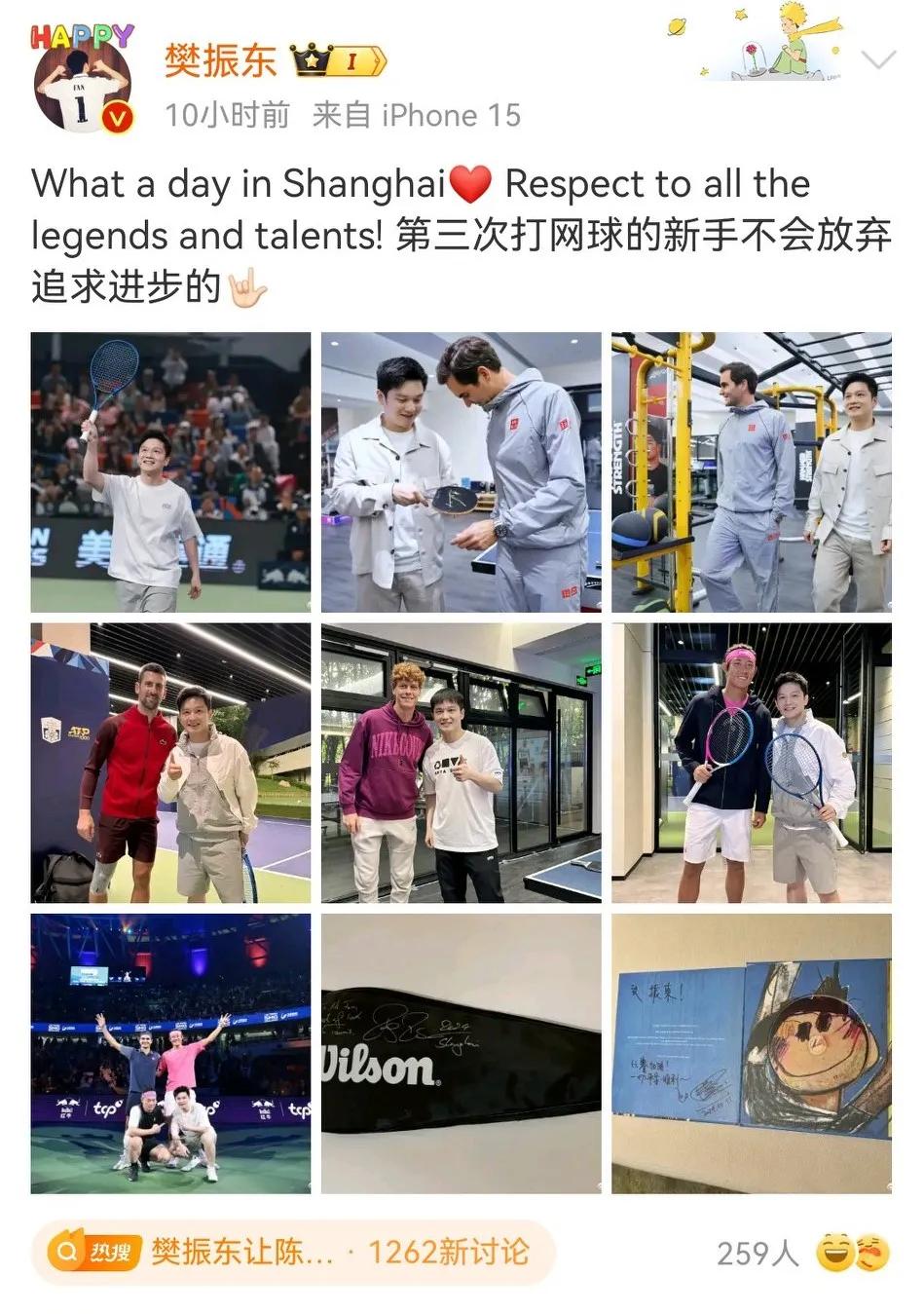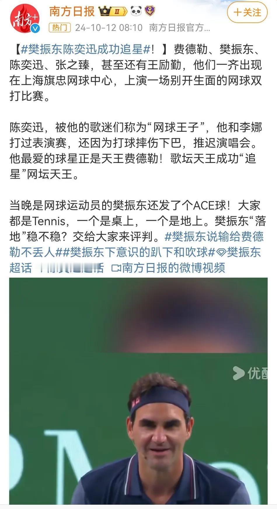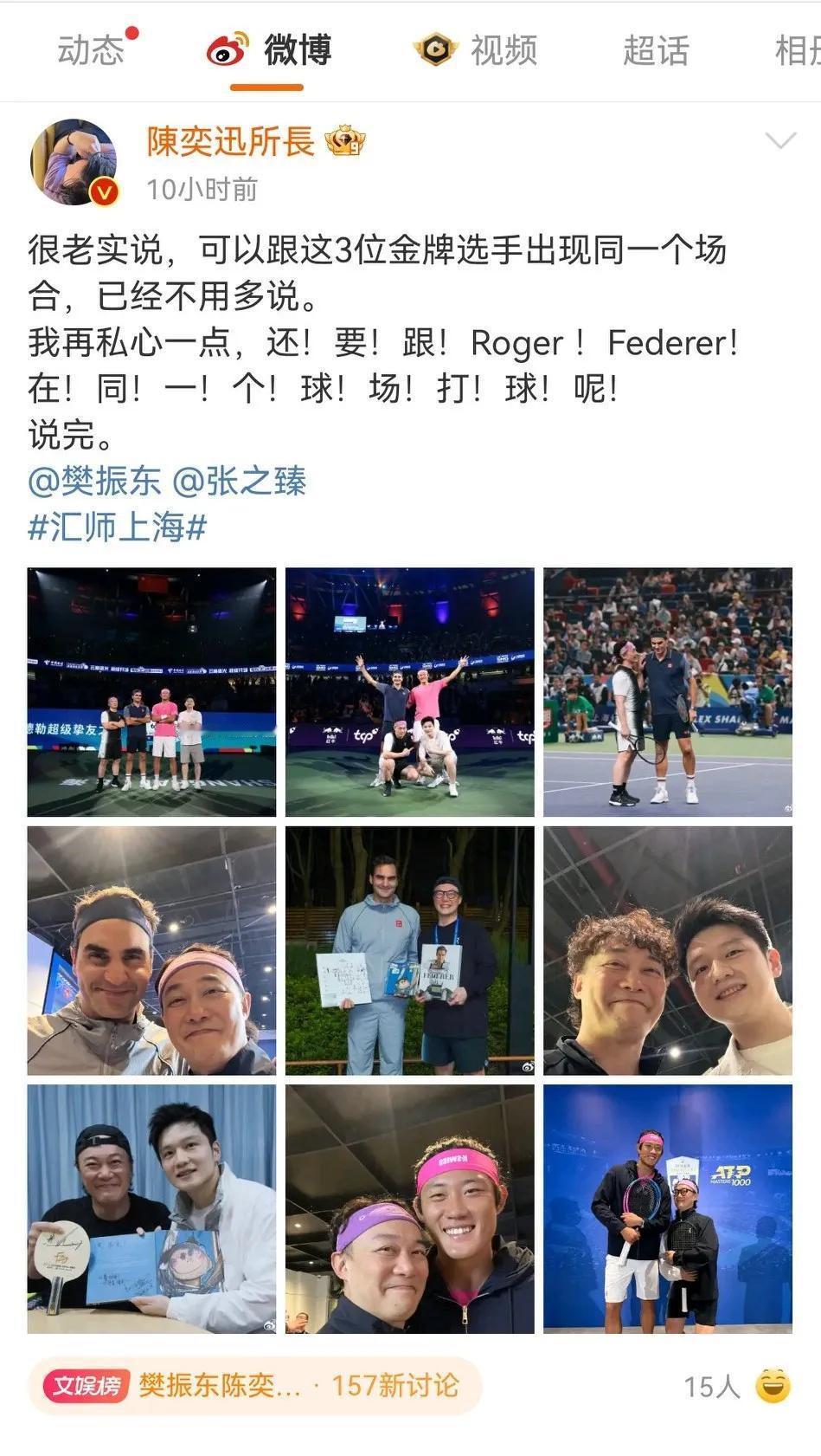 有一说一,小胖樊振东这波梦幻联动真的好绝! 追个星都追到网球表演赛了,跟陈奕迅、费德勒对打,输赢不重要,重要得开心啊。 合影,互相交流都是基本操作了,还有互送礼物,简直太让人羡慕了! 而且小胖真的是值得尊重的以为运动员,奥运会他去深夜食堂,瑞典对手就说过他很有意思,这次费德勒也是喜欢他的吧? 他们这样在各自领域发光,同时也希望不断拓展边界的人,绝对是正能量! 陈奕迅网球打到樊振东肚子了随手记录秋日生活