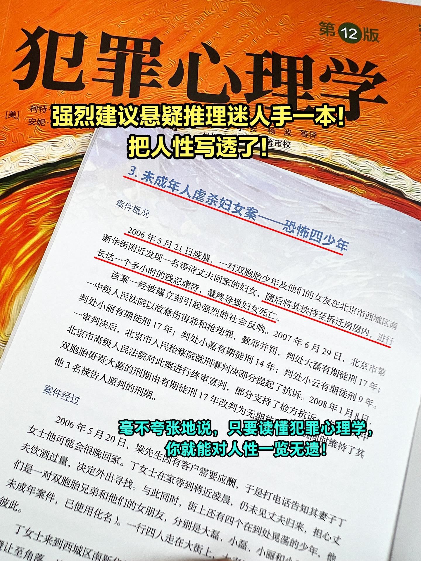 一本犯罪心理学经典著作——《犯罪心理学》,读完真的让人大开眼界!该书由该领域的领军人物柯特巴托尔撰写,经历740年的打磨和12次修订,由新中国成立以来首位犯罪心理学博士,中国政法大学教授翻译而成。这里面涵盖了各种复杂怪异又令人费解的犯罪行为,它从心理学的视角出发,深入剖析了犯罪的成因、心理机制、预防和矫正。更重要的是它对普通人来说意义非凡,学习犯罪心理学可以让我们了解自己和他人的行为动机,端正自己,更能保护自己和家人,远离犯罪伤害。希望每一位家长和刚出社会的小白,都能抽时间读一读看一看!犯罪心理学人性