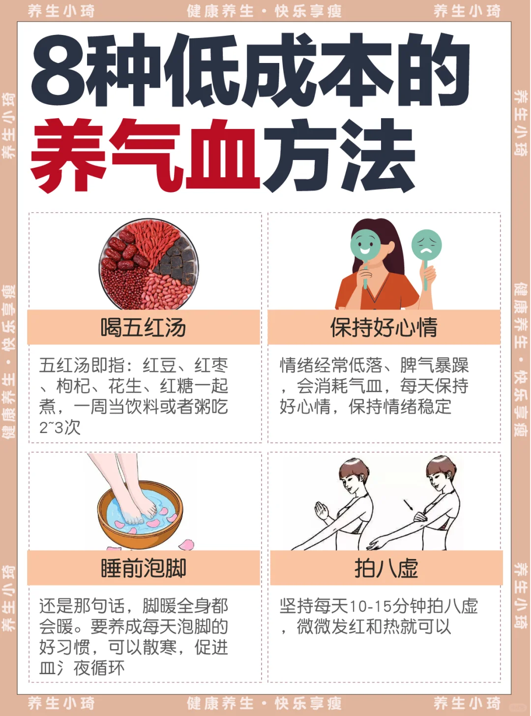 很多宝子经常都特别累,怎么睡都不够 脸色白白没光泽,嘴唇也淡淡的 手脚老是冰凉,每个月的量还不多 这可能告诉你,气血不足 - 如果觉得自己有这些情况,赶紧收藏这几个低成本的方法!! [一R]不留长发、长指甲 [二R]每顿7分饱 [三R]睡觉穿袜子 [四R]少吃冰冷食物/饮料 [五R]喝五红汤 [六R]保持好心情 [七R]睡前泡脚 [八R]每天拍八虚