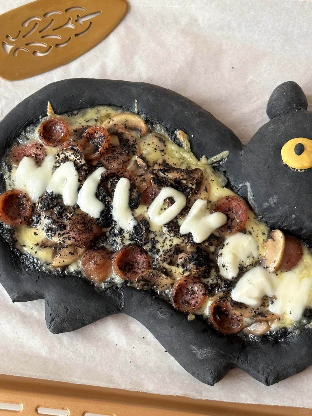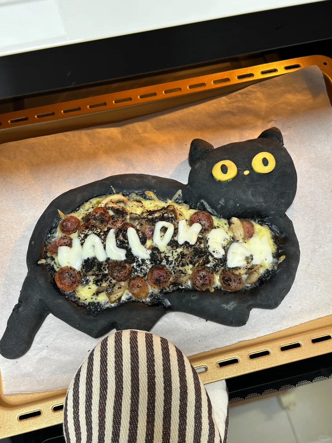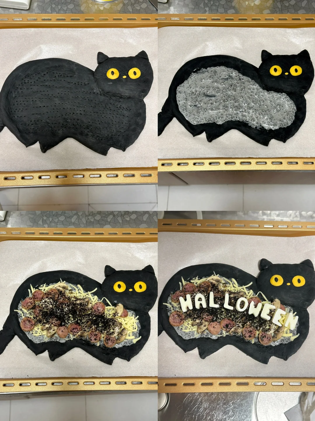 ④制作出猫咪的样子,铺上黑松露酱,马苏里拉芝士碎,炒熟的火腿蘑菇,擦一些黑松露屑,新鲜马苏里拉芝士球刻出Halloween字样~