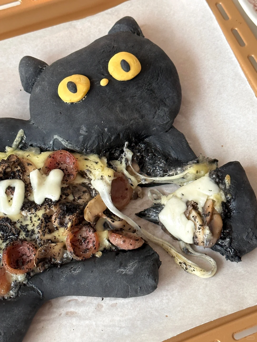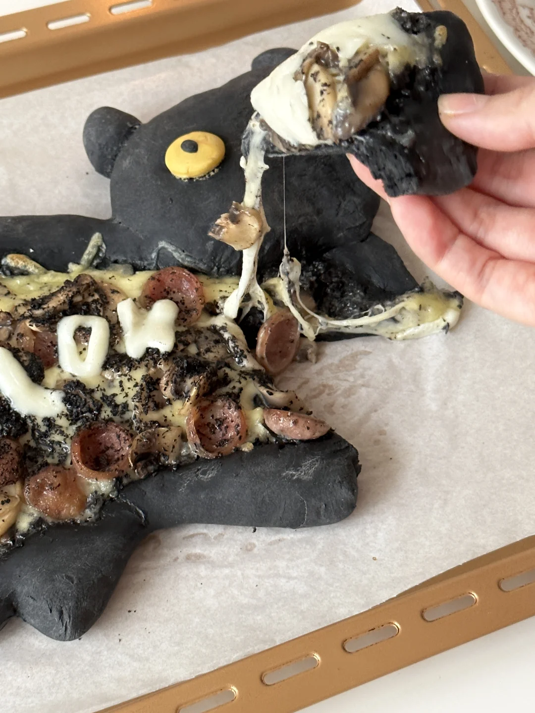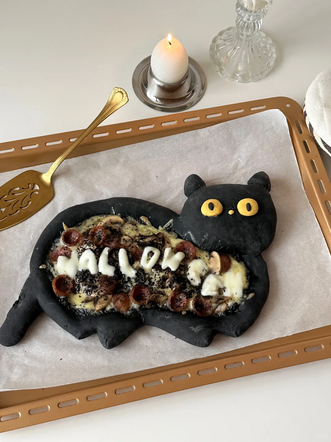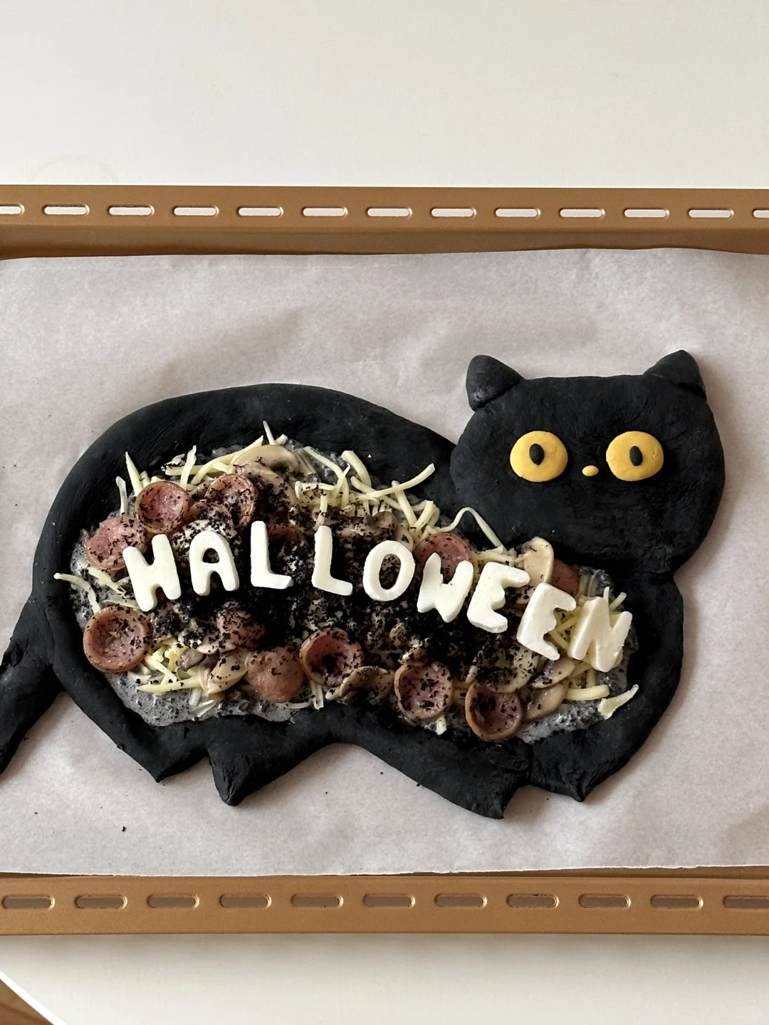 ④制作出猫咪的样子,铺上黑松露酱,马苏里拉芝士碎,炒熟的火腿蘑菇,擦一些黑松露屑,新鲜马苏里拉芝士球刻出Halloween字样~