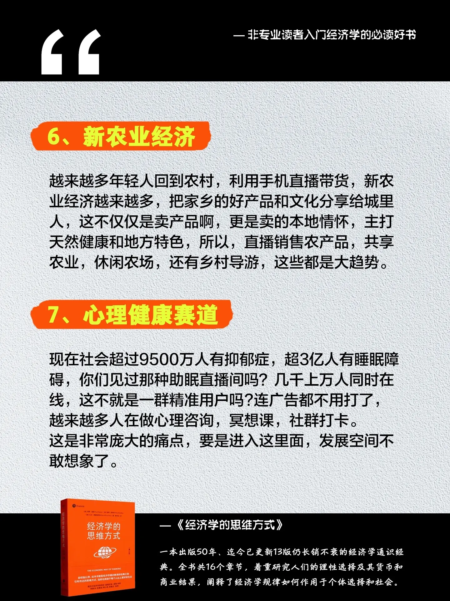 2025风口已经很明显你发现了吗?踩着风口,猪都能上天,何况我们呢!创业和职业发展的过程中,我们也需要敏锐地捕捉行业风口把握时代脉搏。 这本人人都能读懂的《经济学的思维方式》,让你搞懂经济学现象和常识,快速拥有经济学的思维方式,看清经济运行的底层逻辑,摆脱穷人思维,从而能够像经济学家一样思考问题,原来懂点经济学知识,真的可以过上更好的生活。
