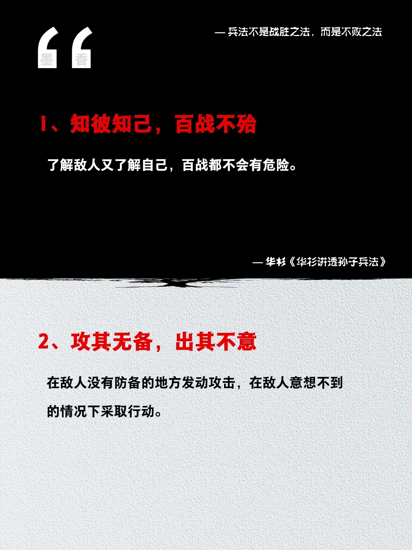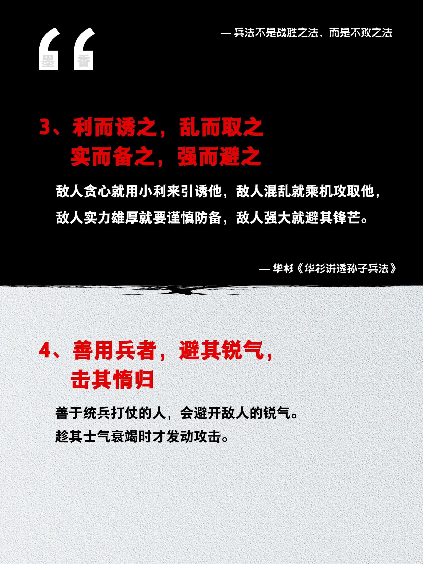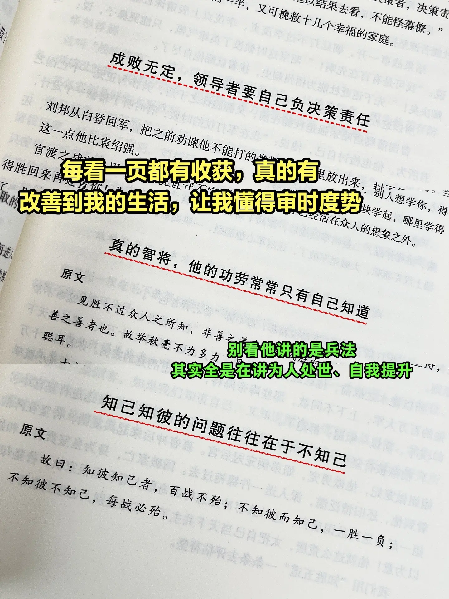 为人处事的能力从来不是天生具有的,是需要后天修炼的!《华杉讲透孙子兵法》这本书真的把《孙子兵法》解析的太透彻了!贴近生活,通俗易懂,无论是做生意、混职场还是处理人际关系,都能用的上!这本书暗藏了高启强的上位、管理之道,是值得每一个人都领略的传统大智慧。它可以提高你的思考能力,懂一点用人之道、商业管理、改善人际关系。 人不在于如何获胜,而在于确保一生不败!原来,与启强的距离,只差一本能读懂的孙子兵法!读书好书分享孙子兵法国学智慧国学文化