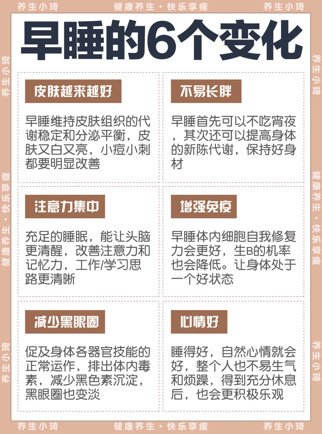 [私信R]如果觉得最近做什么都提不起精神,脸色黄黄,记忆力也变差,真的可以试试每天都早睡1小时 [清单R]人的能量和精神状态有很大关系,而当你开始早睡,身体得到充分休息,精神状态也会变得饱满和充沛。 [向右R]坚持早睡,皮肤会变好哟,又白又亮,头发多多,情绪也会更稳定。 [向右R]坚持早睡,身体免疫会变好,黑眼圈也没了。整个人的精气神都回来了。 早睡真的可以解决90%的问题。保证每天有充足的睡眠,你会发现,你的能量真的会变得越来越好哟