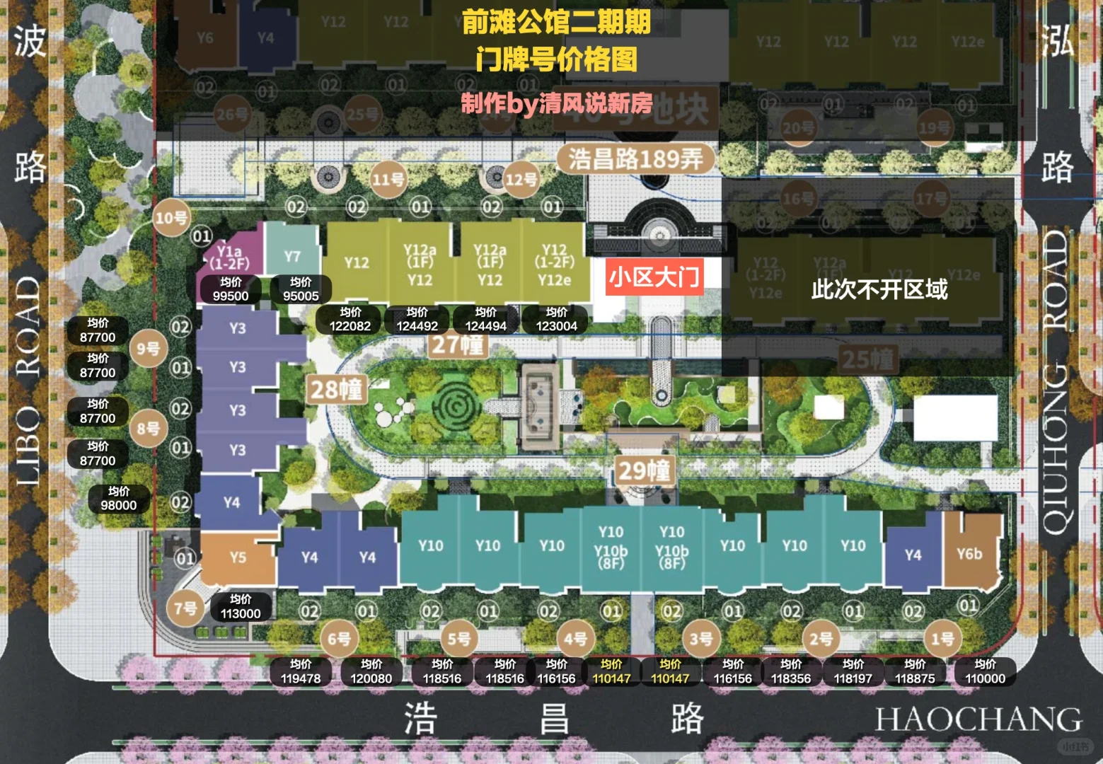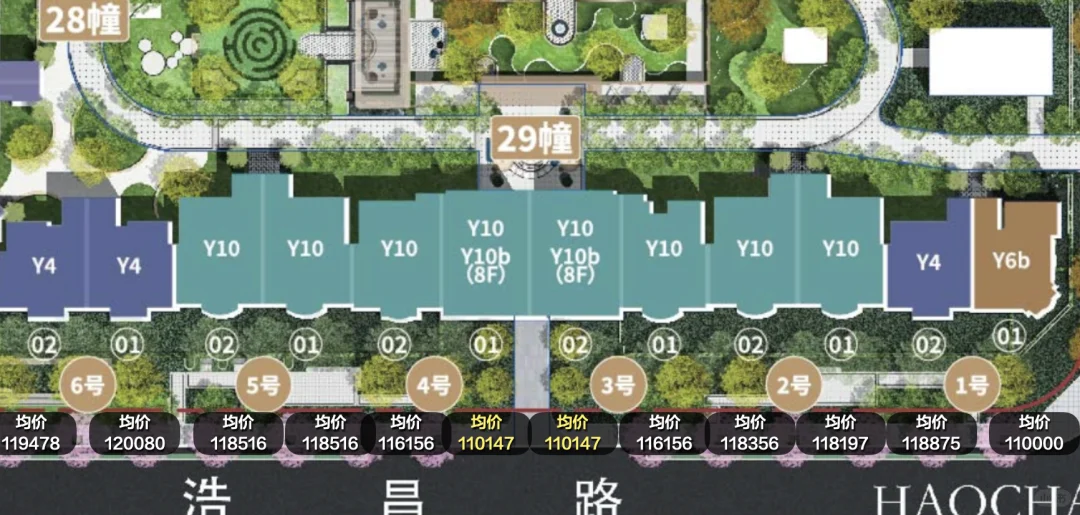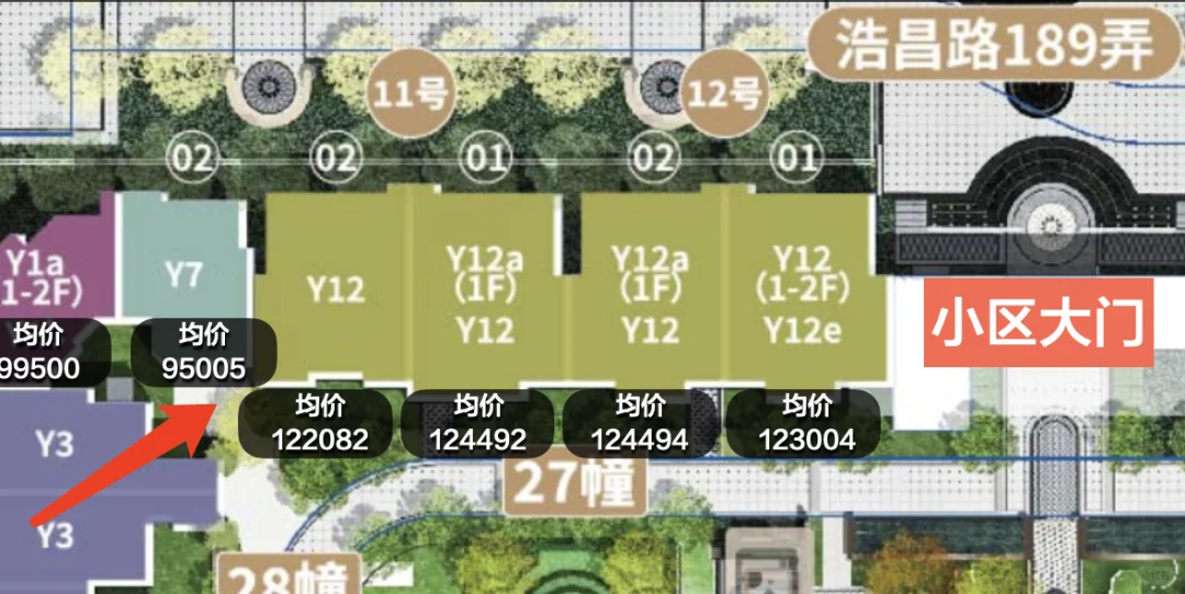 图6,南侧的Y10几乎完全没有不利因素。可以看到我标黄了2个价格,远低于旁边,主要是因为楼下有2层的架空,所以这一侧的价格性价比直接拉满。