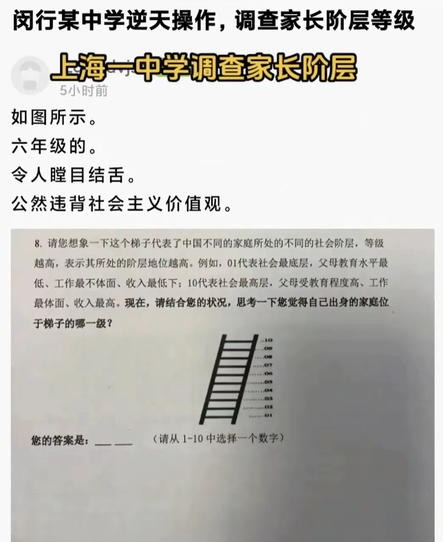 上海闵行区某中学问卷调查的事,真的猝不及防,通报结果也是让人意犹未尽! 1、大家最痛恨的人分“三六九等”,他竟分了十等! 2、分层标准是受教育程度,工作体不体面,收入的高低,跟人的素质和品德无关。 3、这份调查问卷是发给六年级学生的,才12岁。 4、12岁,也许知道父母的学历,但很少有知道父母收入的,至于工作体不体面,根本没有概念。 5、孩子们也许会去问自己的父母,那父母应该怎么回答呢?如果真是他所谓的底层,父母又该怎么面对孩子的问题? 6、孩子们按照自己的理解,勾选了所谓的阶层之后,对比起周边的同学,阶层高的或者阶层低的,会产生怎样的心理感受呢? 7、通报里说了是实习生擅自的行为,解除实习。一个实习生他干这个事是什么目的呢? 8、问卷调查的根源来自哪里,调查的真实目的是什么,这才是最关键的。