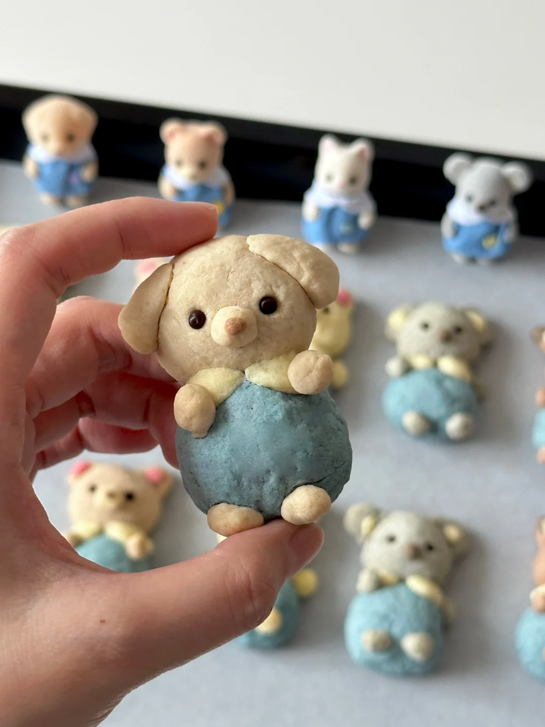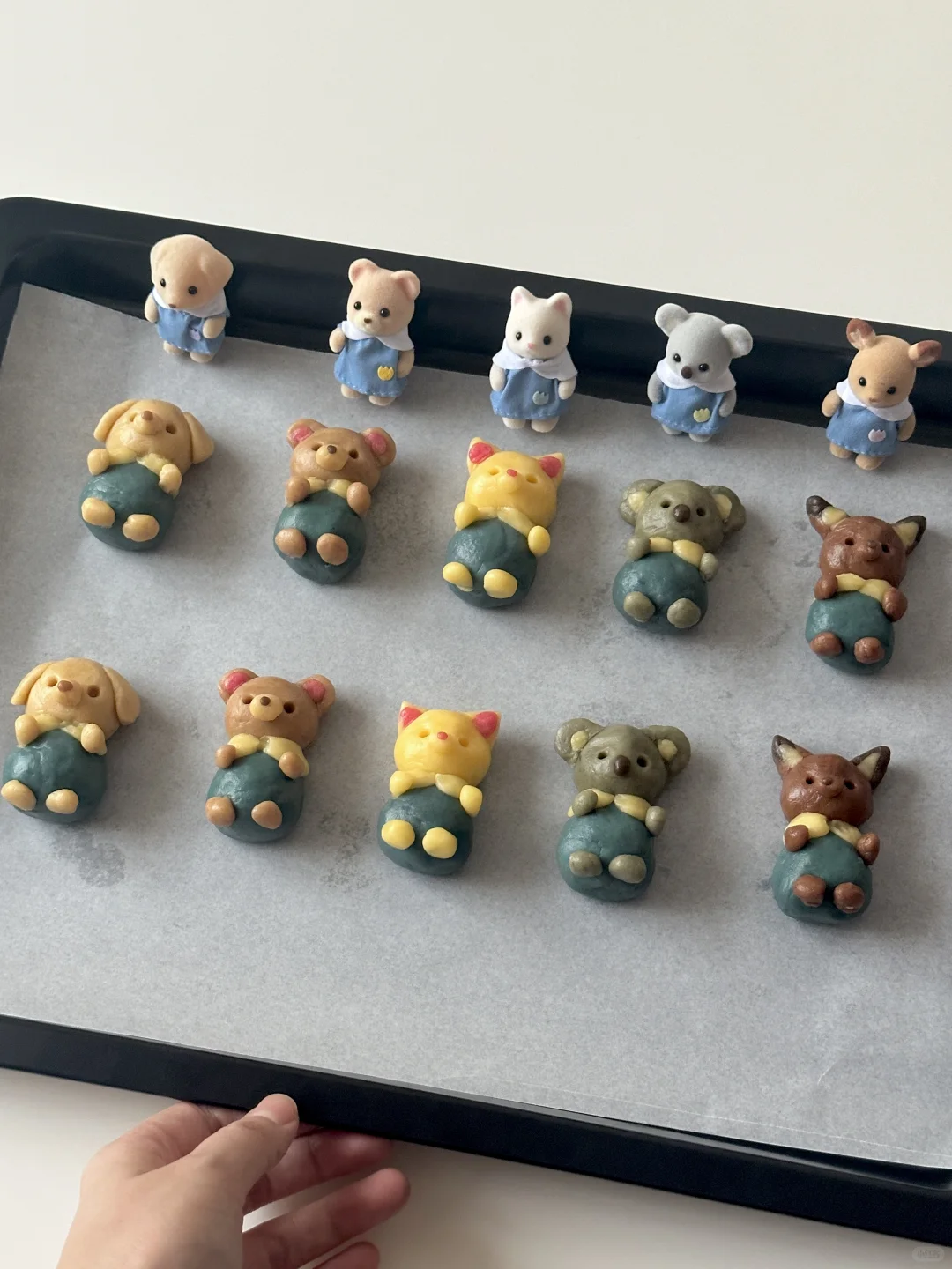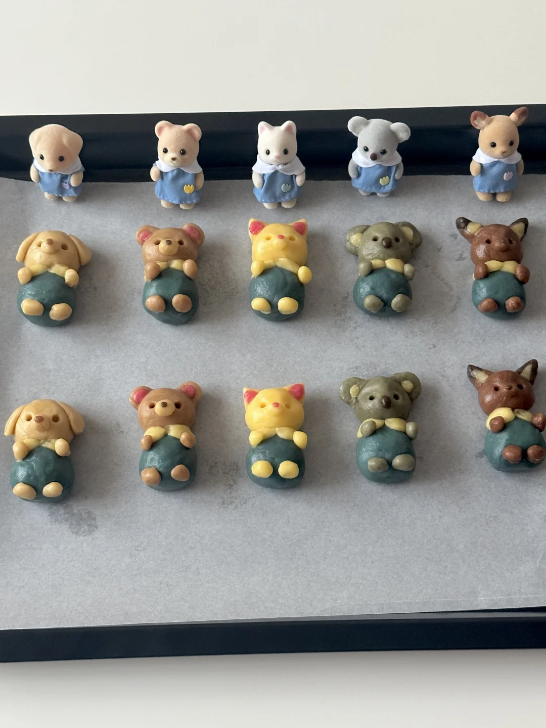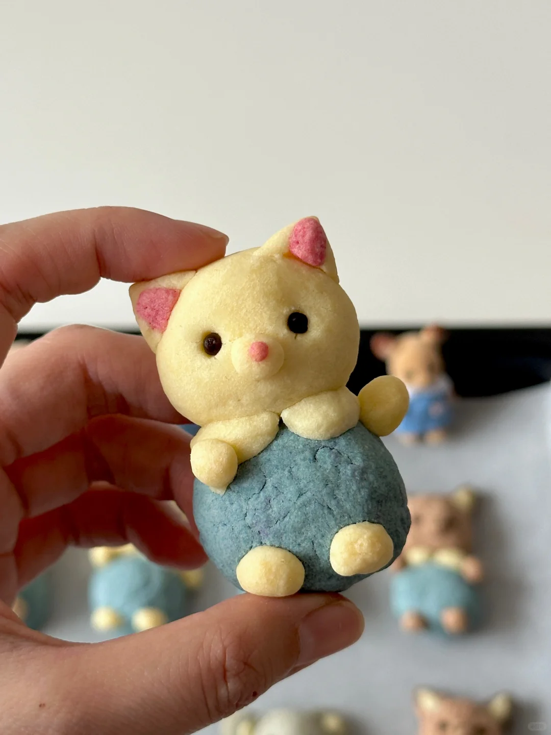 捏了一盘子小可爱(❁´ω`❁) 所需材料:(可制作两盘) 黄油140g,全蛋液50g,低筋面粉250g,细砂 糖50g,可可粉,仙人掌果粉,蓝色色素 制作步骤: ①室温软化黄油,加入细砂糖(或糖粉),打蛋机搅打蓬松 ②常温鸡蛋液分三次加入,继续搅打至完全混合 ③筛入低筋面粉,揉匀,盖保鲜膜冰箱冷藏20分钟左右 ④面团上色 ⑤按照头12g,身体15g的量捏出造型 ⑥捏好后冰箱冷冻十分钟 ⑦烤箱提前预热175°,放入饼干烘烤15-20分钟左右 ⑥出炉后晾凉,用巧克力画出眼睛
