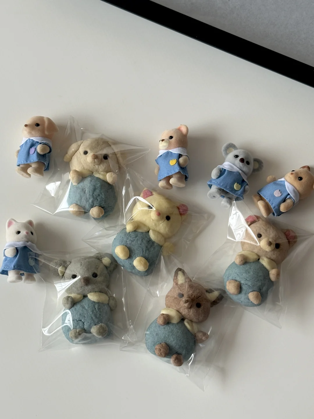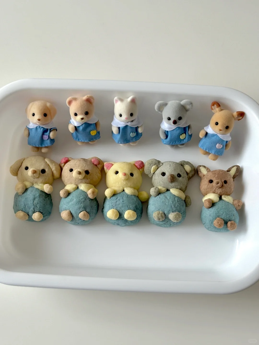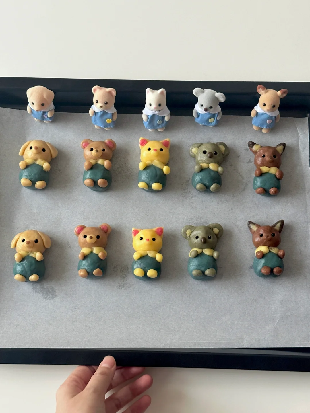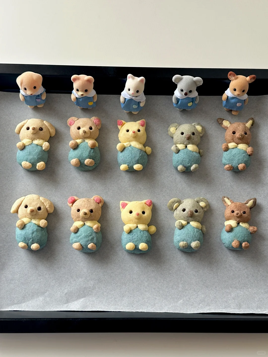 捏了一盘子小可爱(❁´ω`❁) 所需材料:(可制作两盘) 黄油140g,全蛋液50g,低筋面粉250g,细砂 糖50g,可可粉,仙人掌果粉,蓝色色素 制作步骤: ①室温软化黄油,加入细砂糖(或糖粉),打蛋机搅打蓬松 ②常温鸡蛋液分三次加入,继续搅打至完全混合 ③筛入低筋面粉,揉匀,盖保鲜膜冰箱冷藏20分钟左右 ④面团上色 ⑤按照头12g,身体15g的量捏出造型 ⑥捏好后冰箱冷冻十分钟 ⑦烤箱提前预热175°,放入饼干烘烤15-20分钟左右 ⑥出炉后晾凉,用巧克力画出眼睛