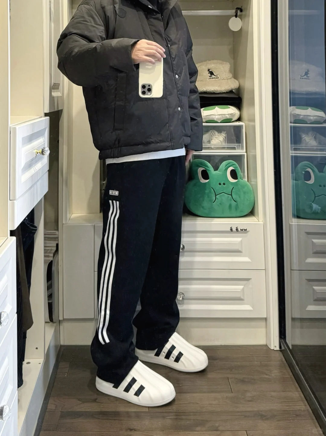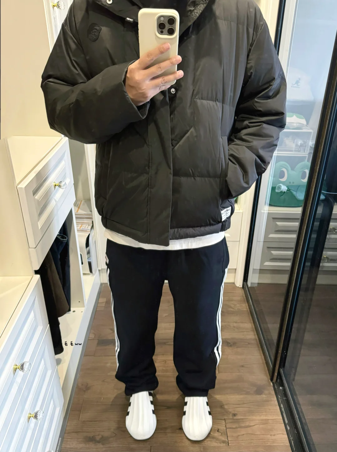-武汉的冬天,光穿厚实可不行,关键要防风;试试不怕刮风的配方:三防面料搭配鸭绒内里 . -黑白主色调,主打一个低调&耐看;侧面条纹的卫裤,完全不挑鞋,面包鞋户外鞋统统驾驭 . —————— . ✏️本人178cm75kg 球鞋尺码265mm(正常EU42) . 💭以上均为我个人观点,不喜勿喷,欢迎讨论。