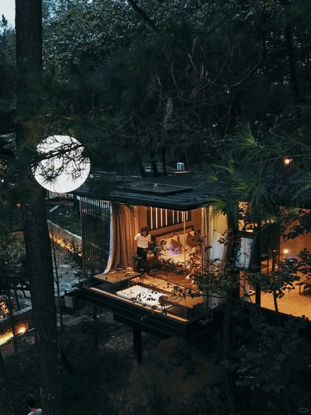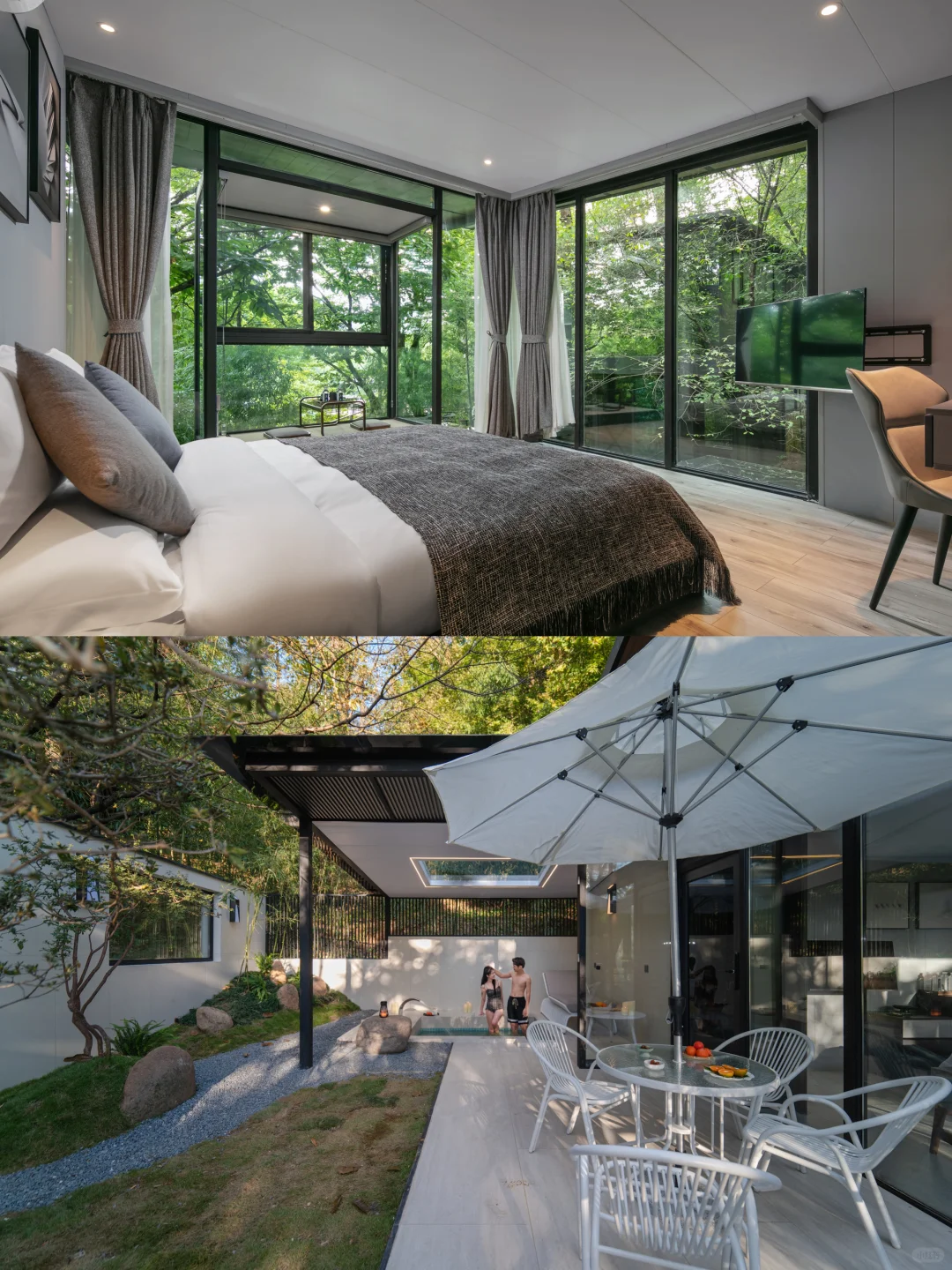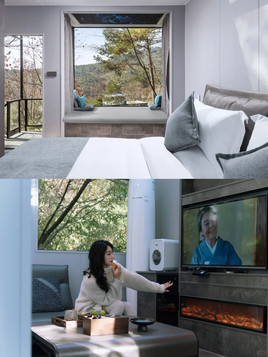 每间树屋都自带超大的全景落地窗🪟超大落地窗将山林景色引入房间🌲可以躺着看山林竹海的景色,冬天还可以沉浸式体验雪国森林般的浪漫景色❄️
