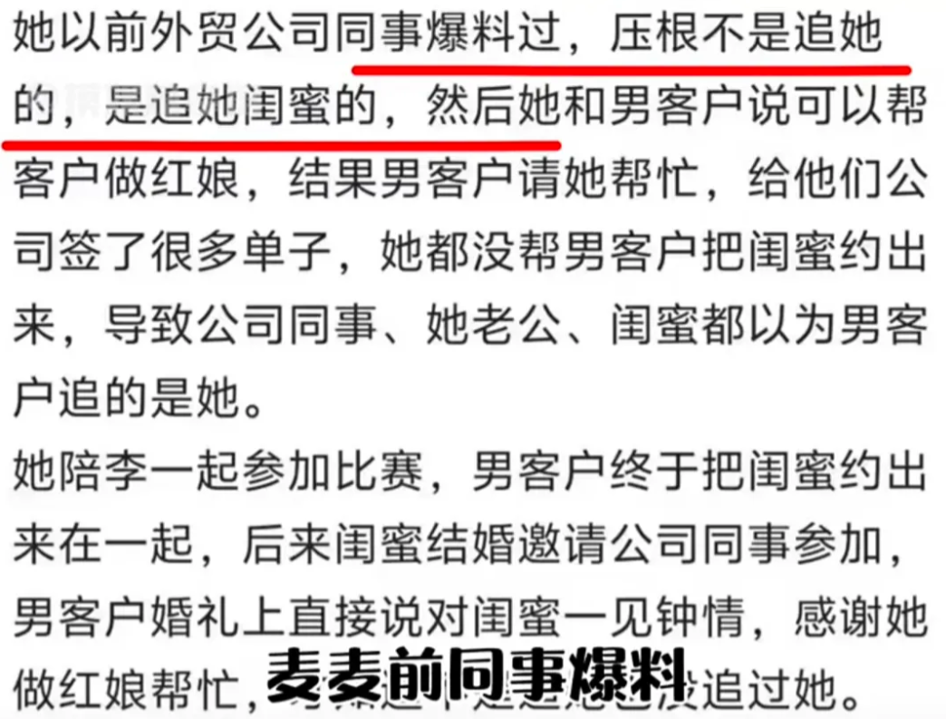 麦琳被前同事爆料。 她之前不是说有很多人追吗?她可以过上自己想要的生活。 但是麦琳的前同事爆料,却说人家追的根本不是她,而是她的闺蜜,而且还利用这个为她自己谋了很多的福利。 麦琳在工作时,就算计了别人,这真的是太老谋深算了,怪不得她跟李说,要是离婚财产和孩子都要归她。 现在很多网友网友在调侃,李:只愿得一人心,麦:白收不分李。 麦琳真的像一个现实版的“吸血鬼”,挣的不多,挣也不是她挣的,她就是想全占。跟别人在一起的时候,用的就是别人了,离婚了,还想全部都拿走,这样的行为实在是太过分了。