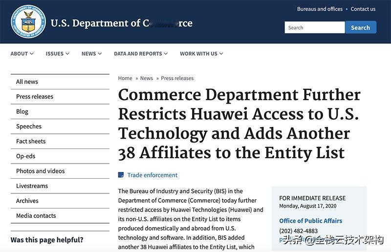 突发:美国再将华为38家子公司拉入实体清单 8月18日消息,昨晚美国国务院和商务部官网分别发表声明,进一步收紧对华为获取美国技术的限制,并将华为在全球21个国家/地区的38家子公司列入“实体清单”,旨在打击华为对商用芯片的获取。 (1)华为云计算技术 (2)华为云北京 (3)华为云大连 (4)华为云广州 (5)华为云贵阳 (6)华为云香港 (7)华为云上海 (8)华为云深圳 (9)华为OpenLab苏州 (10)乌兰察布华为云计算技术 (11)华为云阿根廷 (12)华为云巴西 (13)华为云智利 (14)华为OpenLab开罗 (15)华为云法国 (16)华为OpenLab巴黎 (17)华为云柏林 (18)华为OpenLab慕尼黑 (19)华为技术杜塞尔多夫有限公司 (20)华为OpenLab德里 (21)Toga Networks (22)华为云墨西哥 (23)华为OpenLab墨西哥城 (24)华为技术摩洛哥 (25)华为云荷兰 (26)华为云秘鲁 (27)华为云俄罗斯 (28)华为OpenLab莫斯科 (29)华为云新加坡 (30)华为OpenLab新加坡 (31)华为云南非 (32)华为OpenLab约翰内斯堡 (33)华为云瑞士 (34)华为云泰国 (35)华为OpenLab曼谷 (36)华为OpenLab伊斯坦布尔 (37)华为OpenLab迪拜 (38)华为技术研发英国公司