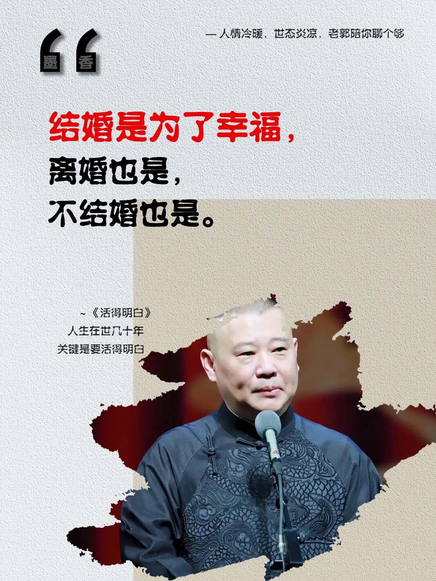 狗咬人咬的是生人,人咬人,咬的是熟人;结婚是为了幸福,离婚也是,不结婚也是;你吃亏的主要原因,就是不愿把人想得太坏;当一碗水端不平的时候,只有牺牲最善良的那个,才能风平浪静。这本郭德纲新书《活得明白》首发上市!有人生不需要太多道理一句话就够了,老郭陪你看人生百态。琐碎言语中有老郭满满的人生智慧与阅历,读完醍醐灌顶,让你的焦虑迷茫内耗都烟消云散!活得明白郭德纲德云社郭德纲语录人生感悟