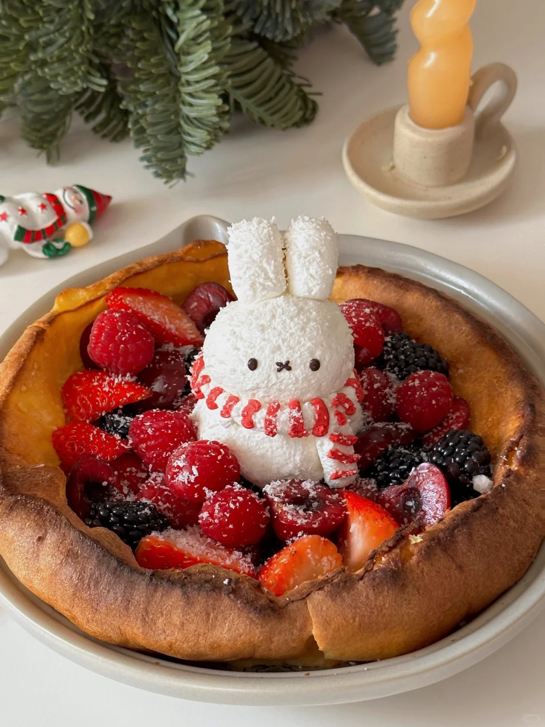 圣诞🎄氛围的甜口荷兰松饼,搭配可爱的miffy酸奶,这不搞定了下午茶~ 所需食材: 低筋面粉70g,牛奶 125 毫升,黄油 20g,鸡蛋2 个,盐1g,白砂糖10g 制作步骤: 1️⃣碗中打入鸡蛋、加入牛奶搅拌均匀 2️⃣低筋面粉过筛和牛奶鸡蛋混合,加入白砂糖和 盐 3️⃣黄油放入烤盘,烤箱中融化后取出,倒入面糊 4️⃣继续放入烤箱中下层200°烤15分钟 5️⃣出炉后撒上好吃的水果 6️⃣过滤好的希腊酸奶捏出米菲形象,用巧克力画五官,撒上椰蓉