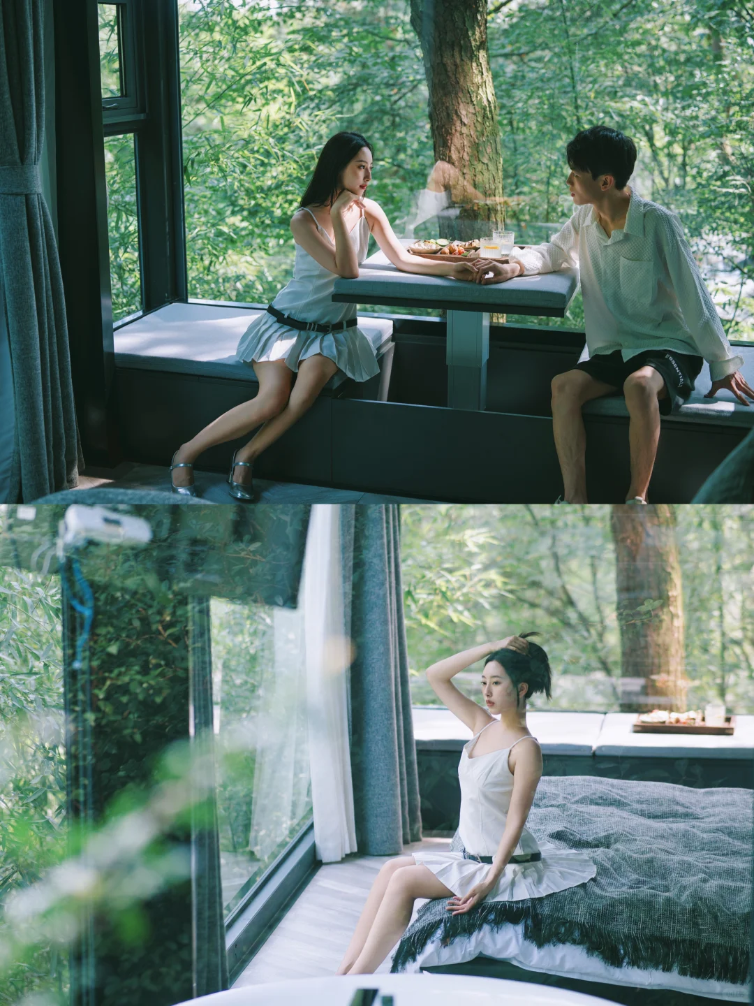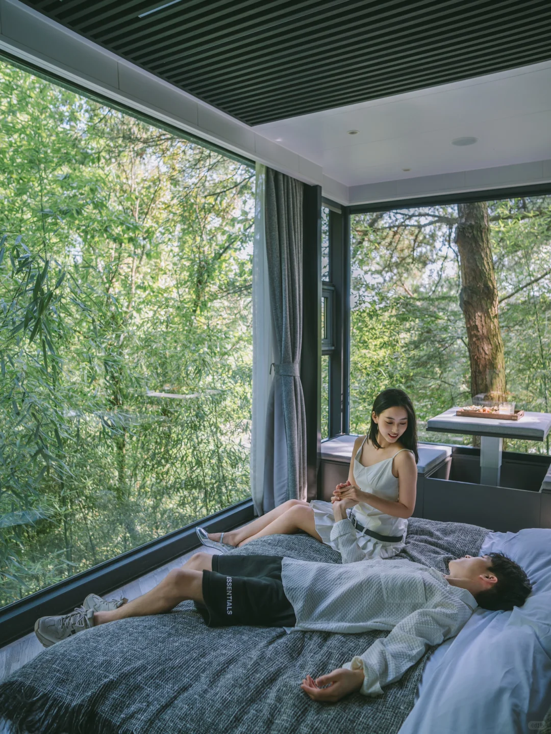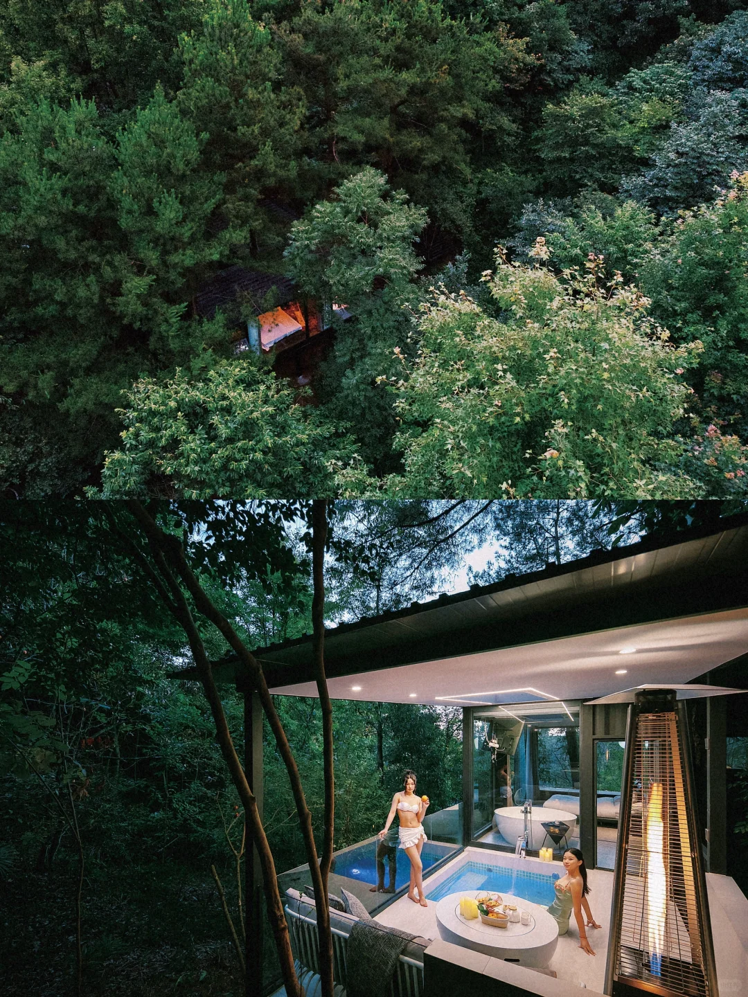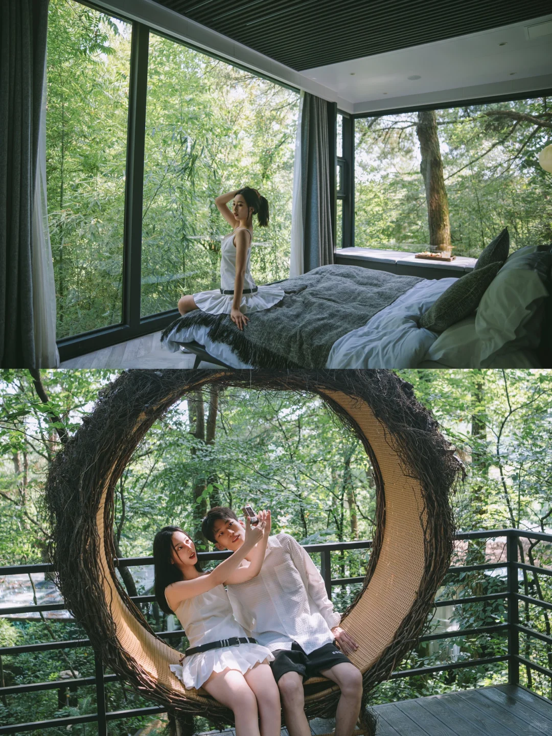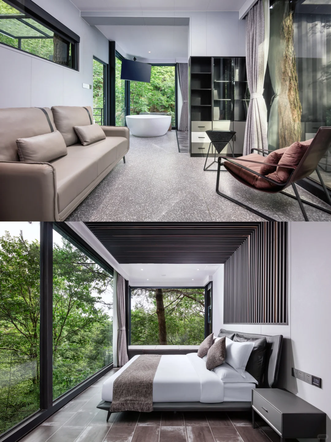 🛋️房间内部就更不用说了,一整面落地大玻璃直面森林,还有语音智能管家、丝涟床垫、戴森吹风机统统都有,说听涛是整个民宿最浪漫最出片的房间完全不夸张哦