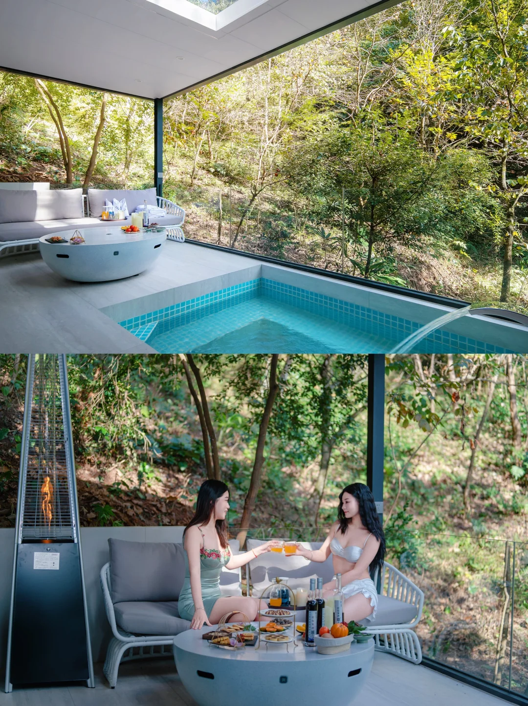 ▪️听涛半露天的私汤位于露台上,从房间打开露台门就可以直接过去泡🧖♀️有沙发休息区、围炉煮茶、户外取暖燃汽灯💡管家还会提前布置好蜡烛、围炉煮茶,浪漫感满分还是24h不限时畅泡的那种哦💯