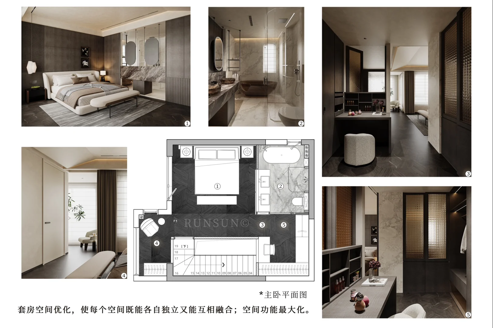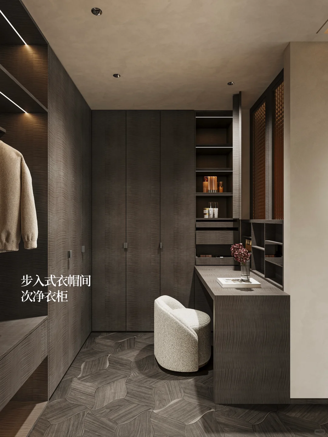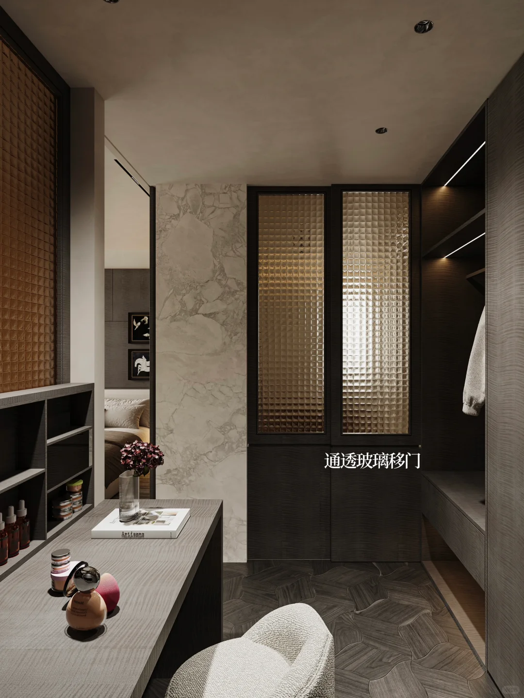 NEWCASE.温州瓯江峯汇私宅 本案是偏现代轻奢的主卧套房设计,跃层的29㎡二层卧室。卧室空间包含卫生间、衣帽间、茶歇区三个功能分区,一体化形成套房形式。 卫生间配有双台盆和独立浴缸,整体空间通过减少实体墙的隔断,营造出更为通透的视觉效果。由于采光不足,选择半开式,通过移门达到采光。移门开合可以关闭衣帽间入口,主卧动静区划分,各空间相对独立。 衣帽间位于楼梯口上方的死角位置,根据梳妆台高度做了开合的窗户来保证逼仄空间内的自然采光。主卧尽量保证所有角落自然光源充足,更适合居住。