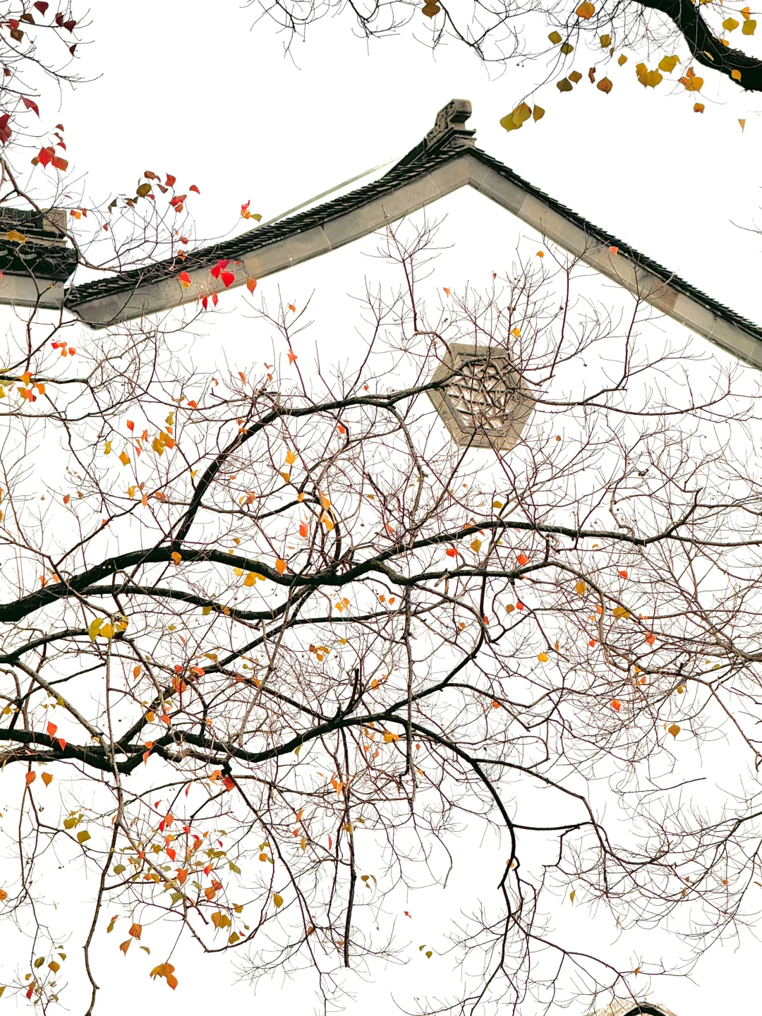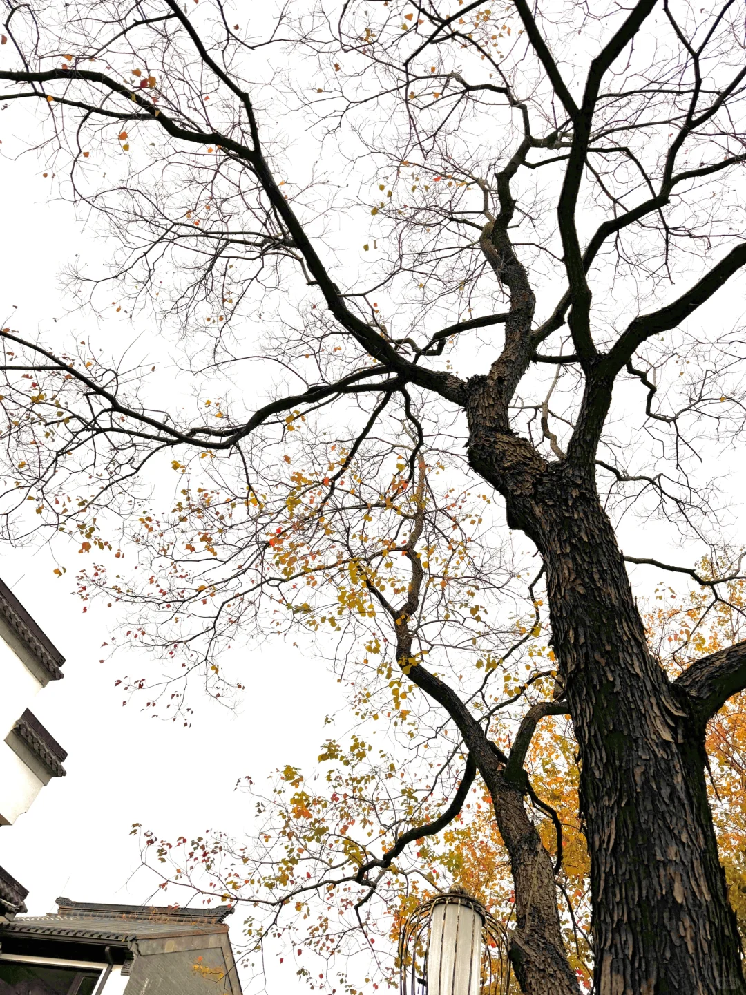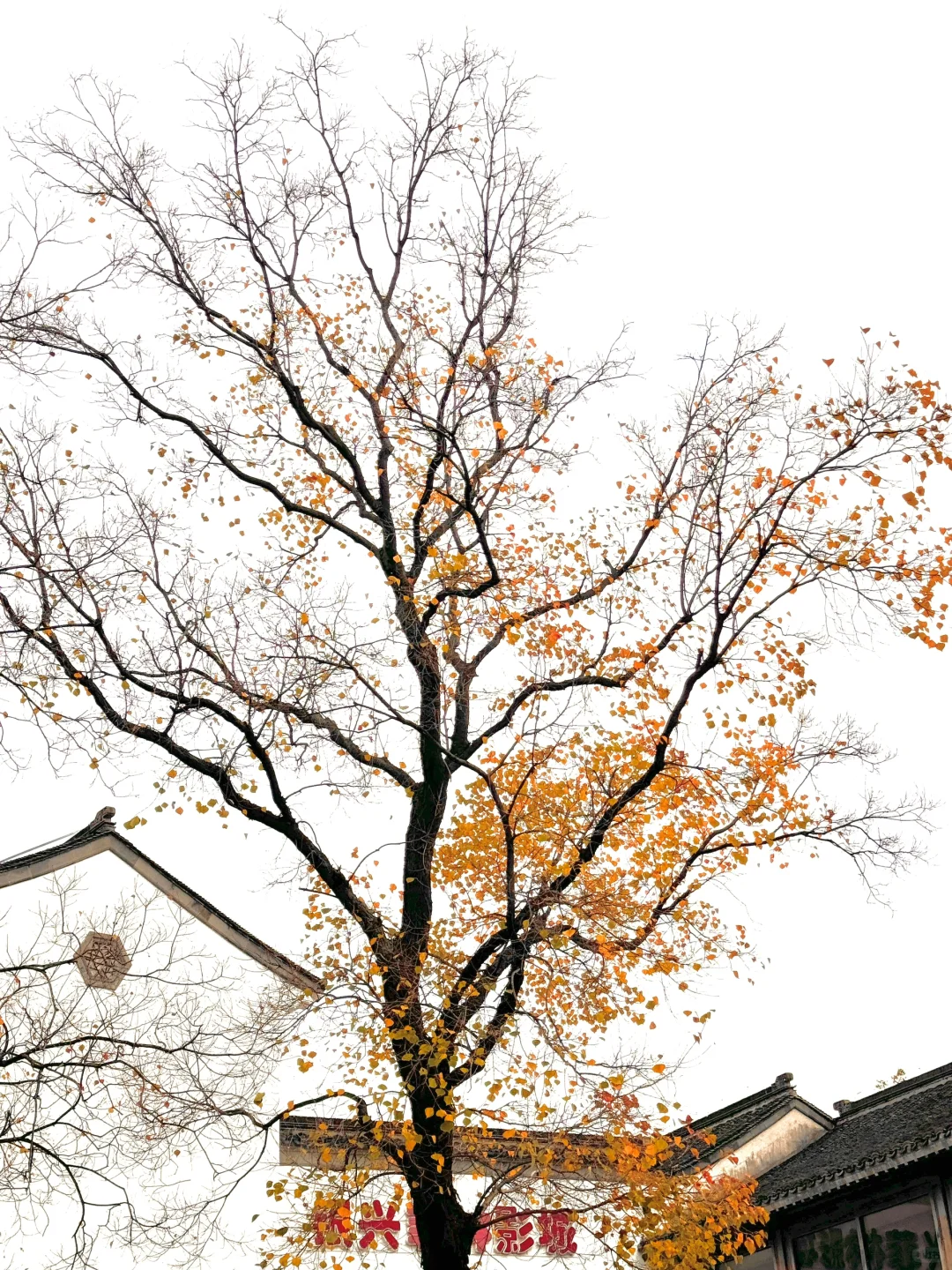 南京老门东的这棵乌桕树 像是秋风把落叶挥洒在黑瓦白墙的宣纸上 像极了老祖宗笔下的中式山水 这就是中式留白的美学吧!! 📷 拍摄于2024.11.24 南京,老东门 导航银兴菲林影城 Ps 全都是iPhone15pm拍摄,今天天气很差,下午还逆光,但依旧可以拍出非常中国风的照片!全靠后期努力! 叶子快掉光了快点去!