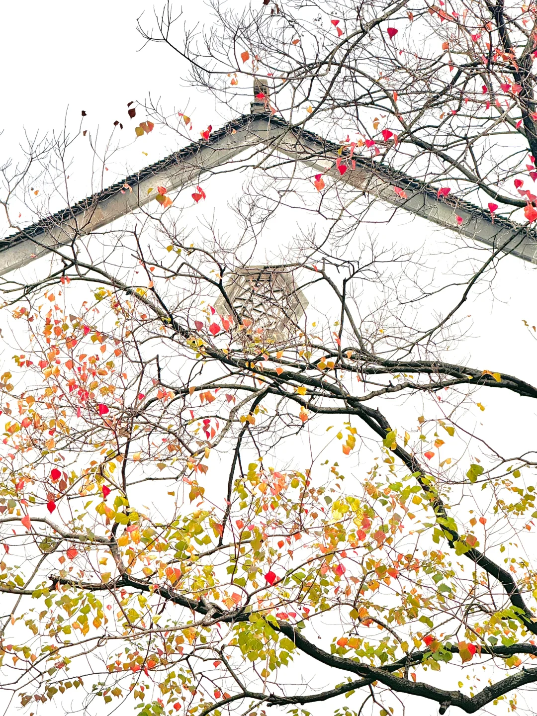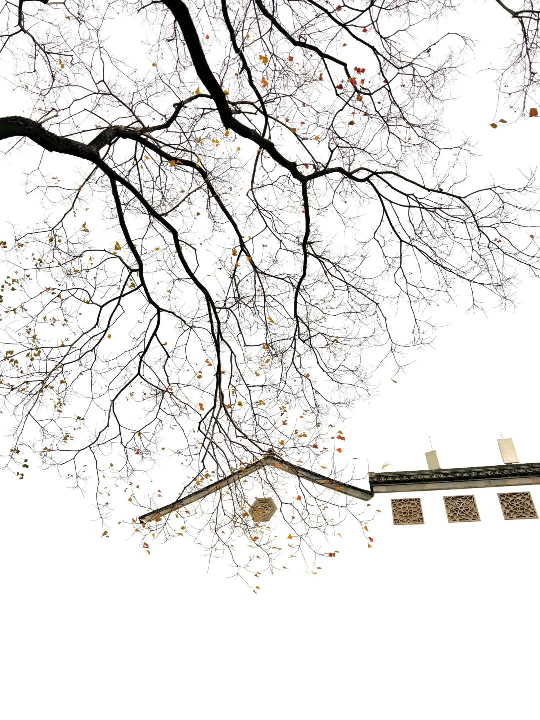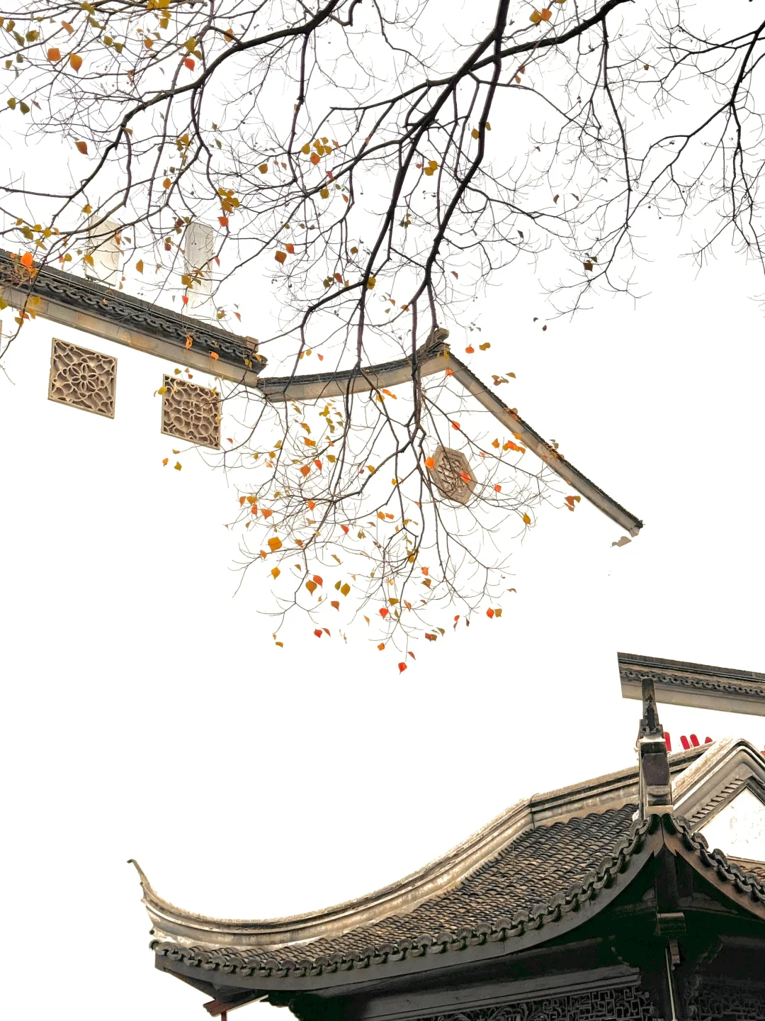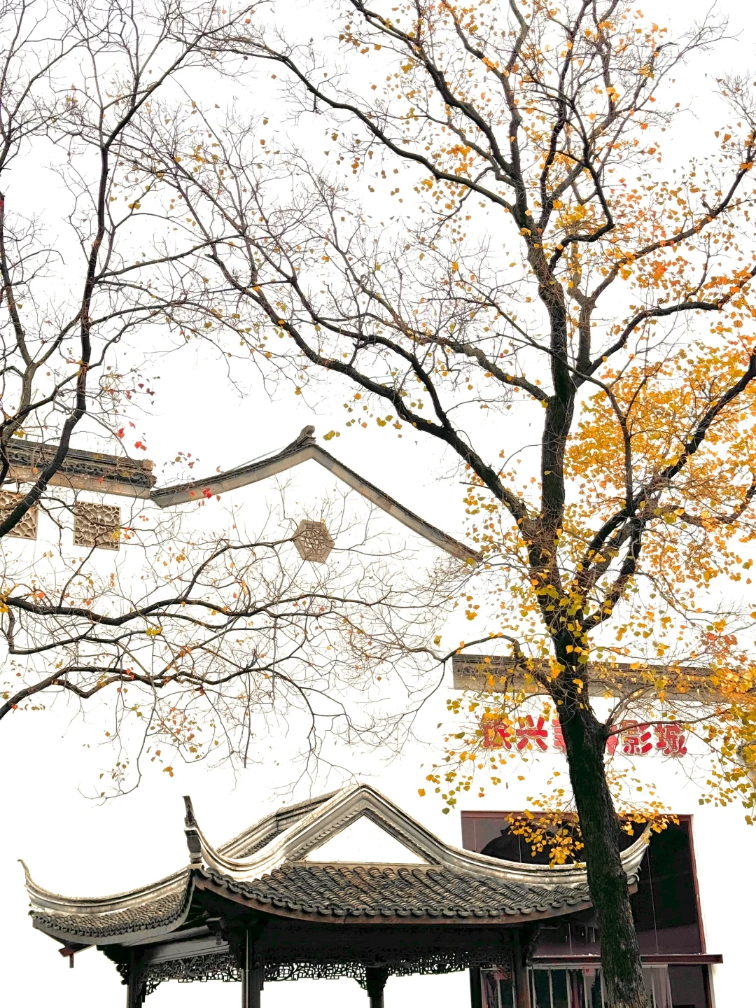 南京老门东的这棵乌桕树 像是秋风把落叶挥洒在黑瓦白墙的宣纸上 像极了老祖宗笔下的中式山水 这就是中式留白的美学吧!! 📷 拍摄于2024.11.24 南京,老东门 导航银兴菲林影城 Ps 全都是iPhone15pm拍摄,今天天气很差,下午还逆光,但依旧可以拍出非常中国风的照片!全靠后期努力! 叶子快掉光了快点去!