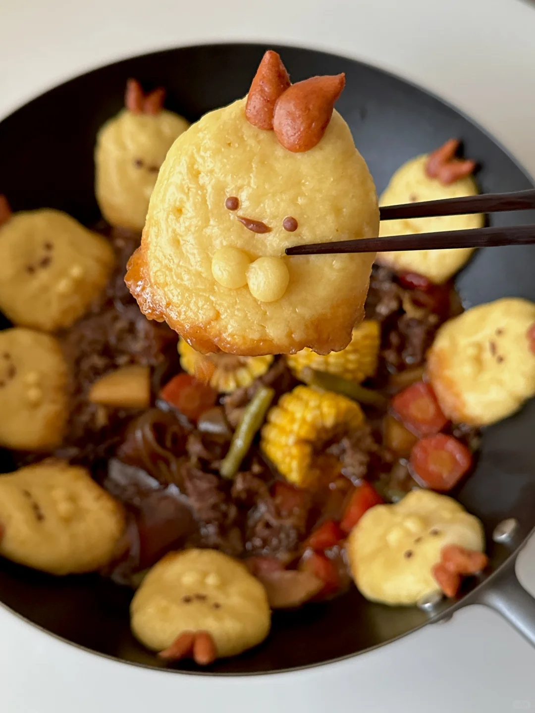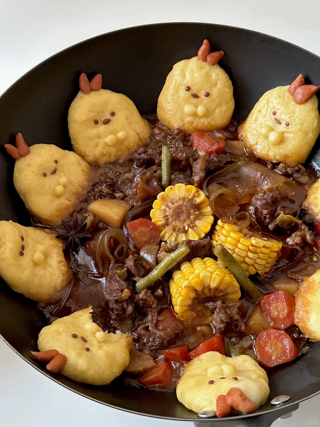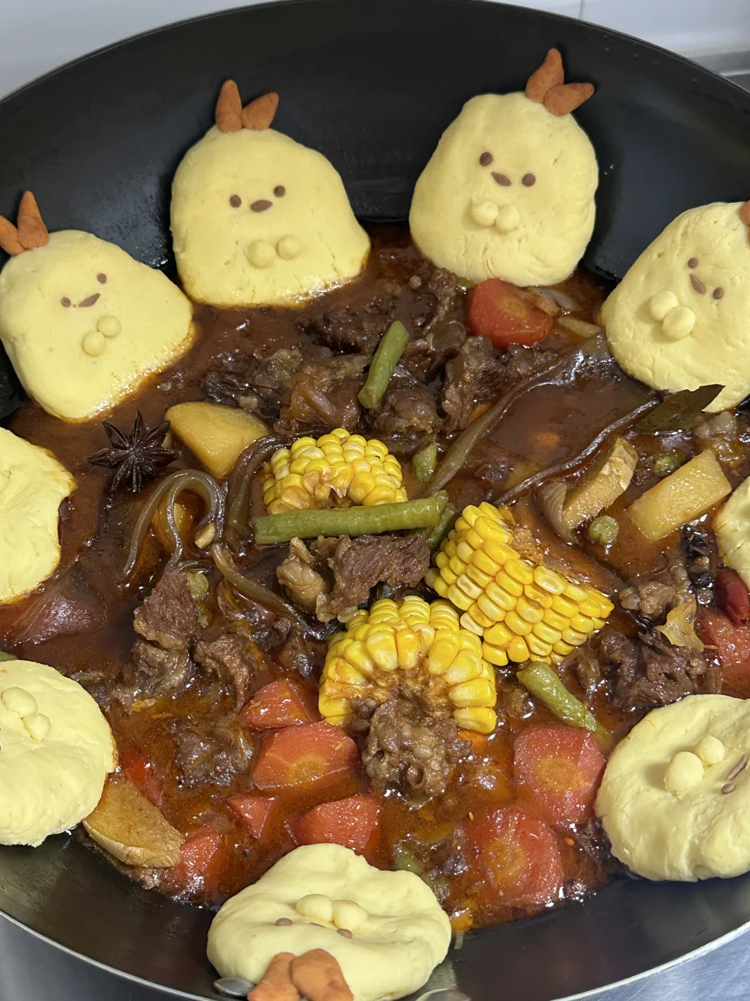3️⃣玉米饼贴在锅边,加上细节,盖锅盖中小火继续十分钟左右即可出锅