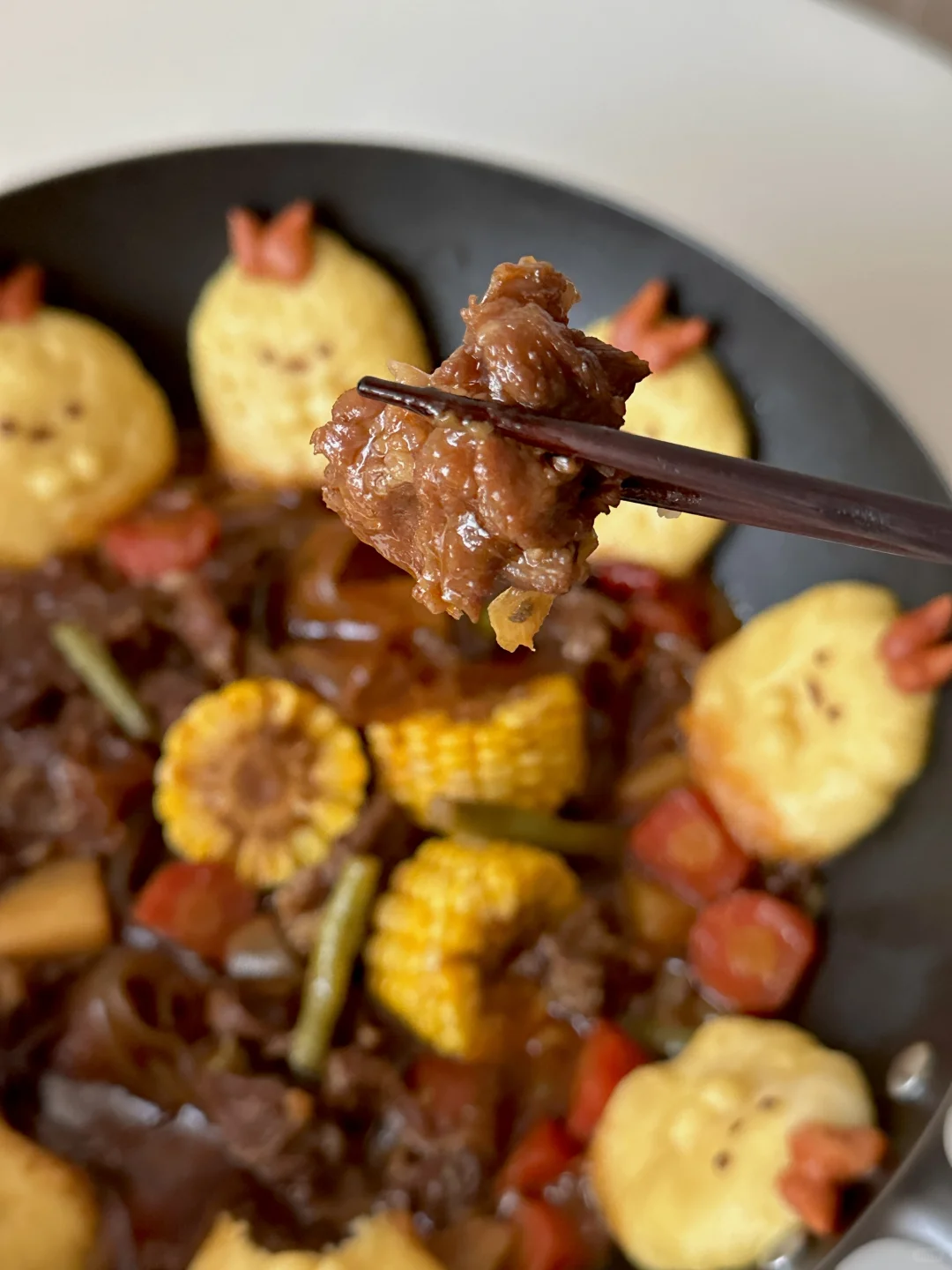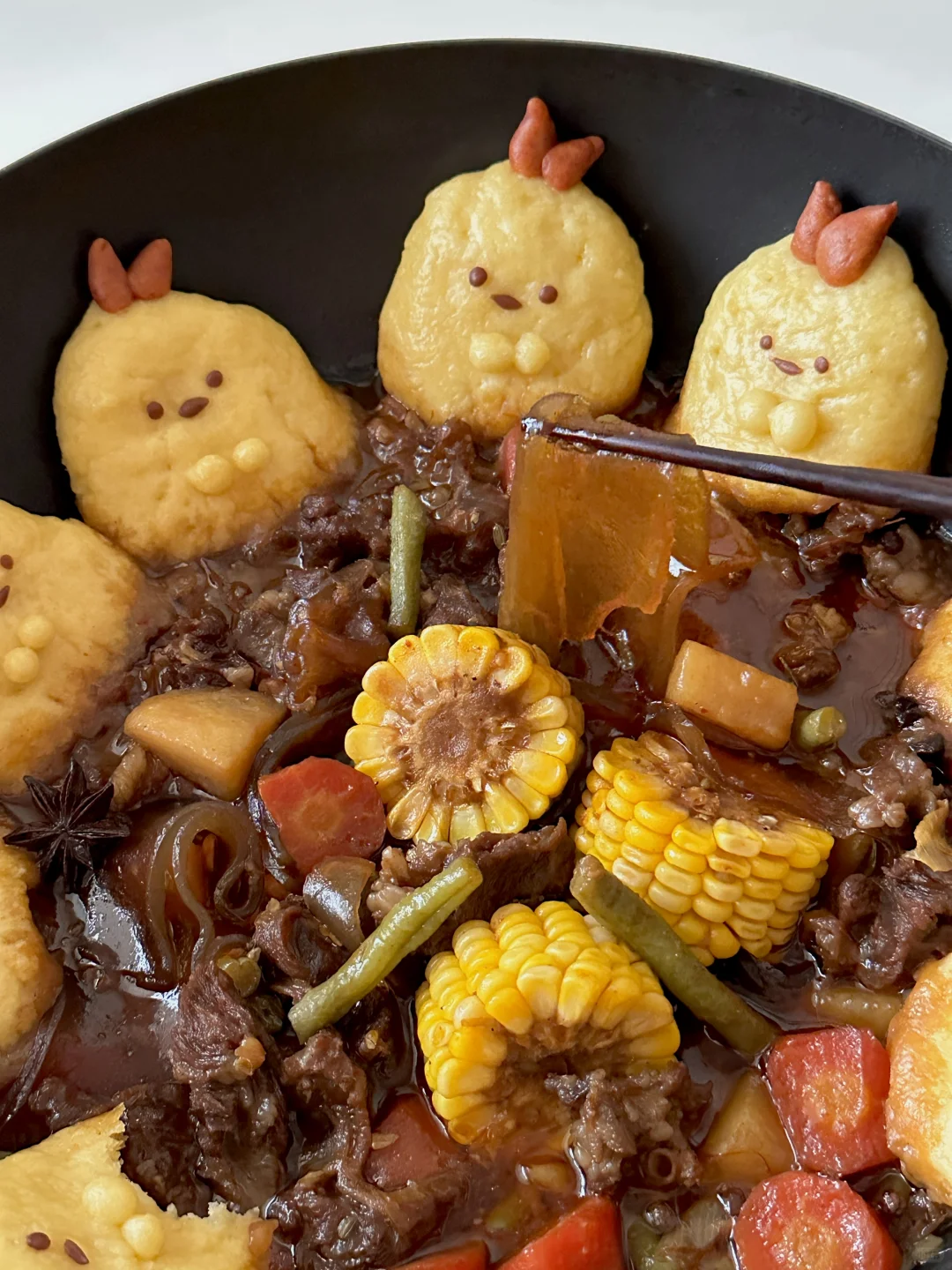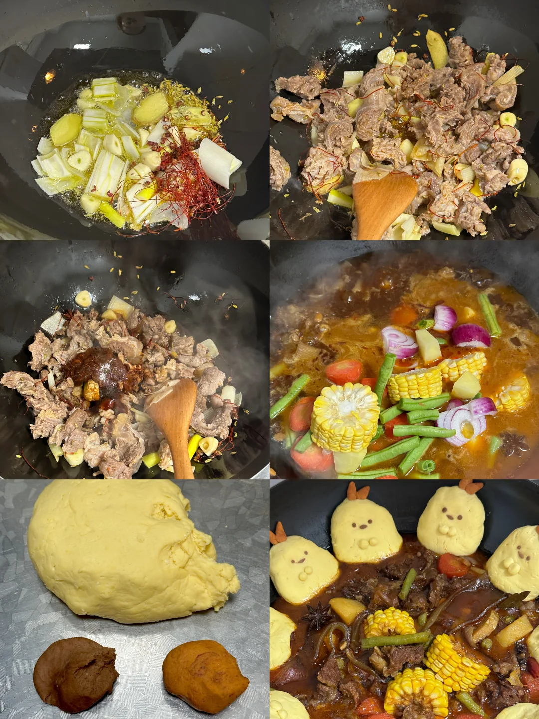 1️⃣热油下锅,爆香所有大料,加入牛肉筋翻炒,再加入两勺黄豆酱,一勺生抽,一勺老抽,一勺蚝油,火锅底料,炖煮40分钟