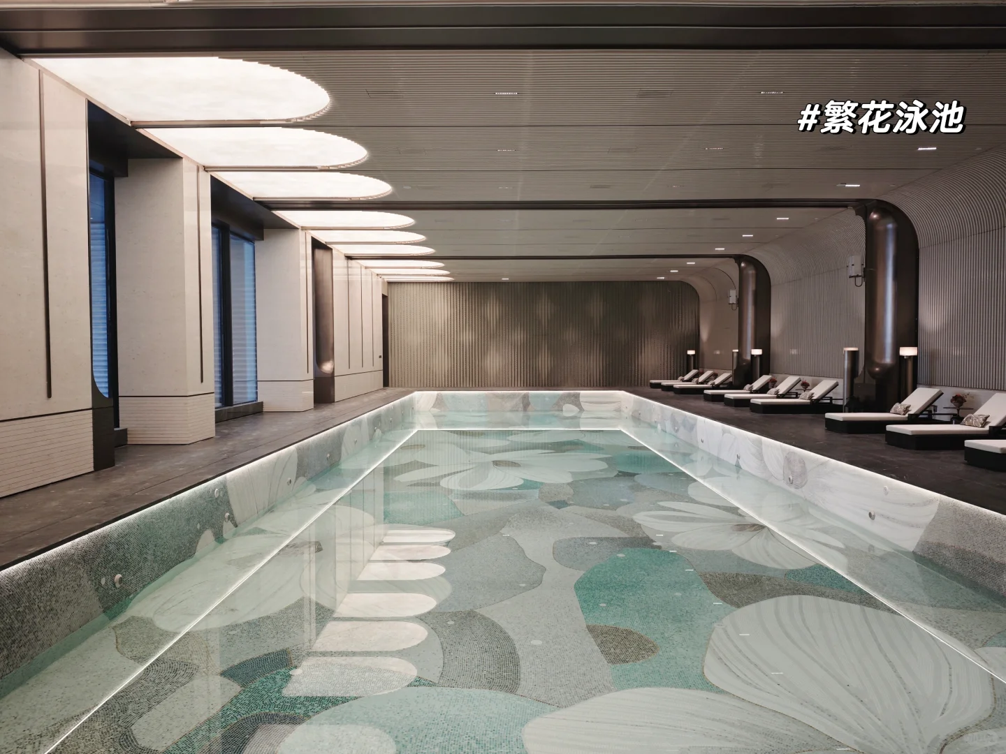 泳池目前我看到的还没来得及放水,整个泳池都是马赛克的繁花拼花很不错。