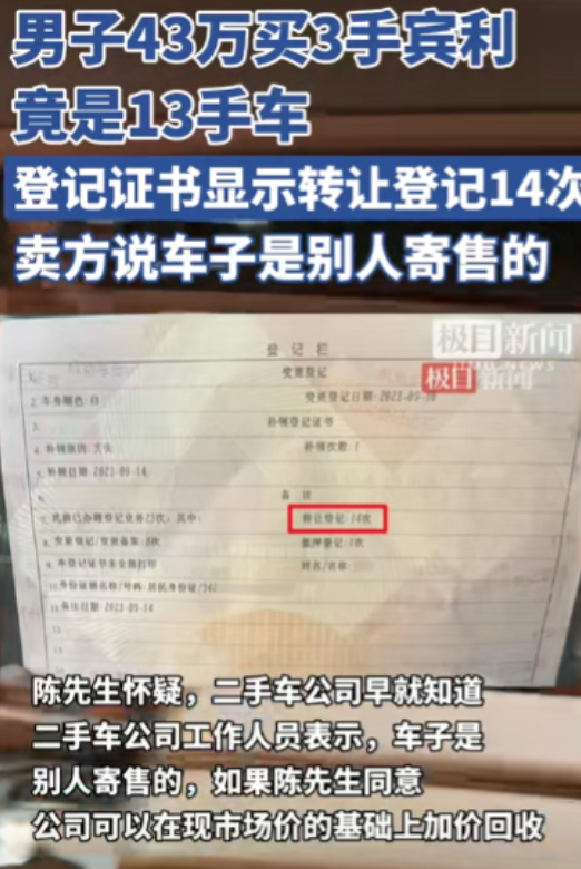 他是第十四任车主! 他感到自己被彻底坑了,不仅是经济上的损失,还有作为“成功人士”的那份自尊,回想起当初车商的种种承诺,愈发觉得自己是个“大冤种”。 陈先生立刻联系了车商,质问对方为何隐瞒车辆的真实过户次数。车商却一副事不关己的态度,声称自己也是从别人手里收来的车,并不了解完整的过户记录。 他解释道:“我们只按照原登记证书上的信息销售,谁能想到这辆车之前有那么多过户呢?” 随后,车商提出了一个解决方案:如果陈先生愿意,可以在原基础上加点钱,把车重新卖回给他们。 这样的方案让陈先生更加愤怒,他不愿意接受这样的处理方式,他严肃地表示,自己需要一个明确的说法,否则将采取法律手段维权。 信息来源:极目新闻,2024年11月30日,男子47万元买“3手宾利”竟是“13手车”,卖方:系别人寄售,自己也是受害者
