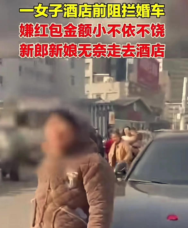2024年安徽阜阳,大妈拦婚车讨要红包,新郎为了不耽误吉时只能给,可大妈嫌弃金额太小,竟然扬言:“不给2个红包不许走!”然后用身体挡住婚车的去路... 麻烦看官老爷们右上角点击一下“关注”,既方便您进行讨论和分享,又能给您带来不一样的参与感,感谢您的支持! 2024年安徽阜阳,一对新人正满怀期待地前往酒店,准备开始他们人生的新篇章,婚车一排排,鞭炮响个不停,气氛喜庆热闹。 然而,就在距离酒店不远的地方,一个穿着咖色棉睡衣的大妈突然出现,拦住了婚车的去路。 很多地方的习俗中都有“闹婚”,寓意为图个吉利,讨个喜庆,新郎也按照惯例,下车递上了红包和喜烟,希望大妈沾沾喜气,也让婚车尽快通行。 谁知这位大妈打开红包后,脸色一变,嫌少,她不仅没有让路,反而变本加厉,张开双臂拦住婚车,嘴里喊着“不给红包不让走”,甚至叫嚣“有本事你就撞我”,周围的人纷纷拿出手机拍摄,但这并没有让大妈收敛,反而更加嚣张。 新郎新娘无奈,只能选择下车步行前往酒店,留下大妈一人在风中凌乱,整个过程被人拍了视频发到网上,引起了网友的热议和批评。 有人指责大妈的行为丢人现眼,有人怀疑她并非初犯,甚至有人建议报警,认为其行为已经涉嫌敲诈勒索,原本热闹的婚礼,因为这个意外的小插曲,气氛变得有点沉闷。 “婚闹”其实是中国传统文化里的一个习俗,初衷是驱邪避凶,希望新人能幸福美满,过去,婚闹的形式多种多样,有贴喜字、放鞭炮、唱喜歌等等,充满了欢乐和祝福。 随着时代的发展,一些地方的婚闹逐渐变了味,从祝福变成了敛财的工具,甚至演变成了一些低俗、恶劣的行为,现在一些地方的婚闹,已经完全背离了祝福新人的初衷。 拦路要红包、强迫新人喝酒、甚至对伴娘进行骚扰等等,这些行为不仅让新人感到尴尬和不适,也严重破坏了社会风气。 更有甚者,将婚闹作为一种敛财的手段,利用新人的碍于面子心理,狮子大开口,索要高额红包,这种行为已经完全脱离了传统习俗的范畴,变成了赤裸裸的敲诈勒索。 传统习俗和现代社会的价值观之间的矛盾越来越明显,一方面,我们应该尊重和传承优秀的传统文化;另一方面,我们也要与时俱进,摒弃那些不符合现代社会价值观的不良习俗。 大妈不给婚车让路,非要索要红包,这行为已经触犯了敲诈勒索罪的条件,如果事情严重了,就可能要接受法律的处罚。 从道德层面来看,大妈的行为更是令人不齿,她不仅差点搅黄了新人的婚礼,还破坏了公共道德。 我们要加强对传统文化的宣传引导,让更多人了解传统习俗的真正含义,避免其被恶意利用,同时也要加大对恶意婚闹行为的打击力度,营造良好的社会风气。 阜阳婚闹事件给我们敲响了警钟,传统习俗不应该成为敛财的工具,更不应该成为伤害他人的武器,我们每个人都应该从自身做起,抵制恶意婚闹,共同维护社会和谐与文明。 【信源】羊城晚报