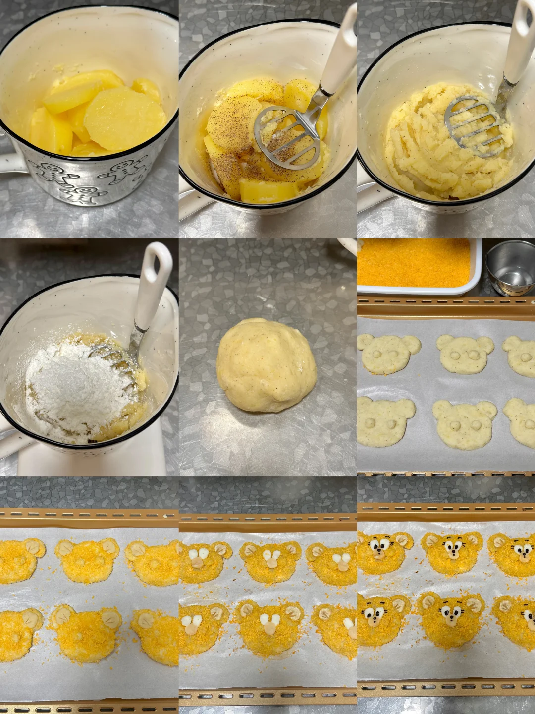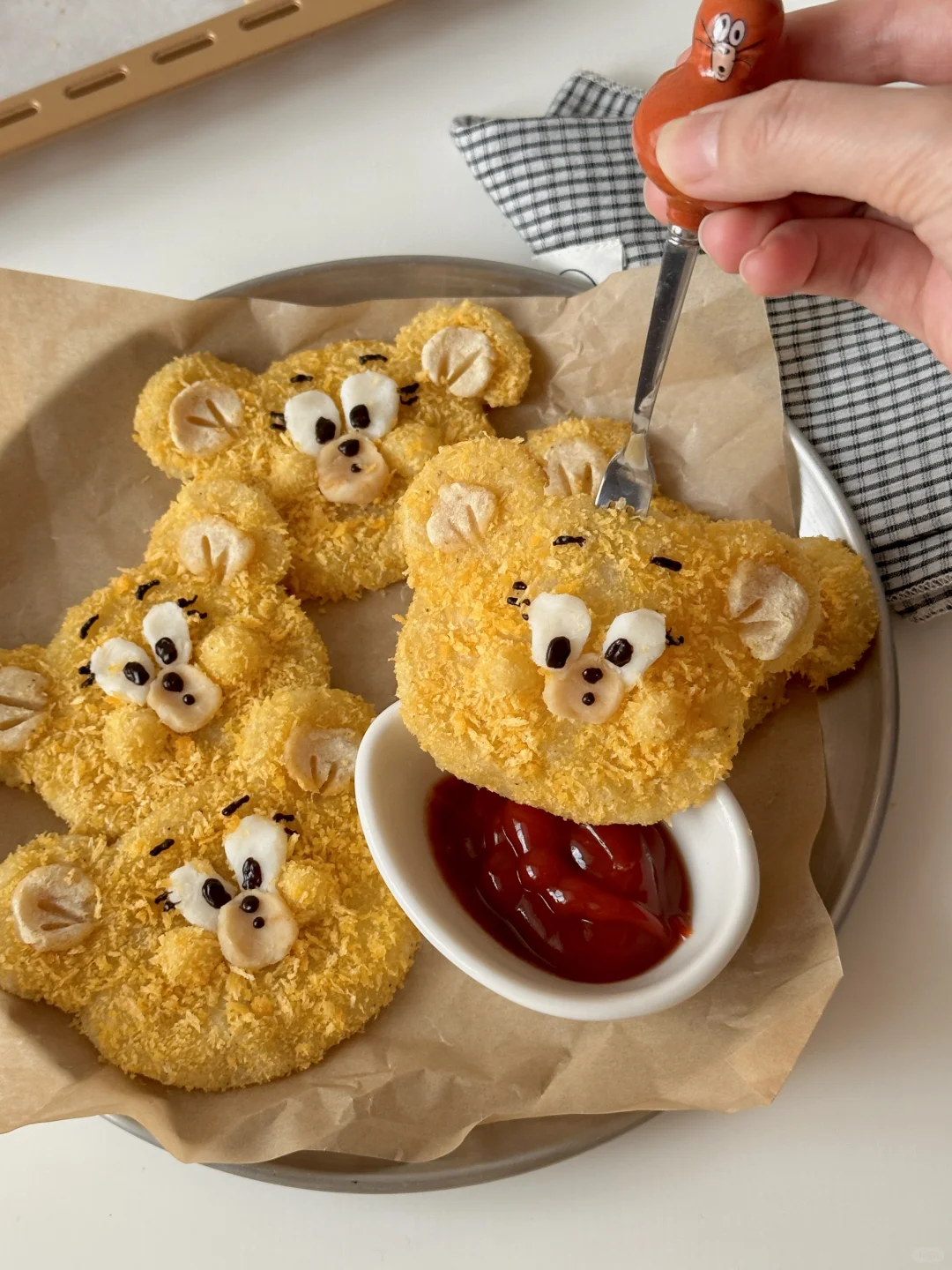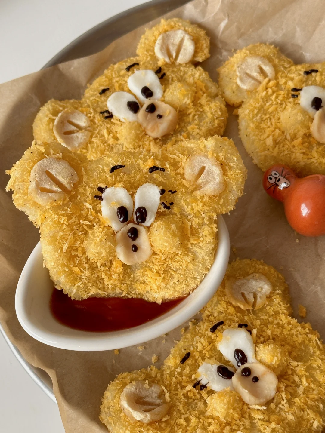 鼠鼠我呀~变成了真的薯饼~[笑哭R] 所需材料: 土豆两个,黑椒海盐,玉米淀粉30g,面包糠 制作步骤: 1️⃣土豆切片蒸熟,压成泥 2️⃣加入黑椒海盐,玉米淀粉揉成团 3️⃣捏出鼠鼠形状,刷油,粘上面包糠 4️⃣烤箱190°烤25-30分钟 5️⃣山药蒸熟压成泥做眼白(觉得麻烦可以直接用土豆泥),土豆泥加一丢丢酱油染色做嘴巴和内耳,最后用巧克力装饰细节~ 快来试试吧~[飞吻R]