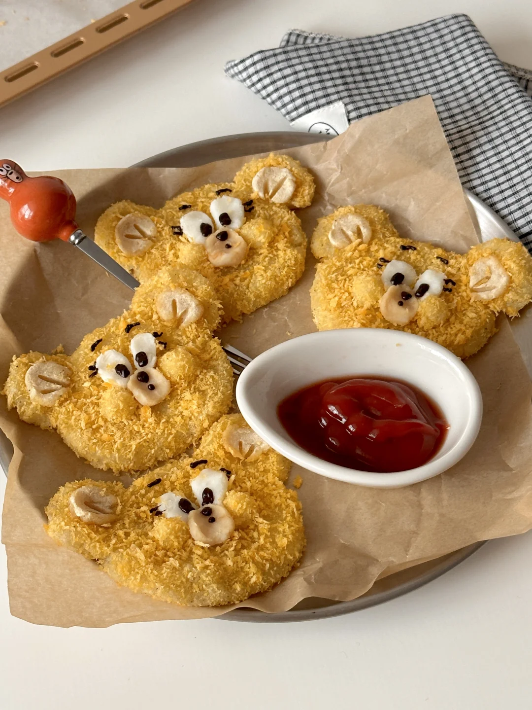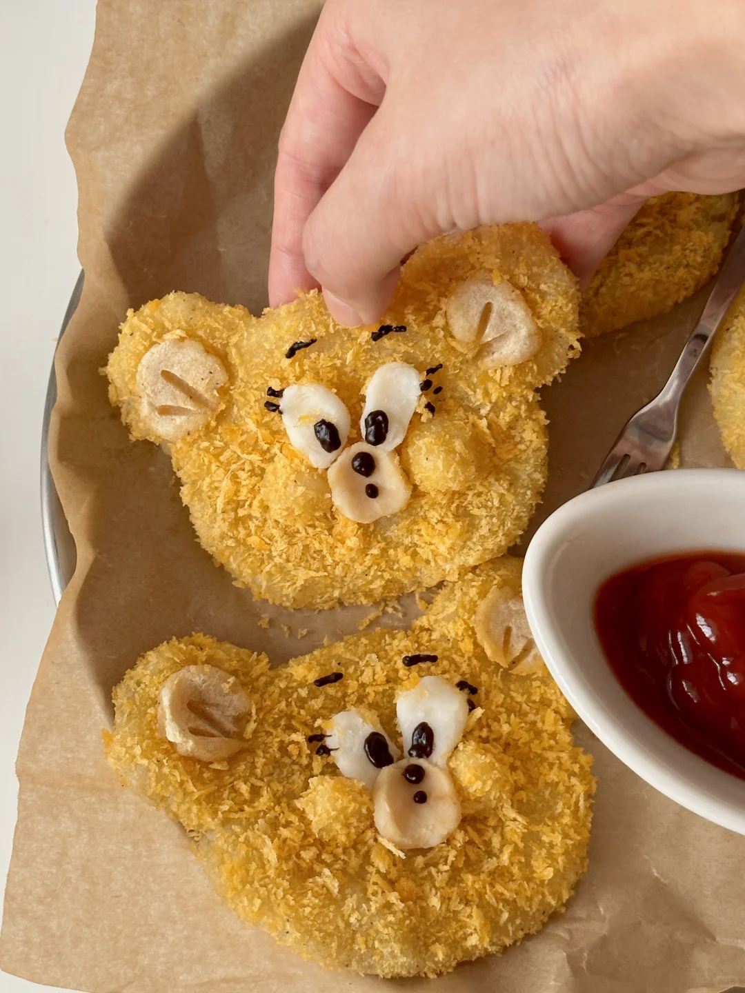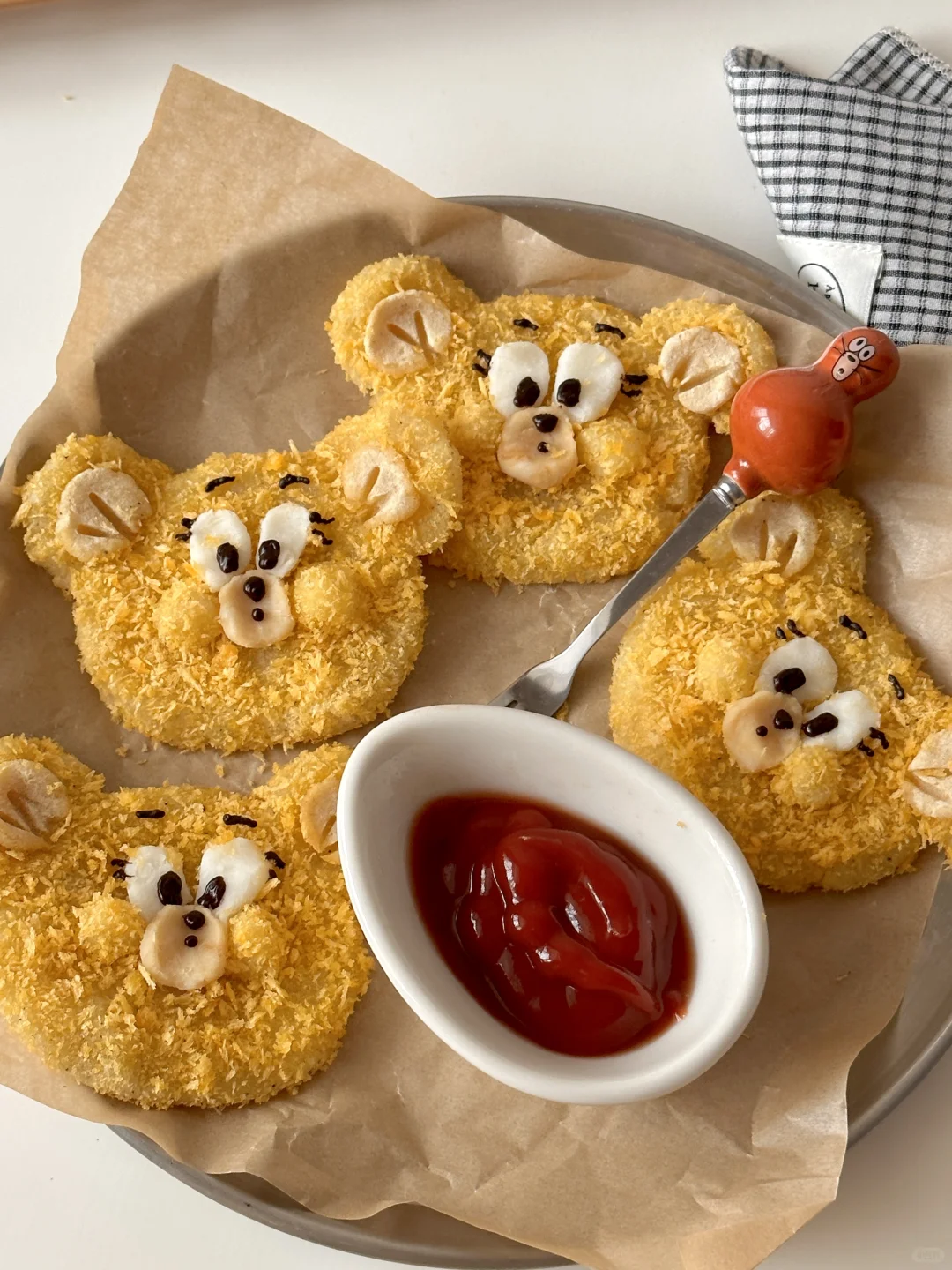 鼠鼠我呀~变成了真的薯饼~[笑哭R] 所需材料: 土豆两个,黑椒海盐,玉米淀粉30g,面包糠 制作步骤: 1️⃣土豆切片蒸熟,压成泥 2️⃣加入黑椒海盐,玉米淀粉揉成团 3️⃣捏出鼠鼠形状,刷油,粘上面包糠 4️⃣烤箱190°烤25-30分钟 5️⃣山药蒸熟压成泥做眼白(觉得麻烦可以直接用土豆泥),土豆泥加一丢丢酱油染色做嘴巴和内耳,最后用巧克力装饰细节~ 快来试试吧~[飞吻R]