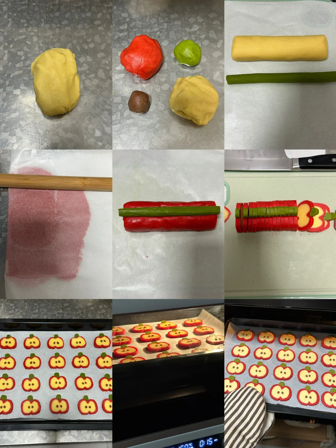 9️⃣全部做好后放入冰箱冷冻层20分钟左右,拿出来切片,可可面团搓出苹果核点缀,烤箱165°预热,160°烘烤15分钟即可出炉~