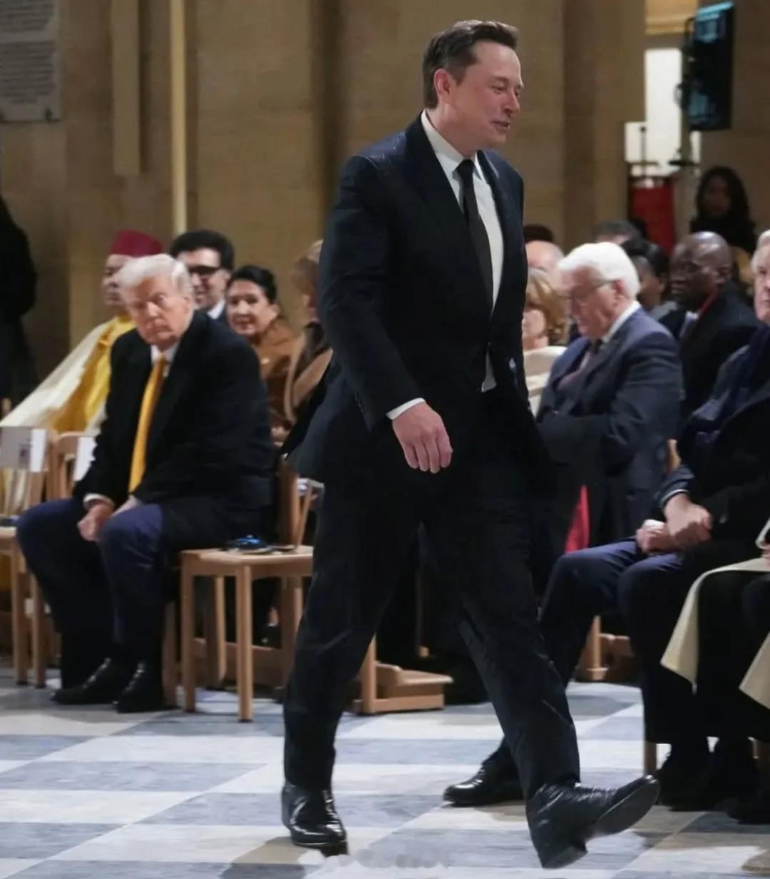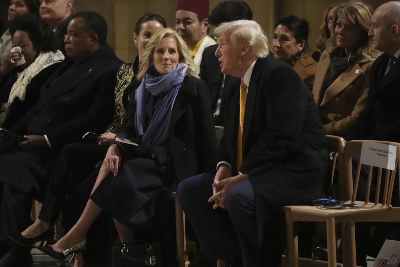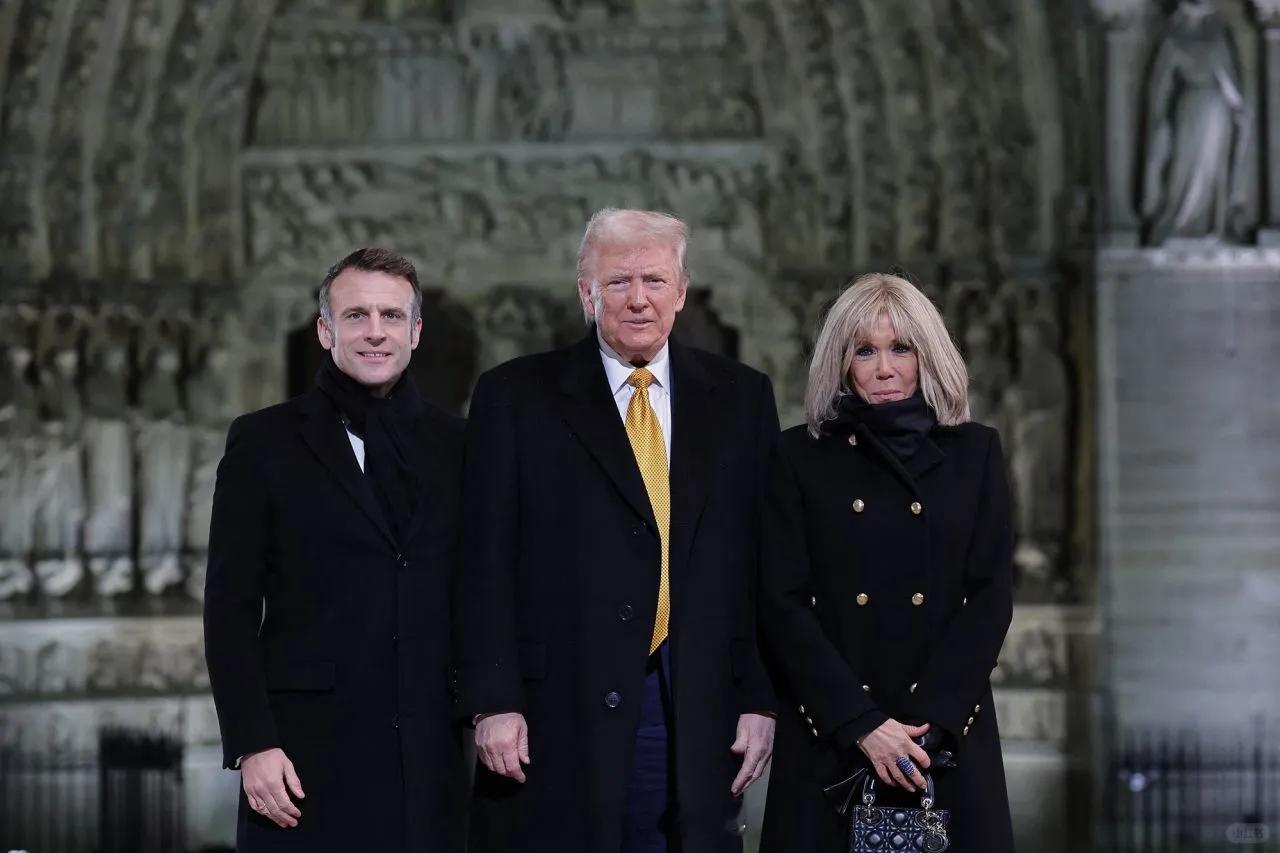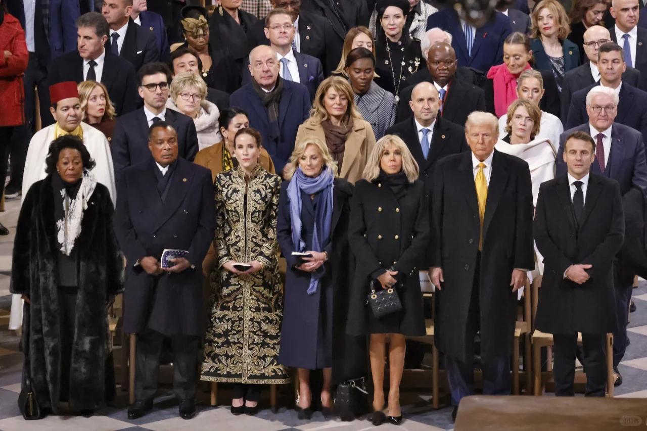 特朗普走过中殿的右侧,穿过数千名与会者,其中包括国家元首、主要商界领袖和天主教政要。当这位候任总统走近大教堂前时,受到了一阵热烈的掌声欢迎,他被分配到法国总统埃马纽埃尔·马克龙(Emmanuel Macron)和他的妻子布丽吉特(Brigitte)之间。坐在法国第一夫人另一边的是她的美国第一夫人吉尔·拜登(Jill Biden)。