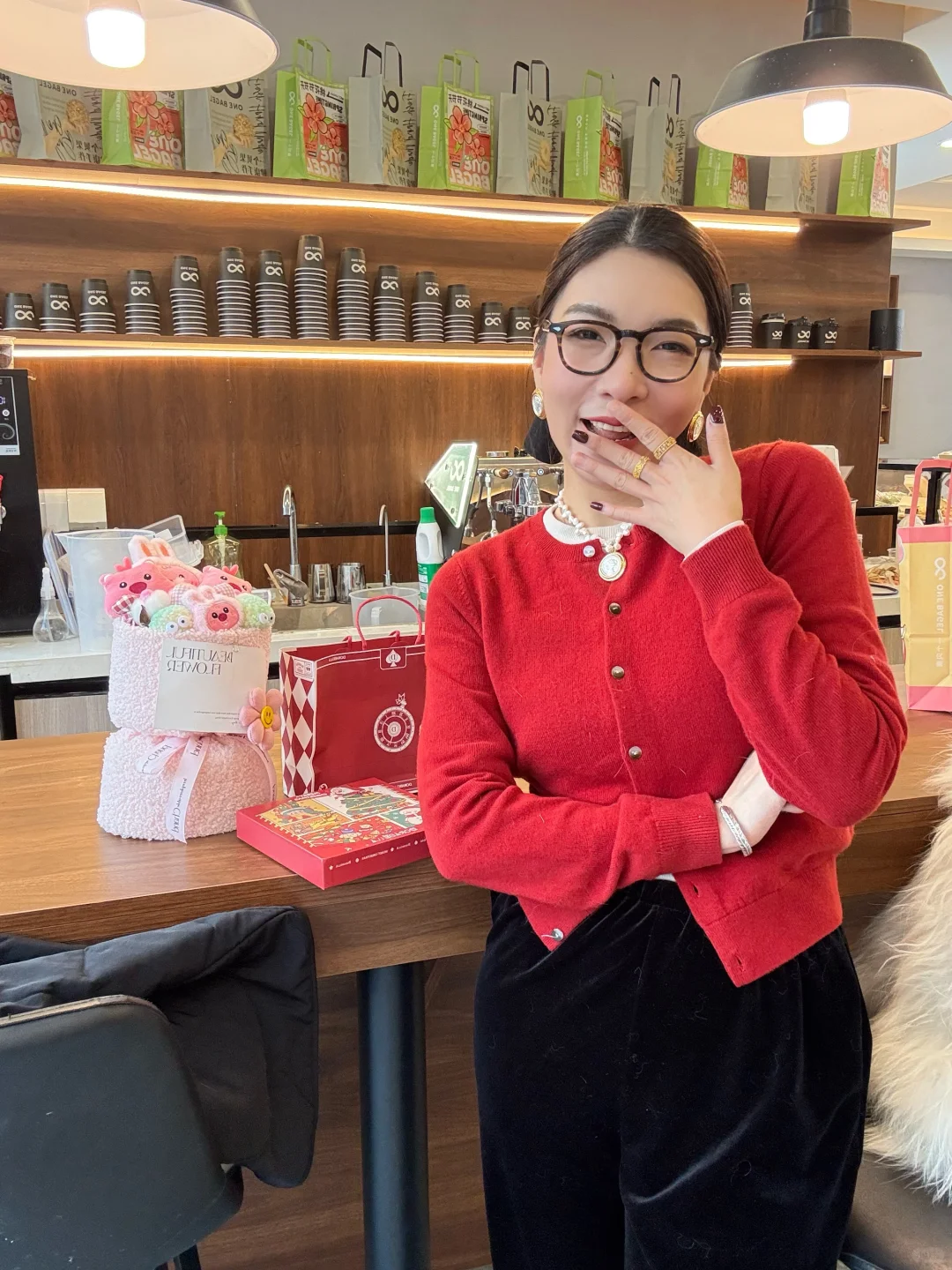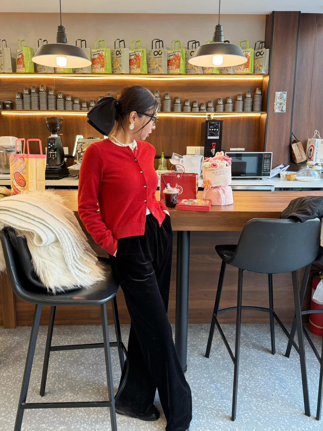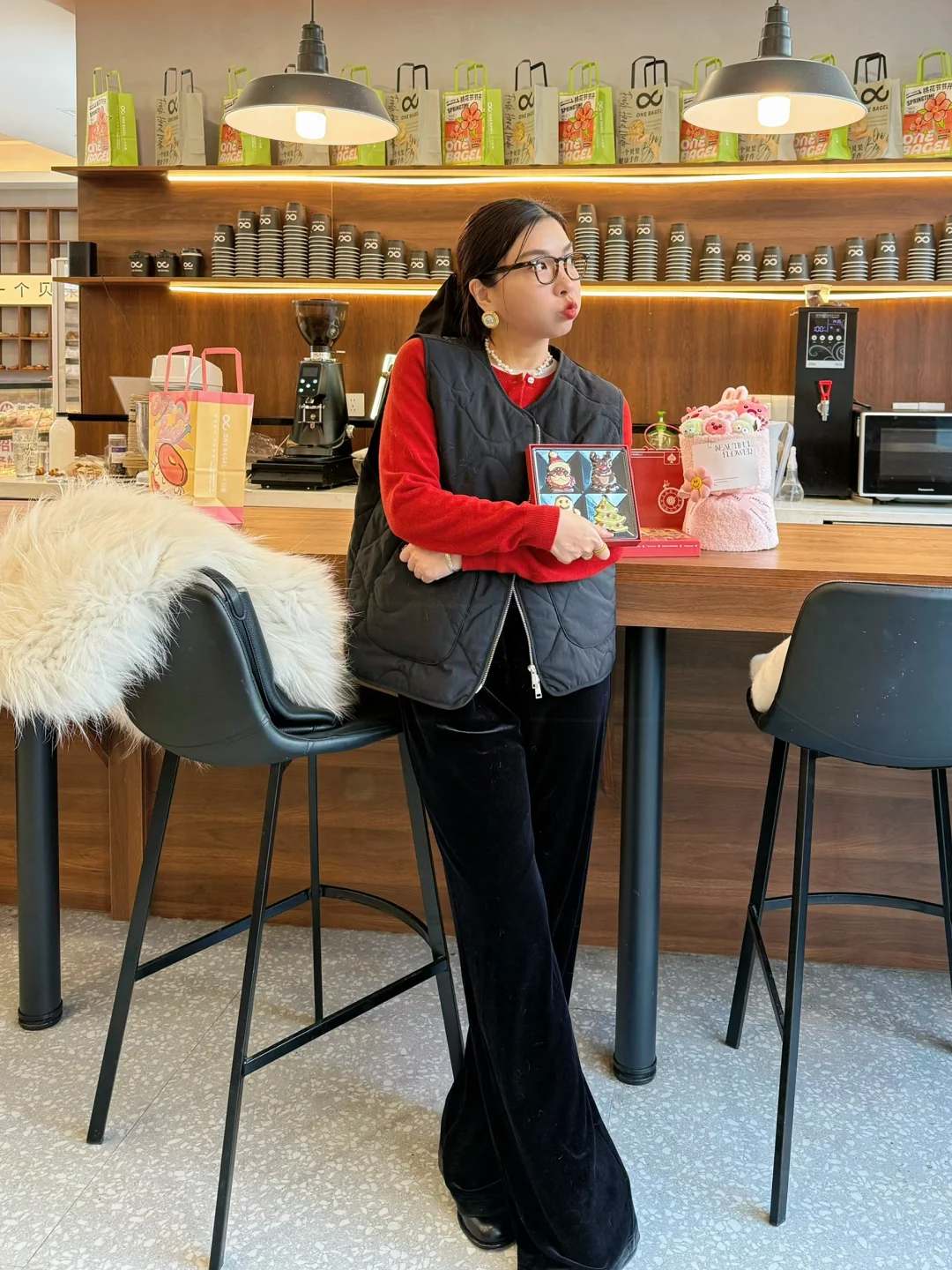 时尚fitcheck穿搭 红与黑,不过时的经典搭配。 红色毛衣点亮冬日氛围, 黑色马甲与阔腿裤干练利落, 简约中彰显高级感。 金色饰品点缀,精致满分!