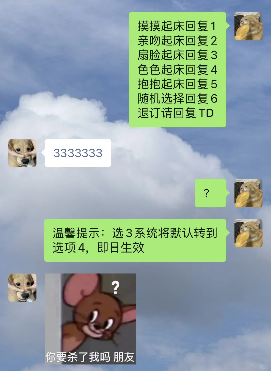 摸摸起床回复1 亲吻起床回复2 扇脸起床回复3 色色起床回复4 抱抱起床回复5 随机选择回复 6 退订请回复TD