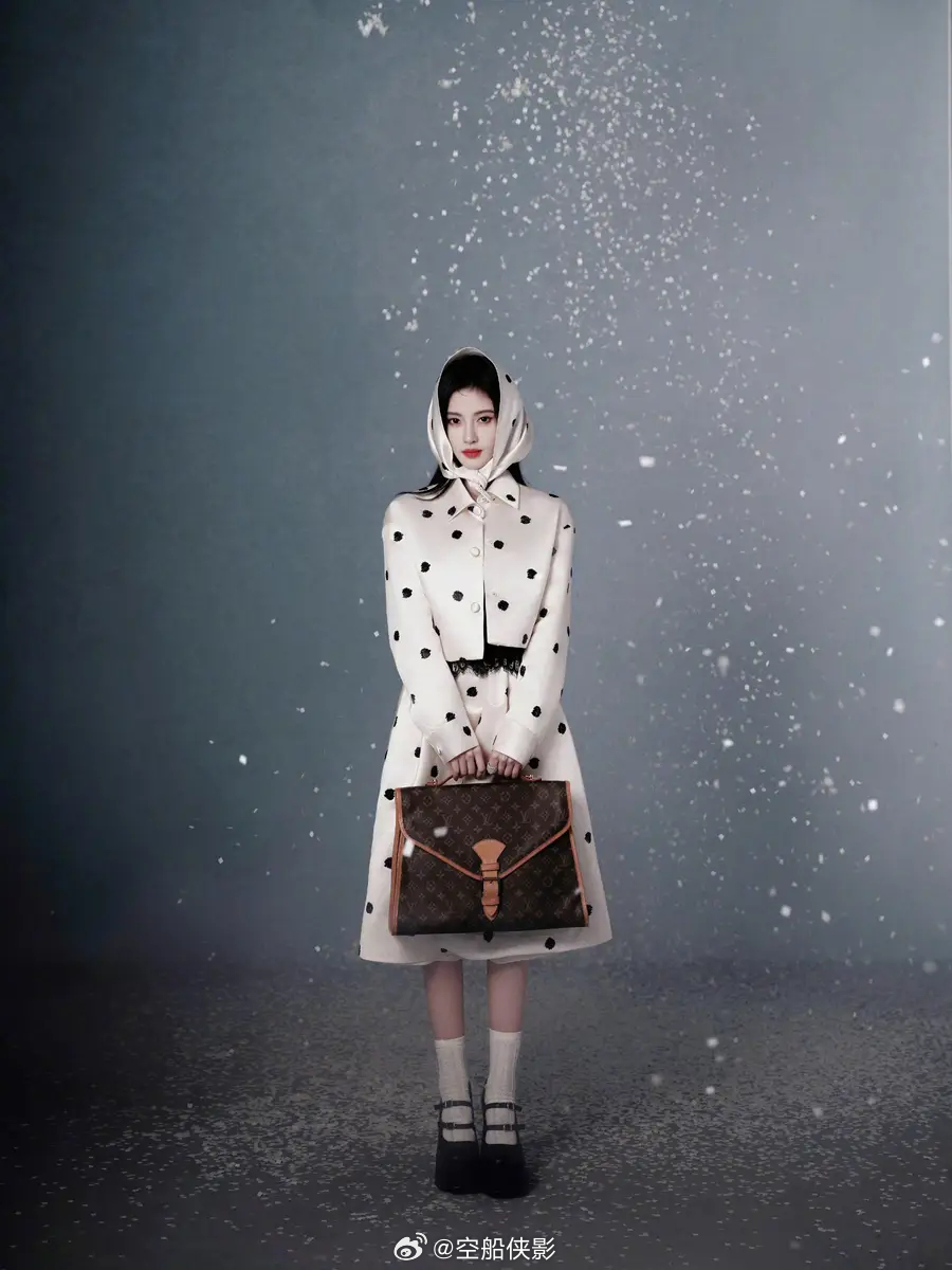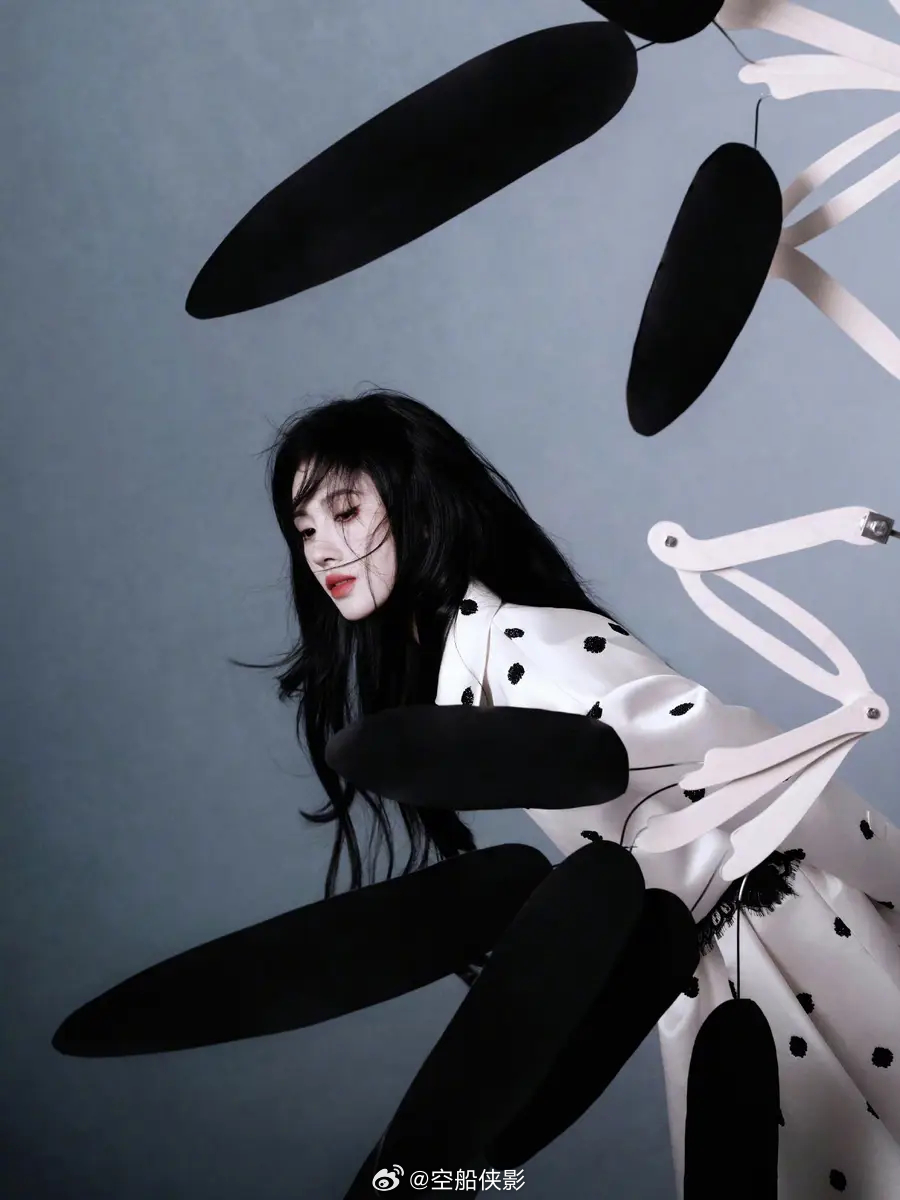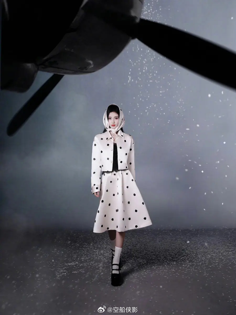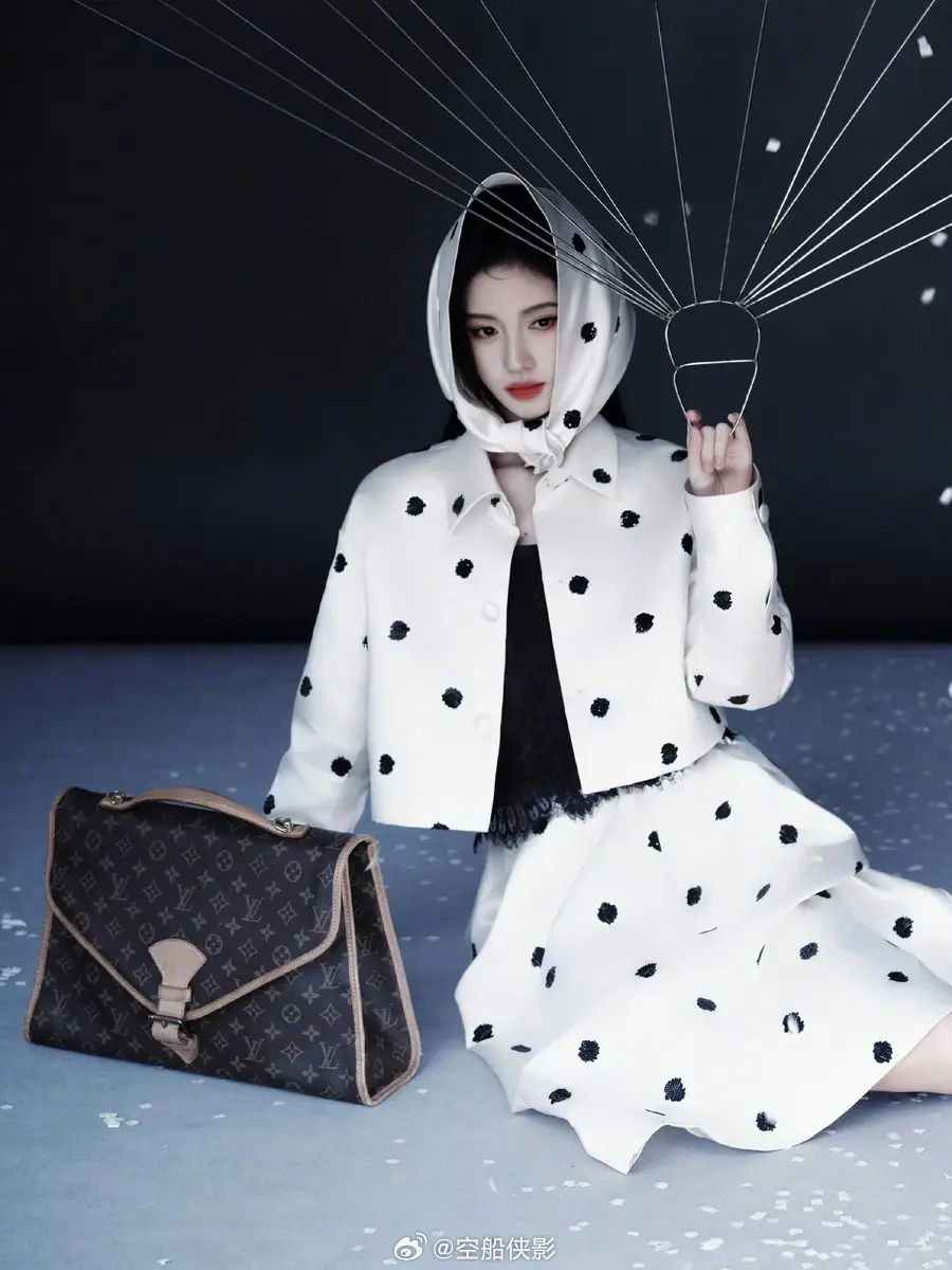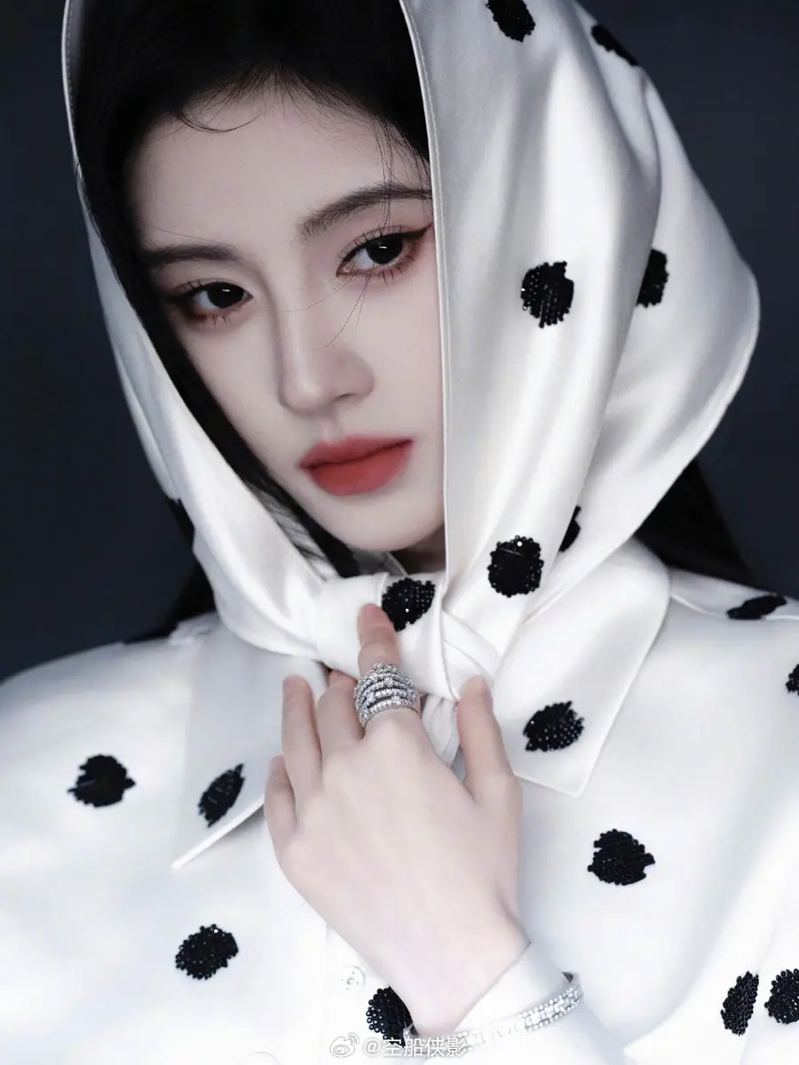 一组鞠婧祎出席嘉人盛典的新造型美图释出,她身穿黑白珠片波点套装,戴着头巾,优雅迷