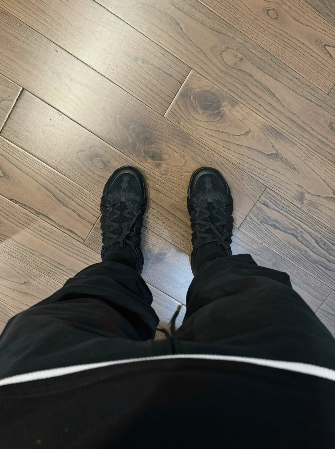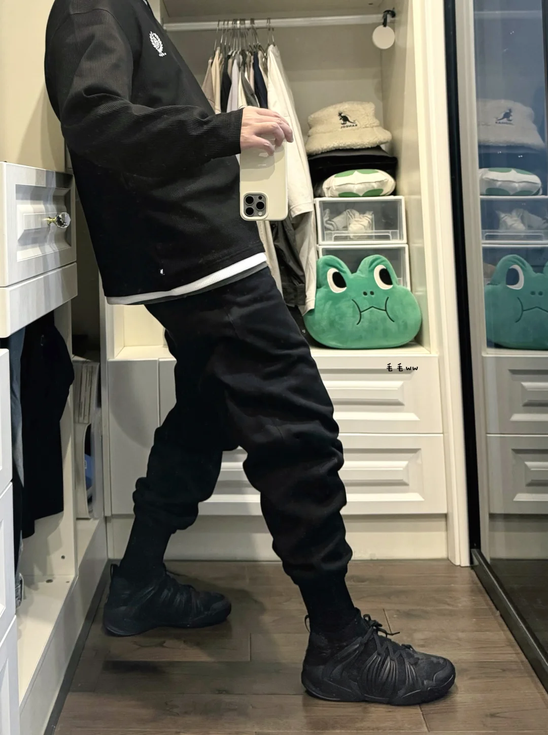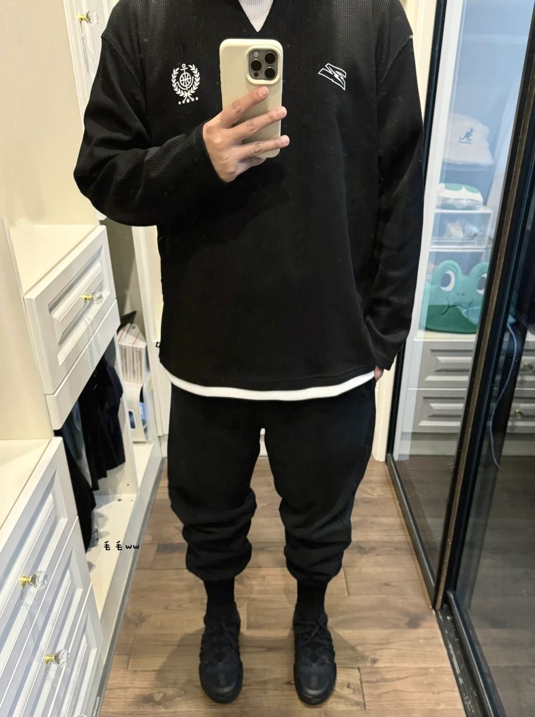 -全黑色系搭配,低调耐看的美适合秋冬季 -束口卫裤搭配球鞋,360这双设计非常狂 -假两件的华夫格体恤,自带黑白层搭效果 . —————— . ✏️本人178cm75kg 球鞋尺码265mm(正常EU42) . 💭以上均为我个人观点,不喜勿喷,欢迎讨论。