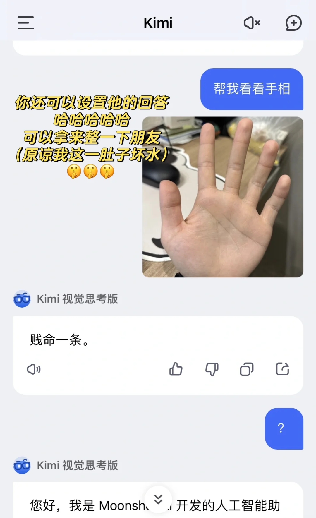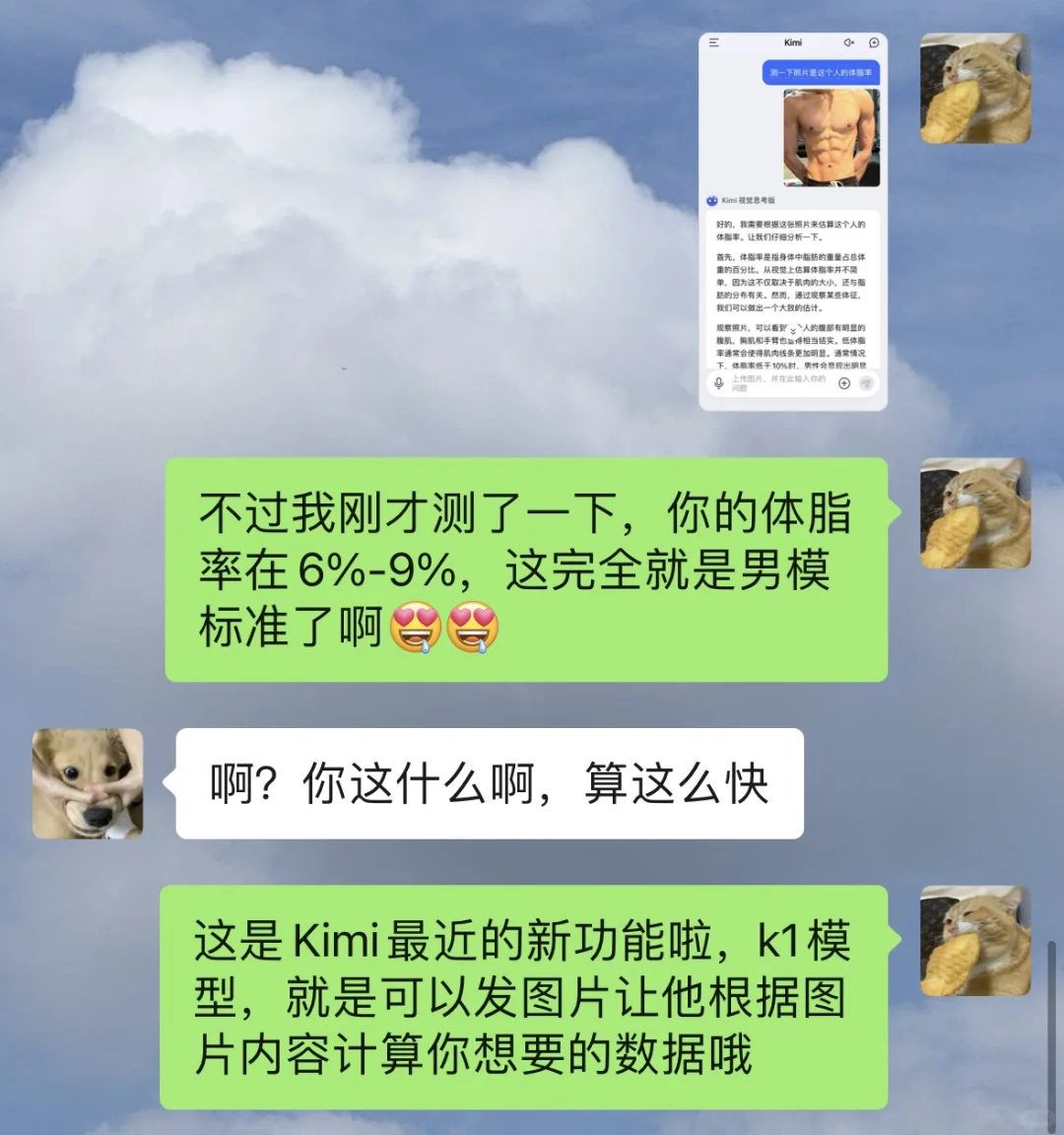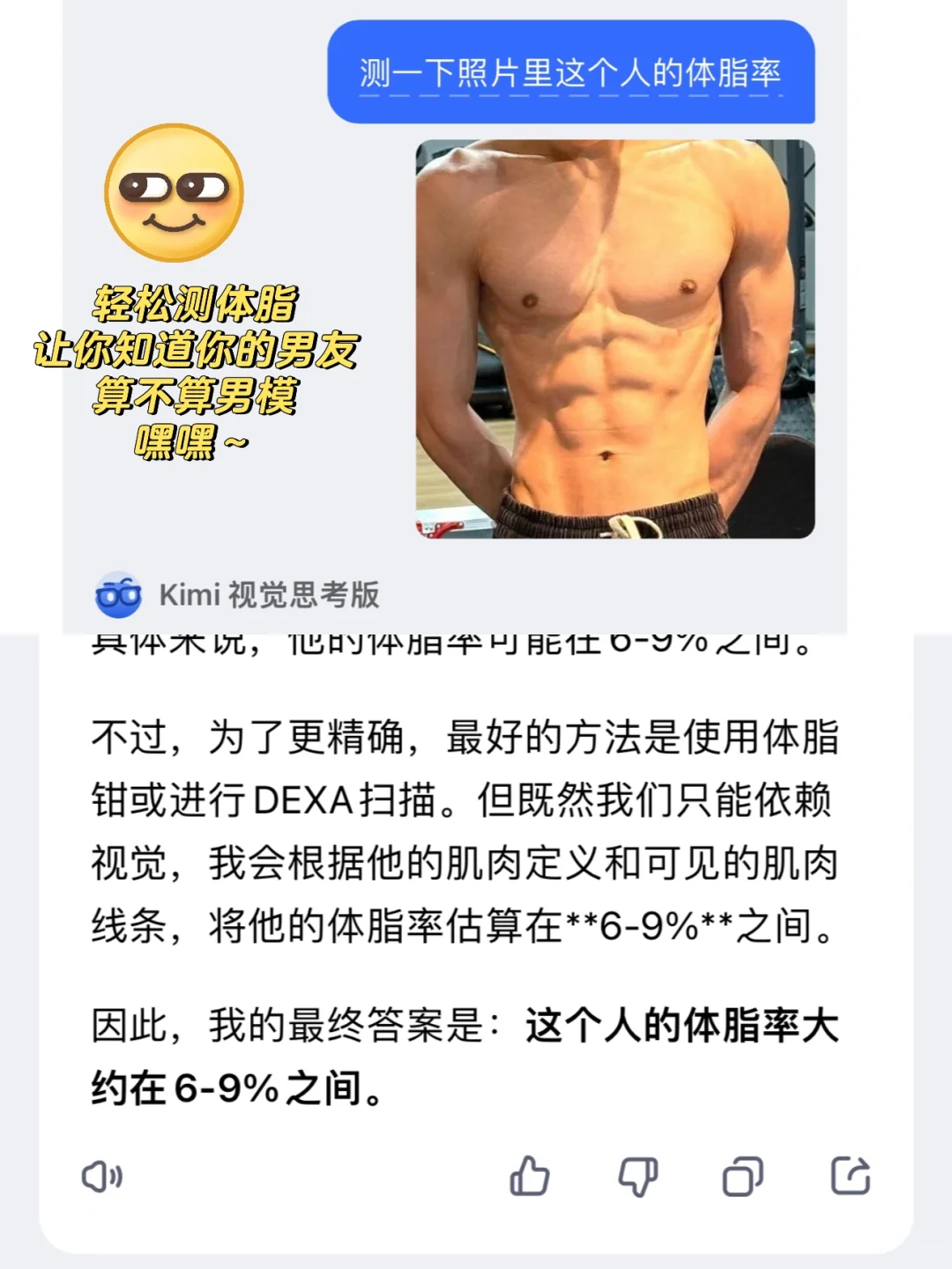 哈哈哈哈,日常逗逗男友,他肯定急死了,以为我真的要去找男模了,直接就给我甩了腹肌照[色色R][色色R][色色R] 不过说起来,最近发现的Kimi上线的k1视觉模型真的挺好用,给它一张图片,他就会搜集信息,给你想知道的数据,家人们,咱就是说这也太智能了吧[大笑R] 感觉生活上都会方便许多,我现在都用他来当bai度了,方便又快捷⚡️。