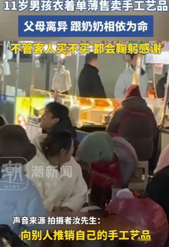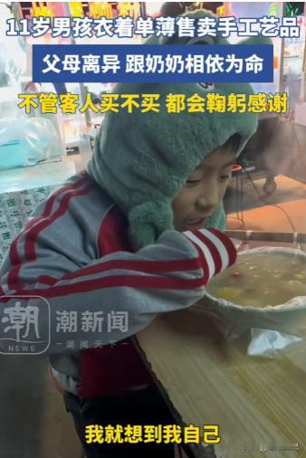看哭了!安徽,11岁男孩父母离异,跟着奶奶相依为命,为了维持生计,衣着单薄的在街头推销自己的手工艺品,不管客人买不买都会鞠躬感谢,男子看到孩子被冻的瑟瑟发抖,不禁想到了自己的童年,随后男子的一系列举动,感动了无数人! 来源:阿灿、潮新闻 世上还是好人多啊,这年头有多少人生活在水深火热中却默默无闻,然而再人人都追逐利益的如今,偶尔遇到善良的人对需要帮助的人伸出援手,这样的故事总是令人感动。 这事儿也让我们感受到了人心里的善与美,也让我们坚信,只要每个人都能贡献出一点爱,咱们这个世界就能变得更加温馨美好。 小方虽然年幼,但他身上展现出的坚强、懂事和乐观,让人们看到了希望,小方在各路好心的帮助下,肯定能挺过难关,健健康康地长大。 他未来的路还很长,我们期待着他能够用自己的努力,创造属于自己的美好未来,这个故事的传播,也引发了人们对社会弱势群体的关注。 如何更好地保障他们的权益,如何为他们提供更多的帮助和支持,成为了一个值得我们深思的问题。 安徽冬天那股风真刺骨,吹在脸上跟刀割似的,在这热闹的小吃摊区,一个瘦弱的身形特别显眼,他叫小方今年十一岁。 小方的故事,要从他父母的离异说起。小方那颗稚嫩的心,被这场成人世界的动荡给弄乱了。父母分开后小方跟着奶奶生活。 奶奶年纪大了身体也不好,微薄的退休金,为了不让奶奶操心,小方小小年纪就学会了懂事和担当。 白天小方和其他孩子一样,背着书包去上学,放学后他并没有像其他孩子一样嬉戏玩耍,而是匆匆赶回家,一头扎进小小的房间,开始制作手工艺品。 这对祖孙俩靠这些手工艺品挣钱养活自己,奶奶负责设计和一些基础的工序,小方则负责最后的组装和装饰。 虽然这些手工活并不复杂,但对于一个十一岁的孩子来说,仍然需要付出不少的时间和精力,夜色渐深,路灯亮起,小吃摊位旁渐渐热闹起来,小方带着自己亲手制作的手工艺品,来到这里摆摊。 他身上只穿了一件衣服,在冷风中看起来特别单薄,他冻得瑟瑟发抖,小手也冻得通红,他总是面带笑容,很礼貌地向过路的人介绍自己的作品。 您好看看我的手工艺品吧,都是我自己做的,小方的声音稚嫩而清脆,带着一丝恳求,无论客人买不买小方都会深深地鞠上一躬,以表达自己的感谢。 那股礼貌和懂事劲儿,让好多过路的人都忍不住多看了两眼,十九号晚上汝先生像往常一样,来小吃街觅食。 他看见了一个穿着很少、直打哆嗦的小男孩,大家裹着厚实的羽绒服,头戴帽子,脖子上挂着围巾,手上戴着手套,把自己捂得暖暖的。 只有小方孤零零地站在寒风中,双手紧紧地攥着自己制作的手工艺品,汝先生被小方的坚强和懂事深深地触动了。 他走上前去,和小方聊了起来,小朋友你这么冷的天,怎么不多穿点衣服?汝先生关切地问道,小方腼腆地笑了笑说:没事我不冷。 汝先生又问:你父母呢怎么让你一个人出来摆摊?小方有点低声地讲,他现在跟奶奶一起住,因为爸妈离婚了,为了减轻奶奶的负担,我出来卖点东西。 汝先生听完小方的故事,心里五味杂陈,他想起了自己小时候,那时也是和爷爷奶奶一起长大,和小方的童年有不少相似点,汝先生决定帮帮这个可怜的孩子。 他从口袋里掏出一些钱,买下了小方的一个手工艺品,小朋友你这些手工艺品做得真不错,我家里正好缺一个这样的摆件,多少钱?汝先生问道,不贵不贵。小方连忙摆手,看着给就行。 老兄今天钓了不少大鱼,不打算给钱,倒想用这些鱼跟你换点手作货,小方毫不犹豫地答应了,汝先生又看到小方冻得瑟瑟发抖的样子,便带着他去附近的小店,给他买了一杯热饮。 在小方喝热饮的时候,汝先生悄悄地用手机扫了一百块钱给小方,小朋友这钱你拿着,买点吃的,汝先生说道,小方连忙拒绝:不用了谢谢您。 汝先生坚持把钱塞给小方:拿着吧就当是我的一点心意,翌日汝先生按照约定,拿着他钓到的大鱼去找小方。 他不仅把鱼送给了小方,还带着小方去了一家服装店,给他买了一身厚实的冬衣。 汝先生本来想用鱼和店主换衣服,但店主被汝先生的善举感动了,不仅同意了交换,还额外送给小方一条裤子和一件内搭。 汝先生把和小方之间发生的故事发到了网上,很快就引起了广泛的关注,很多网友都被小方的懂事和汝先生的善举感动了。 不少网友表示他们愿意出一份力,帮小方一家度过难关,也有人联系到小方所在的学校,希望能够为小方提供一些学习上的帮助。 小吃街的服装店老板看到网上的消息后,也主动联系了小方,表示愿意为小方提供一些力所能及的帮助,小方的经历就像一股温暖的暖流,在寒冷的冬日给很多人带来了温馨。 希望未来会有更多的人伸出援手,帮助那些需要帮助的人,让他们感受到社会的温暖和关爱,我们齐心协力,确保每个孩子都能度过一个温馨的冬季,迎接充满希望的明天。