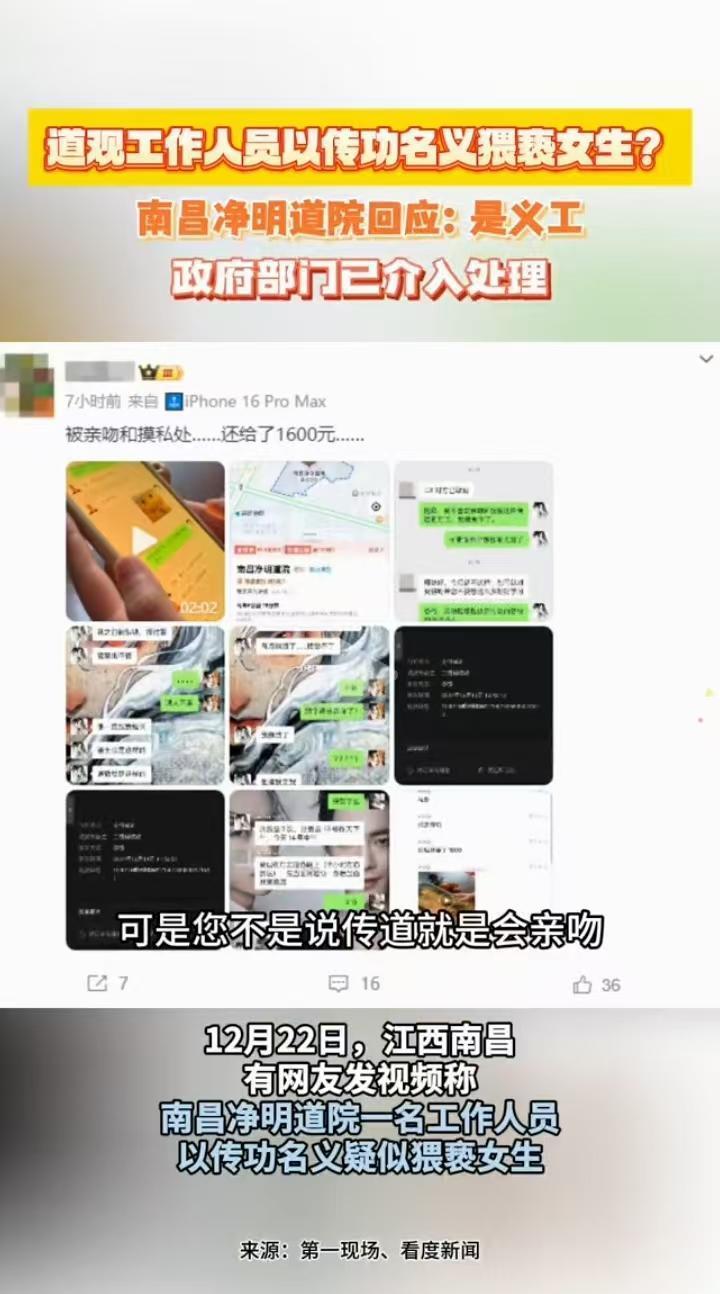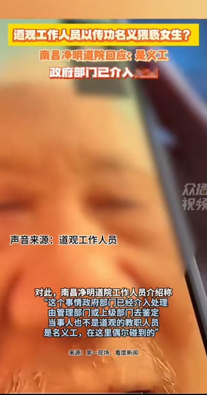 有点辣眼睛!一女生爆料,南昌某道观工作人员以传功的名义对其实施猥亵,又亲又摸,并且道歉的视频流出,引发网友热议。该道观工作人员回应了。 众播视频报道,近日江西南昌一女生爆料说,当地某道观有位老爷爷亲她摸她,还给了她1600元钱。 事后,该女生越想越不对劲,就联系了那位道观的老爷爷。 他认识到自己的错误,诚恳地给女生道歉了。 女生:“您不是说传道就是会亲吻会抚摸吗?您不是说这是传功的方式吗?” 工作人员:“爷爷做得不对,还望谅解。” 该道观的工作人员回应,其实涉事的“老爷爷”是道观的义工,目前相关部门已经介入处理。 都市生活和工作压力较大,或者对传统文化感兴趣,有的人会去寺庙或道观体验修行。 或者是自己急功近利,或者是被所谓的“师傅”引导,容易发生被骗财骗色。 南昌这位女生就是被“师傅”以传功的名义猥亵了。 一方面,我们应该对传统文化和相关修习给予必要的尊重,应该怀有一颗敬畏之心,另一方面,我们也不应该怀疑基本的生活常识和科学原理,就算我们对某些东西不能分辨真伪,也不该起贪心。 如果她不“贪”功,对方也就没机会给她“传功”了。 所谓的“传功”靠谱吗? 在被“传功”之前能不能征询一下其他道友或者道观其他工作人员的意见? 经过这件事,这位女生以后别再轻信上当了,网友们也应该以此为鉴。