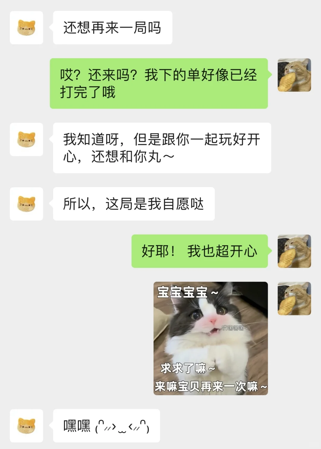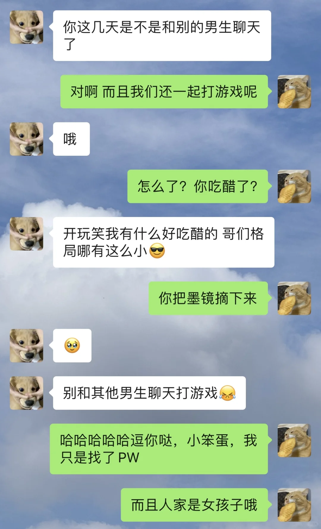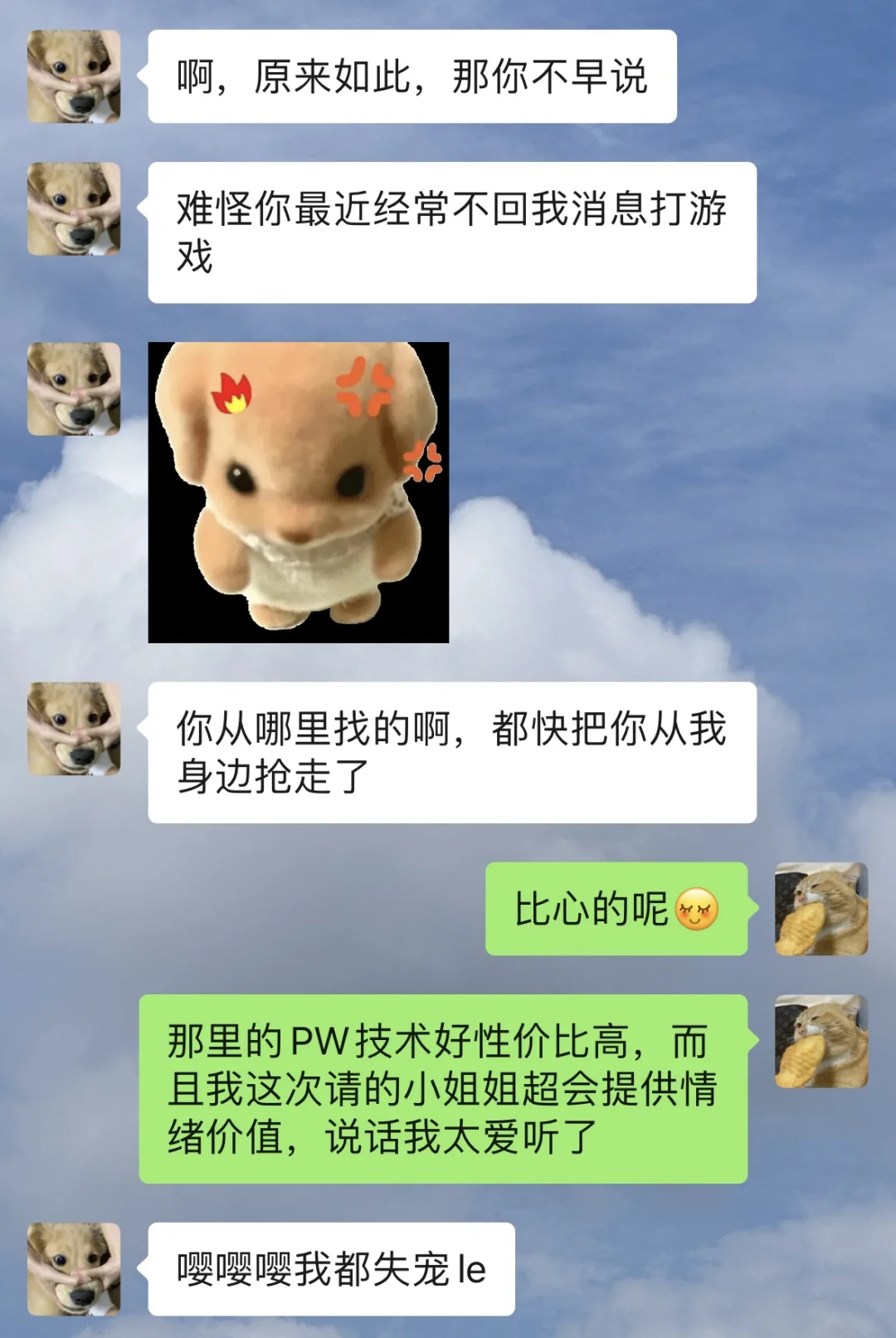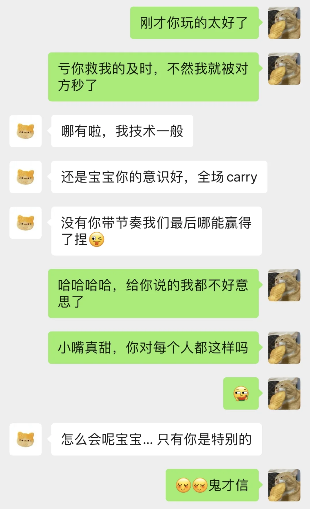 最喜欢看男朋友吃醋了,他酸酸的样子真的好可爱☺️ 喜欢~ 不过可惜的是他并不玩游戏,所以都是我自己玩,身边没有人开黑玩起来真的木有意思啊😑😑😑 正好听朋友说可以去比心找PW,那上面体验感稍微好一些~ 果然,这次的小姐姐完完全全就是我的菜,技术好声音甜,还超会说话,搞得我都快喜欢上她了🫢(开玩笑) 真不错呀,下次还要点名要她(霸道)