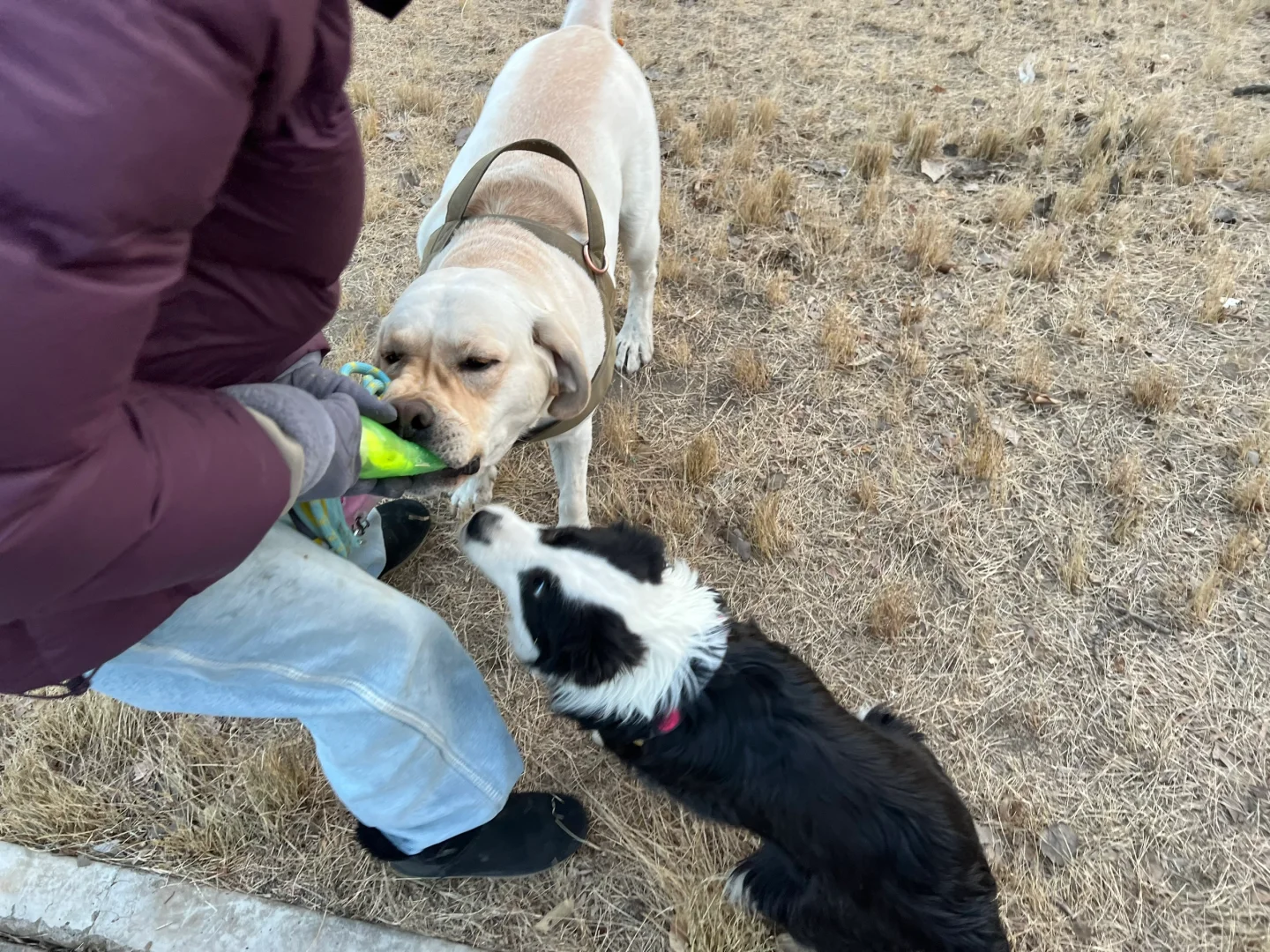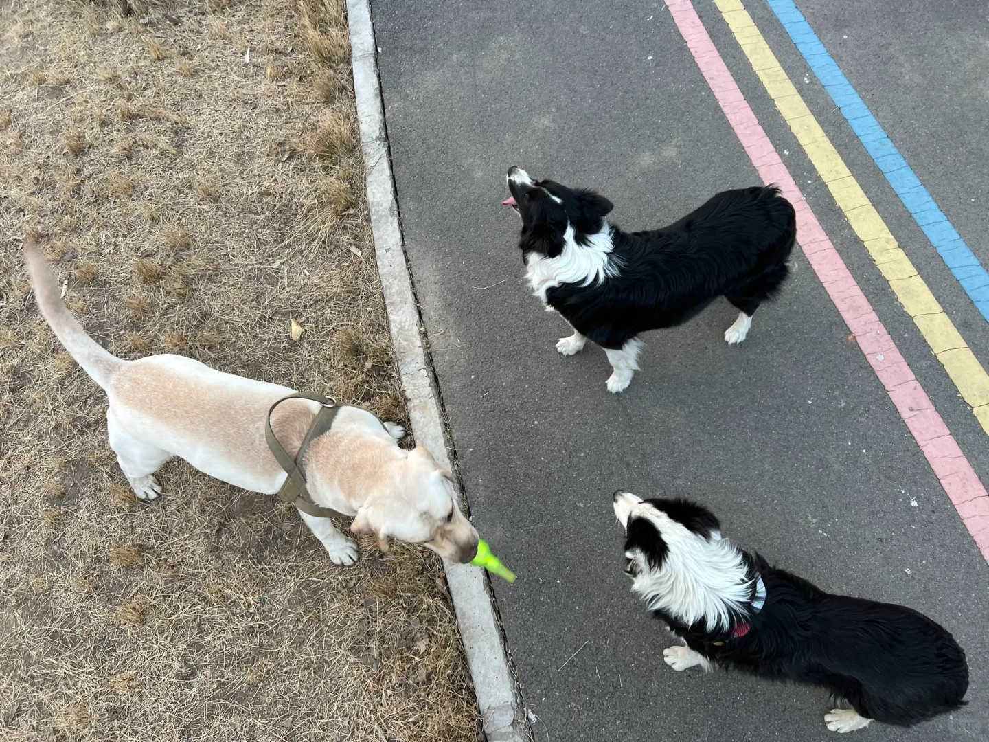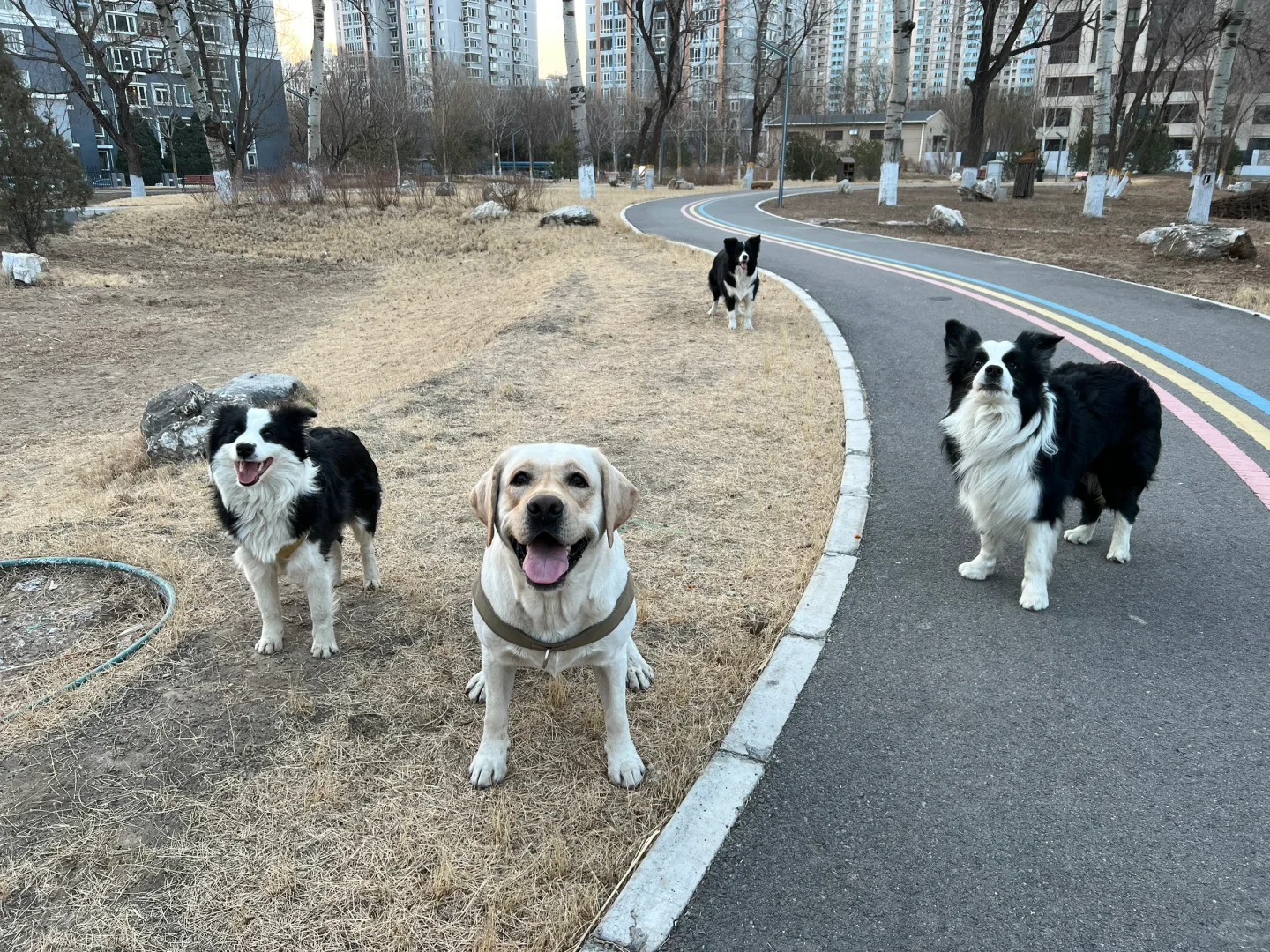 出去溜,托游萍随行还算可以,感觉出之前有点训练,在无人的、四周都有墙的小公园把绳子解开自己跑,能和其它朋狗们玩的很好,别的狗也不欺负它,我叫一声能回来,乖乖坐在边上,很听话