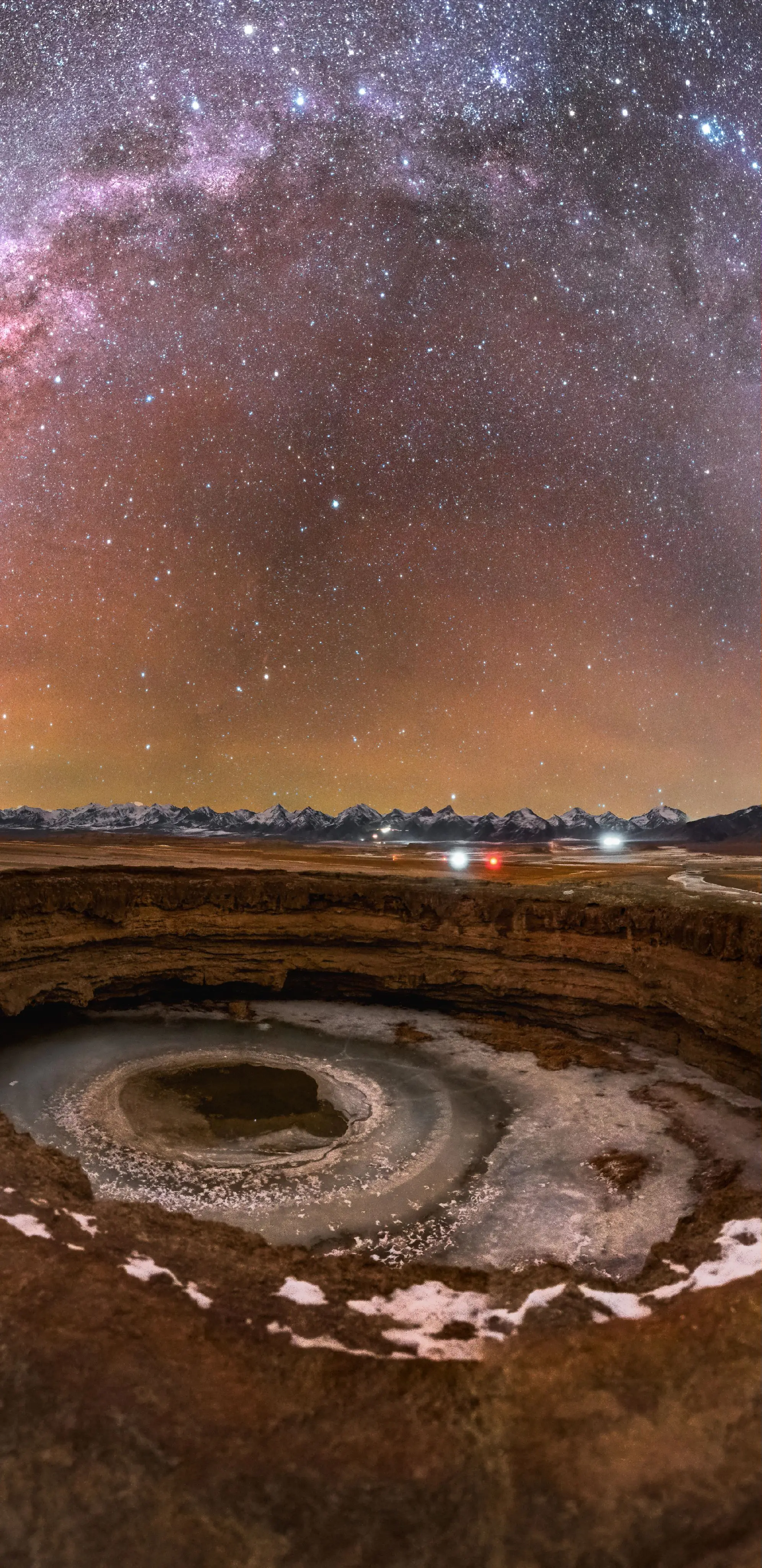帕米尔之眼上的银河拱桥。沿着白沙湖北岸的木吉边防公路两个小时不到的车程就可以到达新疆境内最高的火山口群--木吉火山口。在这里能看到十多个大大小小的火山口和远处屹立的十八罗汉峰。 在冬季的帕米尔高原,入夜就可以看见猎户座从地平线缓缓升起。冰封的火山口宛如帕米尔之眼凝视着整个宇宙。 导航:阿克陶县木吉乡火山 设备:A7R3 14mm 参数:f1.8 20s iso6400