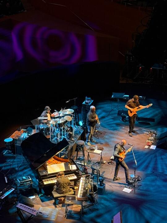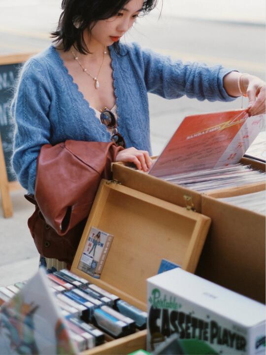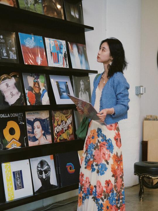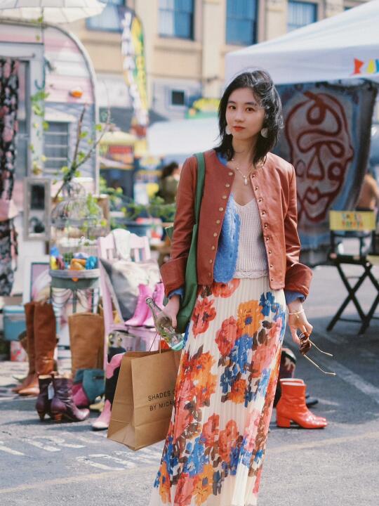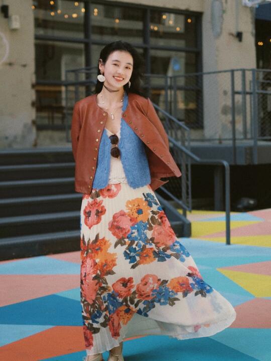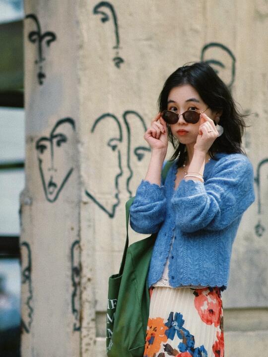 · 因为听了米周《Why for Jazz》里 关于Herbie Hancock的一期,随手一查, 发现84岁的爵士大神在洛杉矶有场, 订了last minute ticket,继续快闪快回。 - 这段时间的春天超磨人, 雨雪(你敢给我下一个试试[生气R])霏霏, 无比依赖当时写第一期《女友》定的 “开衫+外套”叠搭公式。 - “开衫一定是属于春天的。” ——这话是开衫说的; 但只要颜色够美,明媚即正义。 · - 喜欢这样温柔的雾蓝色搭配花里胡哨百褶裙, 又因为“衫之蓝”与“裙之蓝”相谈甚欢, 热闹里升起嘁嘁喳喳的小愉悦。 原本这样就够了,但天气冷, 搭了之前出镜过的砖红色皮夹克, 感觉无意中破解了—— 《论圆领外套里究竟搭什么自然好看不违和》 - 真想把各种颜色在每个出门的日子都穿遍, 这样,你会在春天看见最明媚的我, 喜欢穿花花衣服“招摇过市”的我, 温柔、酷飒、文艺。 “文艺”是个很好的词, 某种程度上,在它50%污名化的今天, 文艺本身就代表了一种选择。 - 84岁的Herbie Hancock在场上抱着 电子键盘和吉他手面对面蹦迪, 从钢琴到电钢琴各种solo燃炸全场。 结束曲《Chameleon》在平常听太电子、太合成, 但现场又仿佛是怀旧年代点燃的一小片绚烂花火。 · 不过《Watermelon Man》绝对上脑, 不信大家看完这篇去听听[斜眼R] · 🐈 ootd info 开衫+皮衣+裙+耳环+墨镜+鞋|Sezane ·
