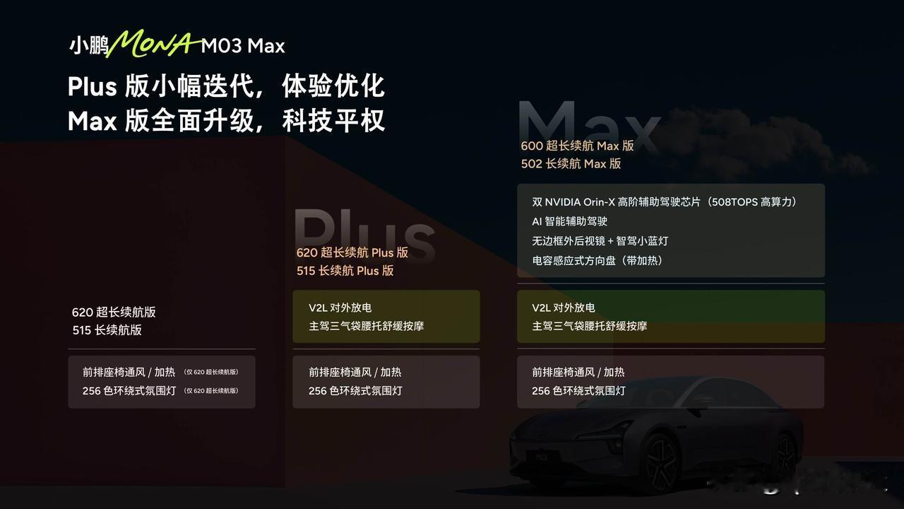 小鹏MONA M03 Max全球首次将高阶智能辅助驾驶带入2万美元级别! 小鹏MONA M03 502 长续航Max版:12.98万元 小鹏MONA M03 600 超长续航Max版:13.98万元 Max版相比去年公布时配置全面提升: ✅CLTC续航里程增加20km ✅升级无边框外后视镜(带AI智驾小蓝灯) ✅18寸多辐低风阻轮毂、19寸运动轮毂(选配) ✅主驾三气囊腰托舒缓按摩 ✅电容感应式方向盘(带加热功能) ✅V2L对外放电 小鹏MONA竟把高阶智驾打到12.98万元