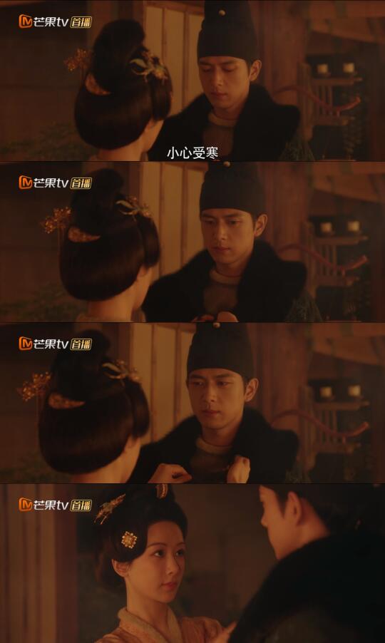 即将到来的“诉衷情”时刻,也带着花的香气。蒋长扬的心意,何惟芳已了然在心。蒋长扬嘴里说“我是假夫君”,每一件“顺手为之”的小事,都藏着没有宣之于口的珍重。帮牡丹点灯祭典,还带回灯花,说庇佑她新的一年顺心顺意,他怕轻慢,怕辜负,甘愿以假护真,何惟芳焉能不懂?指尖、指骨、虎口的比喻,倒更像成竹在胸的试探,蒋君的脸红即是答案。而给蒋长扬披上厚厚的衣服,说外面冷,别受寒,则是来自娘子的嘱咐,这衣袖交错仿佛是在说,天凉加衣,君心我知。