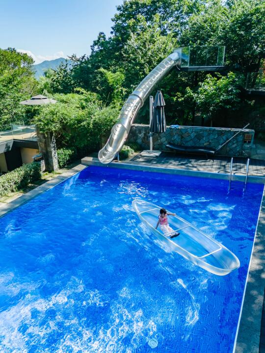 ▪️悬崖无边泳池直面云海,下午3点后树影遮阴🌳,自带星空滑梯俯冲入水,玩了还要玩