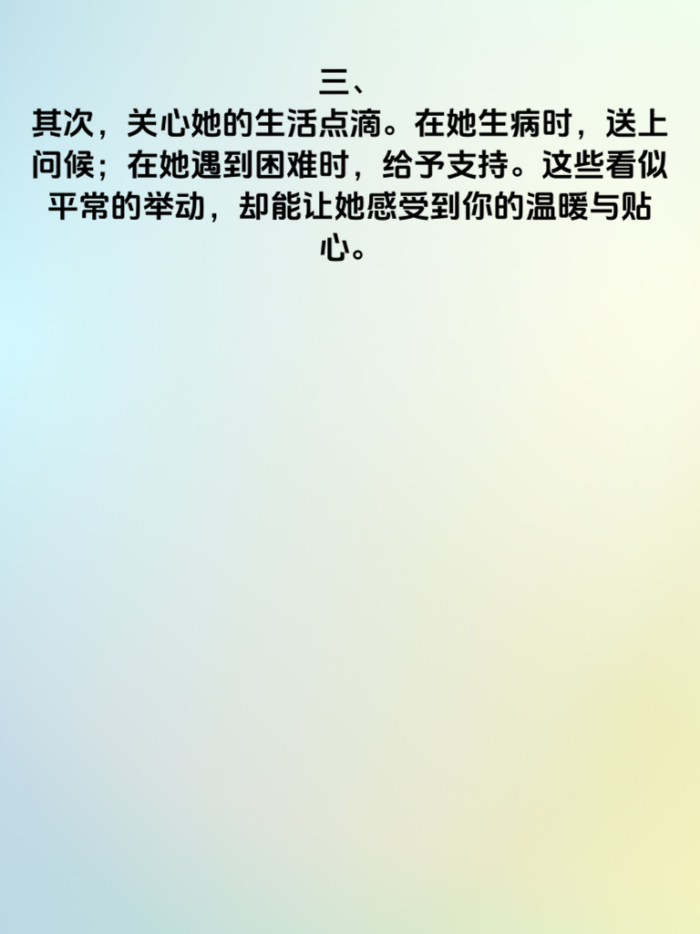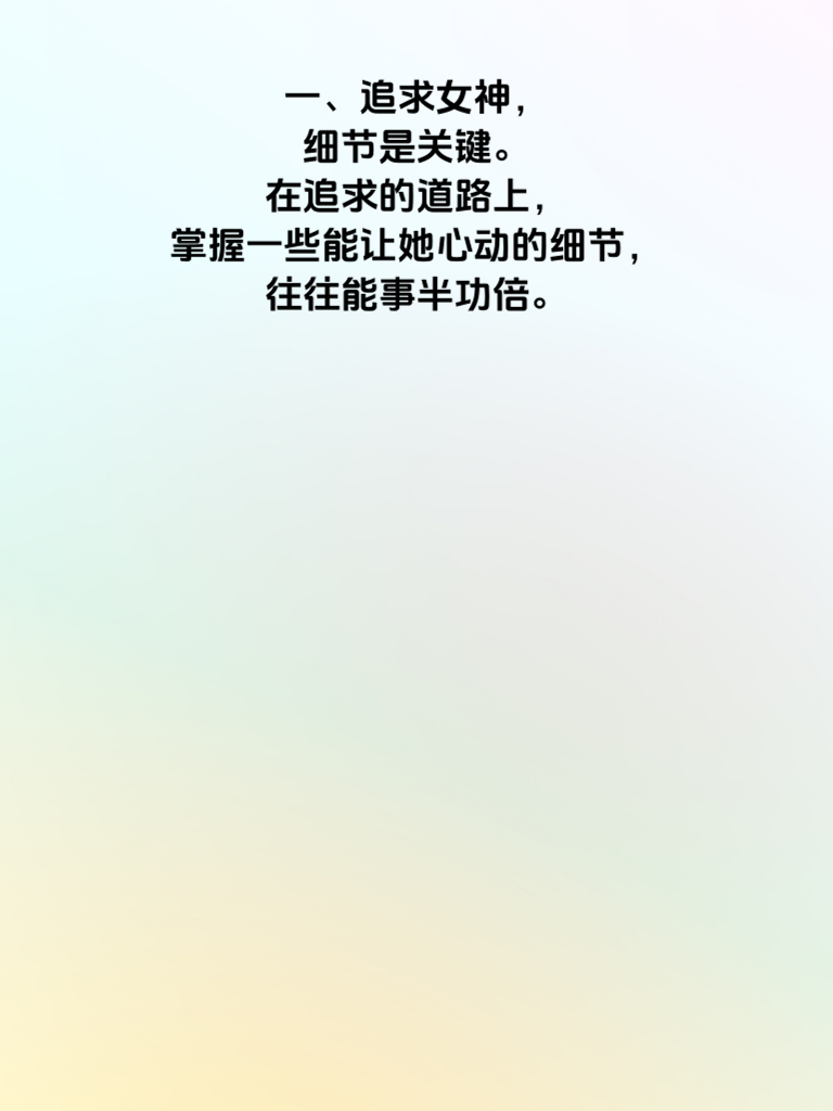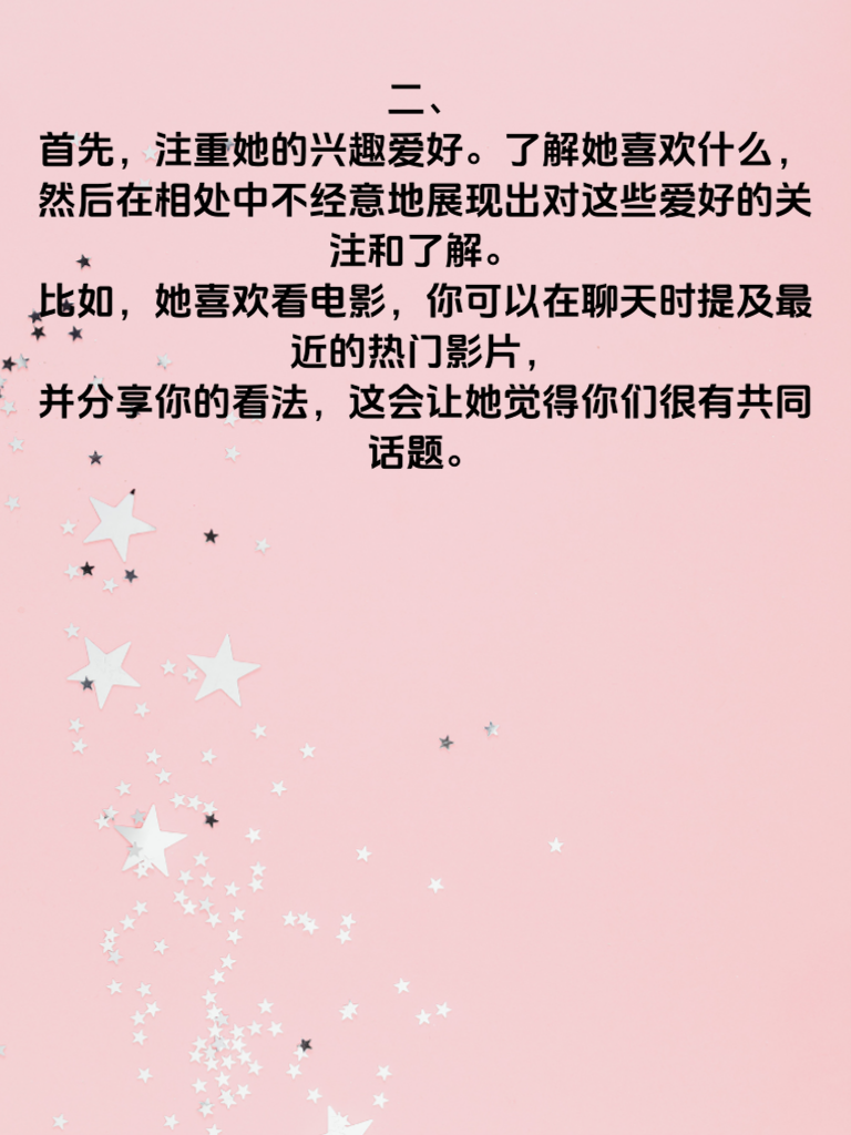 一、追求女神,细节是关键。在追求的道路上,掌握一些能让她心动的细节,往往能事半功倍。 二、首先,注重她的兴趣爱好。了解她喜欢什么,然后在相处中不经意地展现出对这些爱好的关注和了解。比如,她喜欢看电影,你可以在聊天时提及最近的热门影片,并分享你的看法,这会让她觉得你们很有共同话题。 三、其次,关心她的生活点滴。在她生病时送上问候,在她遇到困难时给予支持。这些看似平常的举动,却能让她感受到你的温暖与贴心。 四、再者,约会时的小细节也不能忽视。准时到达约会地点,为她拉椅子,用餐时注意礼貌。这些小小的举动,都能展现出你的绅士风度,让她对你好感倍增。 五、最后,真诚是最重要的细节。用真心去对待她,让她感受到你的爱意与诚意。只要做到这些细节,相信你追求女神的道路会更加顺利,让她为你心动。
