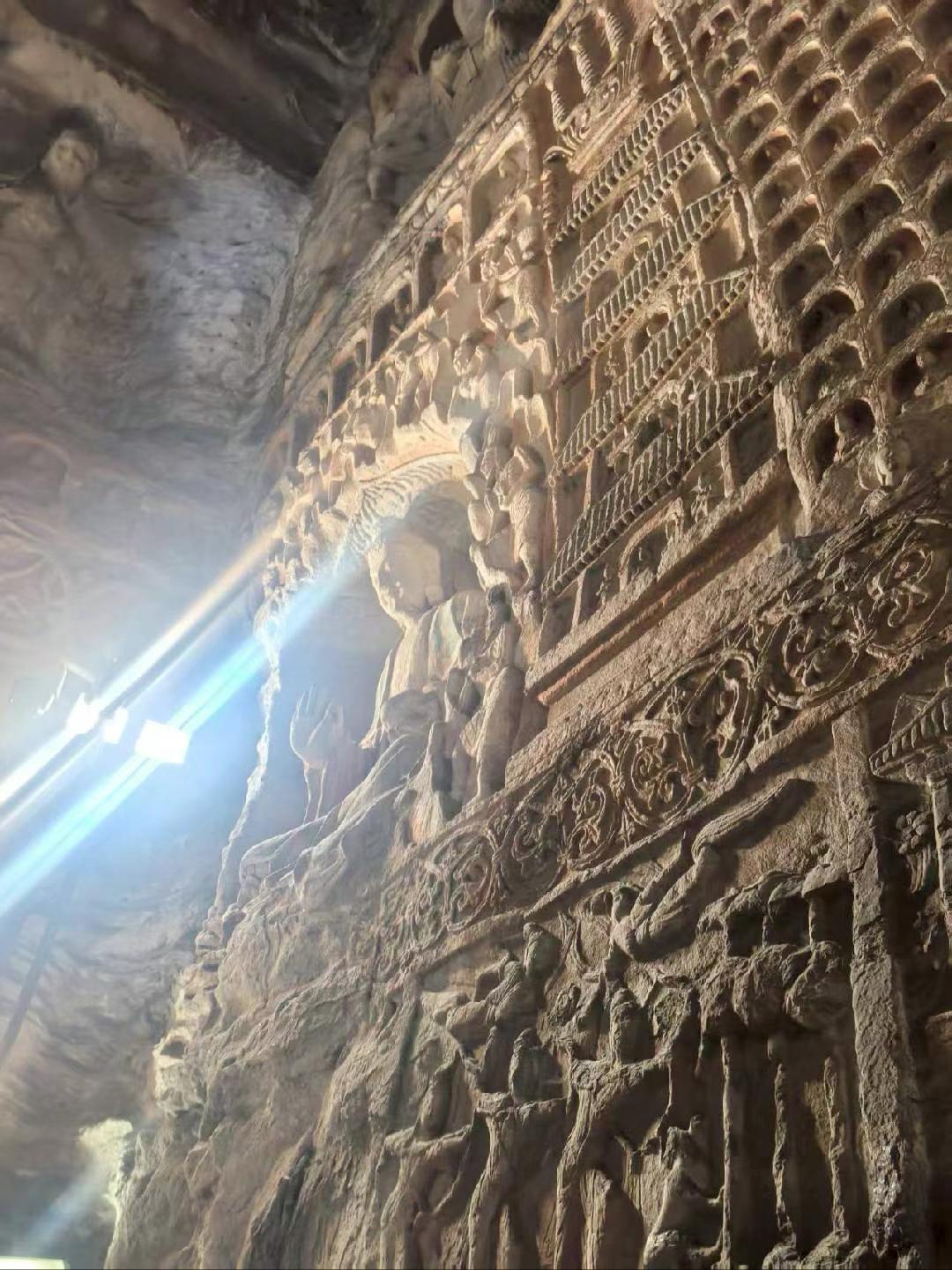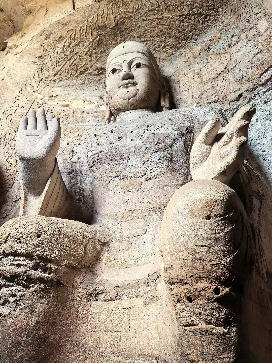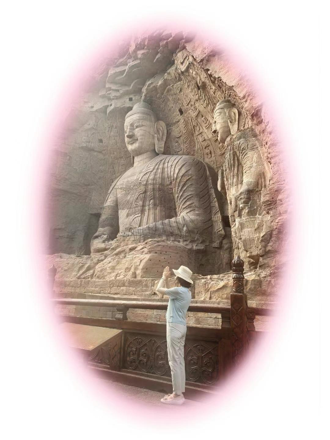 云冈石窟在北魏时期所建,充分展露皇室的霸气。它雕刻手法多样有的粗犷豪放;有的线条简洁有力,这些都反映了当时游牧民族的豪迈气息;(从1—5图中可以看出)也有的笔力细腻,仪态万方,鼻梁高挺,眼睛深邃,堪称东方维纳斯。图六有代表性。站在佛祖下感叹岁月不语,唯石能言,惊鸿一瞥, 千年一瞬,但行好事,所念皆如我愿。