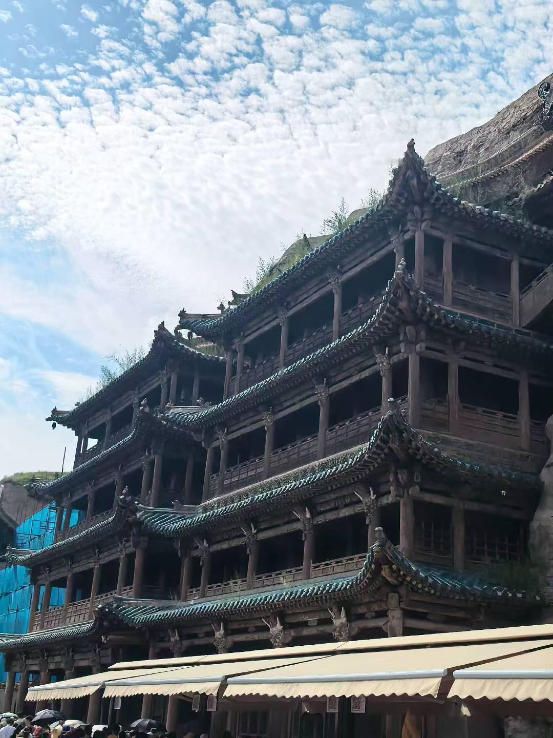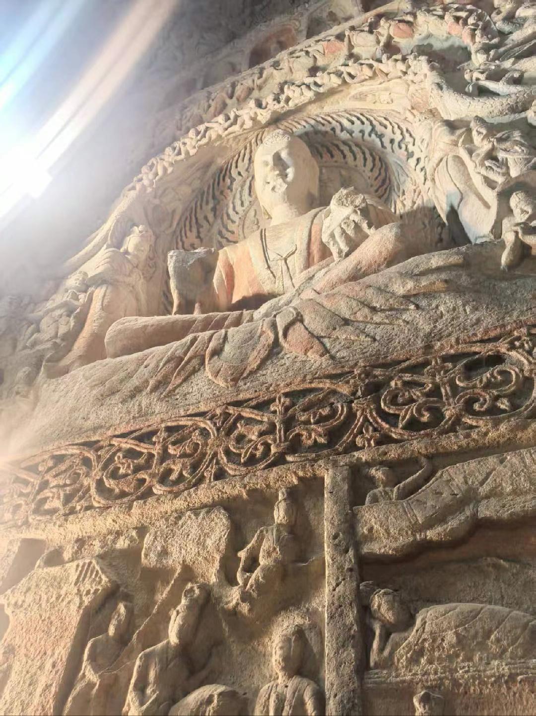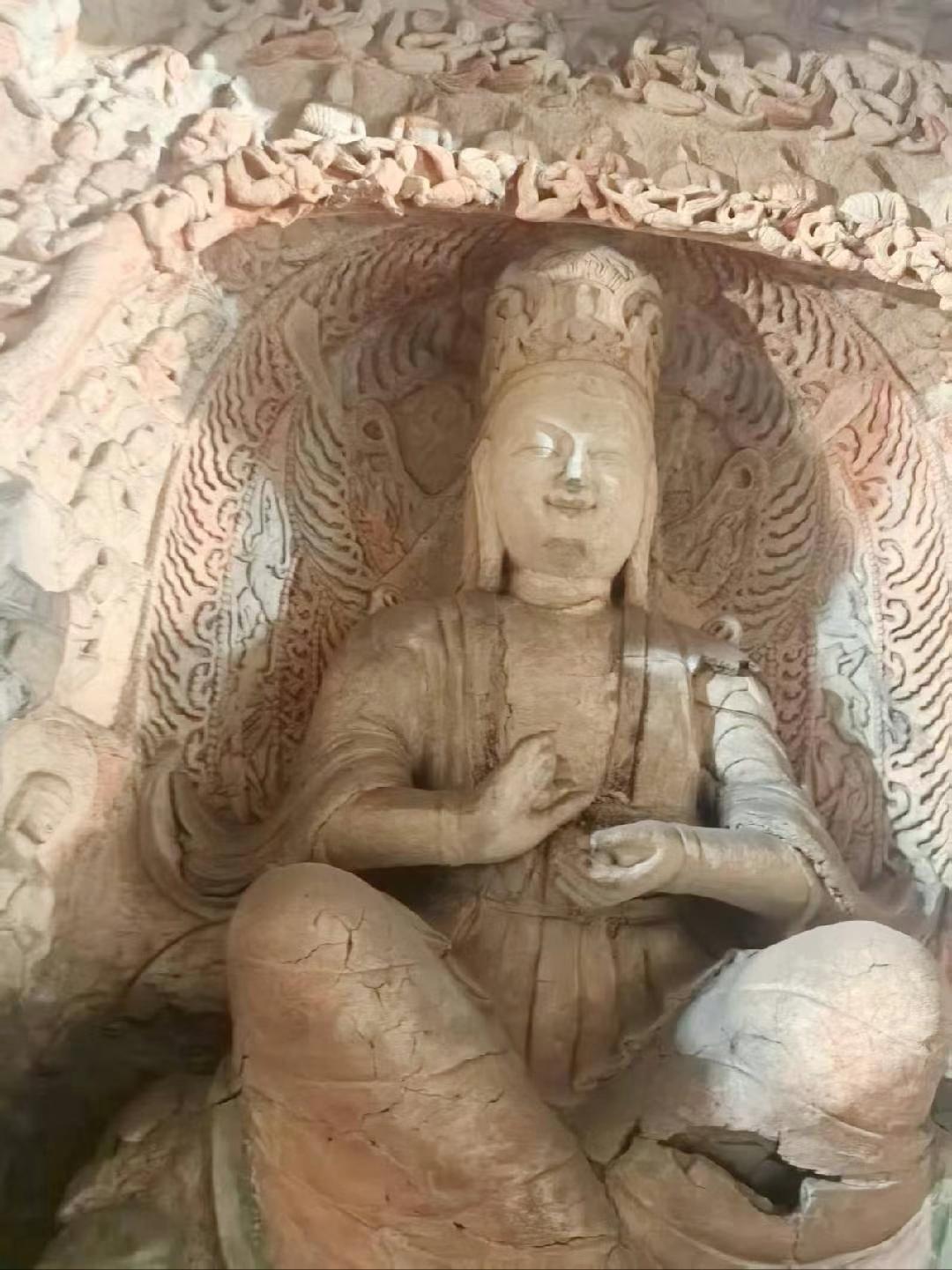 云冈石窟在北魏时期所建,充分展露皇室的霸气。它雕刻手法多样有的粗犷豪放;有的线条简洁有力,这些都反映了当时游牧民族的豪迈气息;(从1—5图中可以看出)也有的笔力细腻,仪态万方,鼻梁高挺,眼睛深邃,堪称东方维纳斯。图六有代表性。站在佛祖下感叹岁月不语,唯石能言,惊鸿一瞥, 千年一瞬,但行好事,所念皆如我愿。