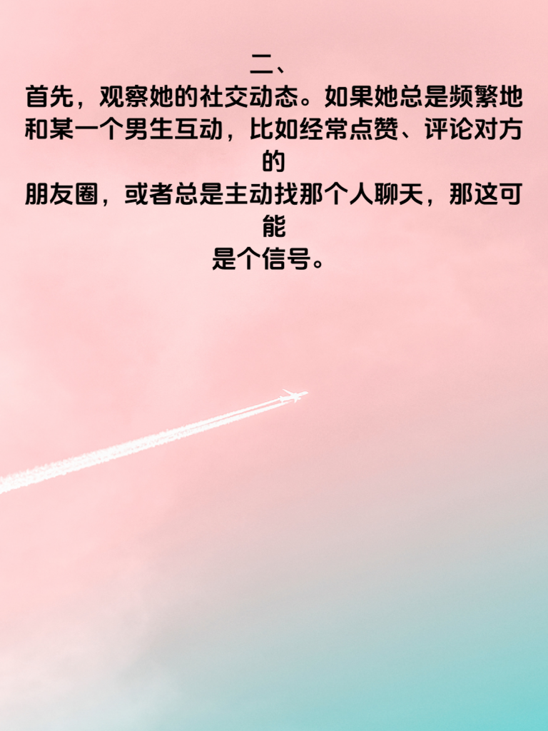 一、在爱情的世界里,很多男生都渴望知道心仪的女生是否心有所属。其实,有一些细节能透露出蛛丝马迹。 二、首先,观察她的社交动态。如果她总是频繁地和某一个男生互动,比如经常点赞、评论对方的朋友圈,或者总是主动找那个人聊天,那这可能是个信号。 三、再者,留意她的情绪变化。当提到某个特定男生时,她的眼神会放光,表情变得格外温柔,或者总是不自觉地微笑,那这个男生在她心中肯定不一般。 四、还有她的时间分配。如果她总是抽出大量时间去和某个人见面,或者为了和那个人相处而拒绝其他人的邀约,这也值得深思。 五、另外,她的私人空间也能说明问题。要是她对自己的手机格外在意,总是背着人接电话、回信息,很可能心里藏着一个特别的人。 六、不过,这些都只是参考。感情的事很复杂,直接沟通才是最好的方式。找个合适的时机,真诚地问问她的心意,别让猜测耽误了彼此的缘分。